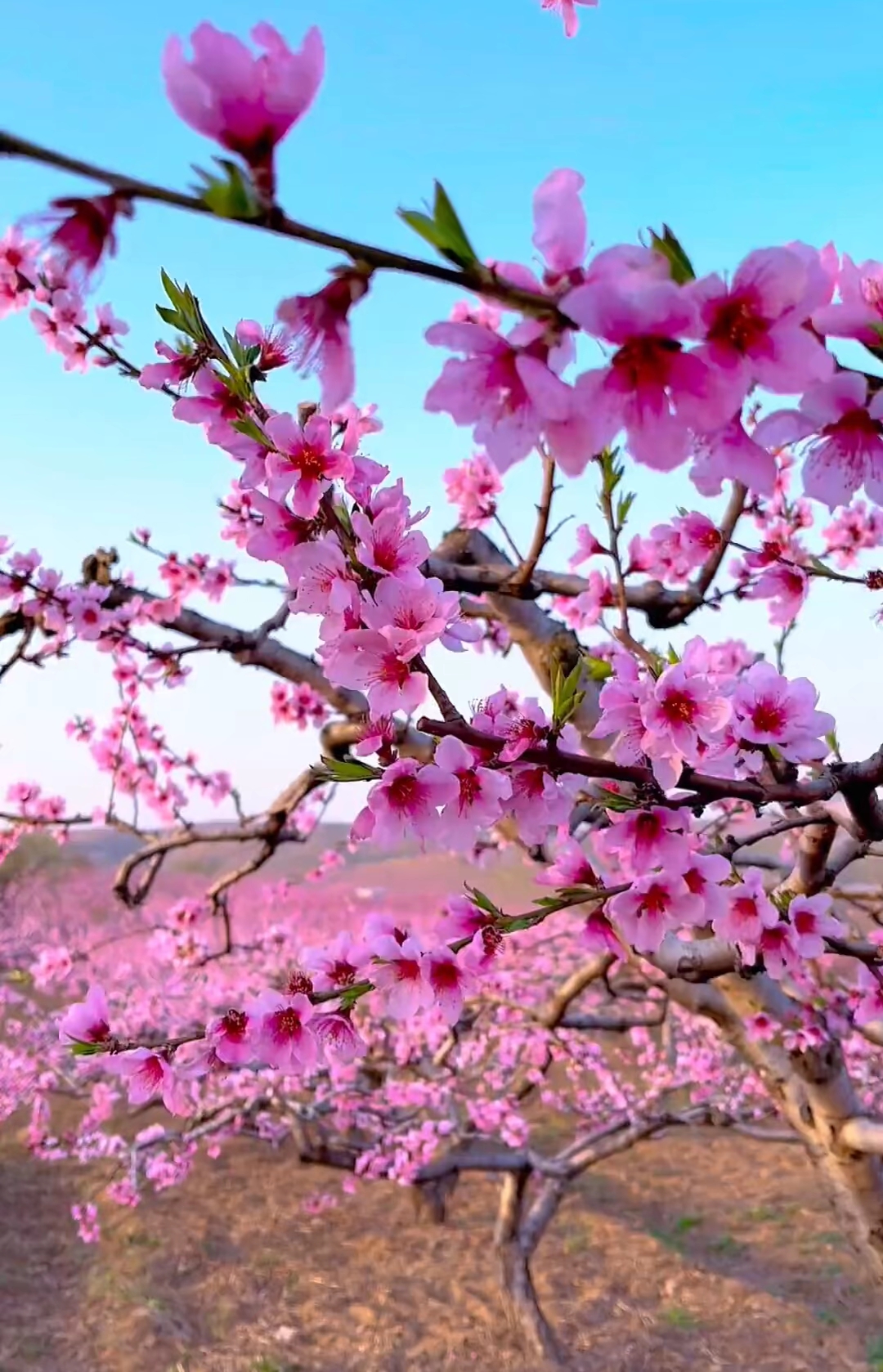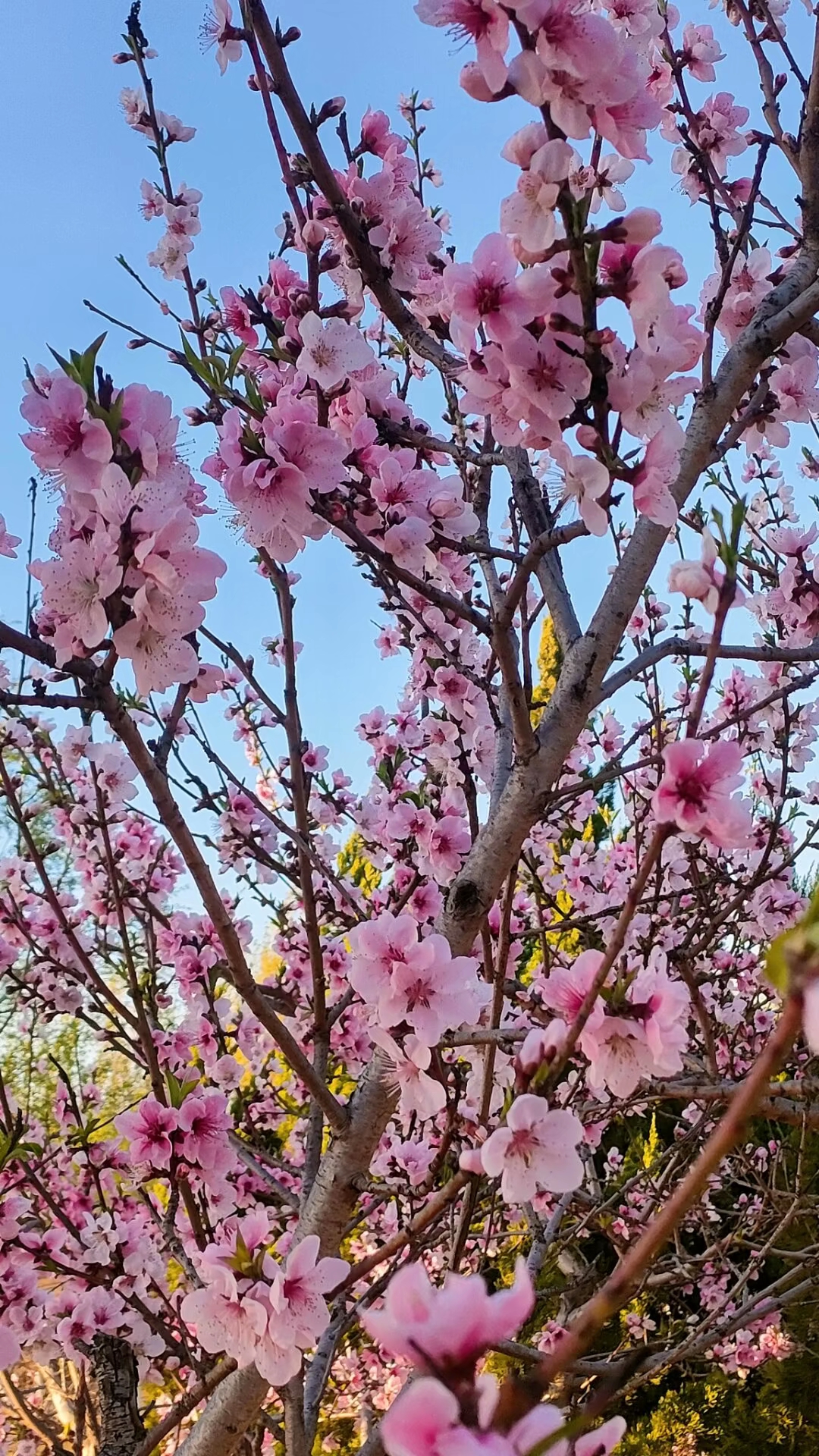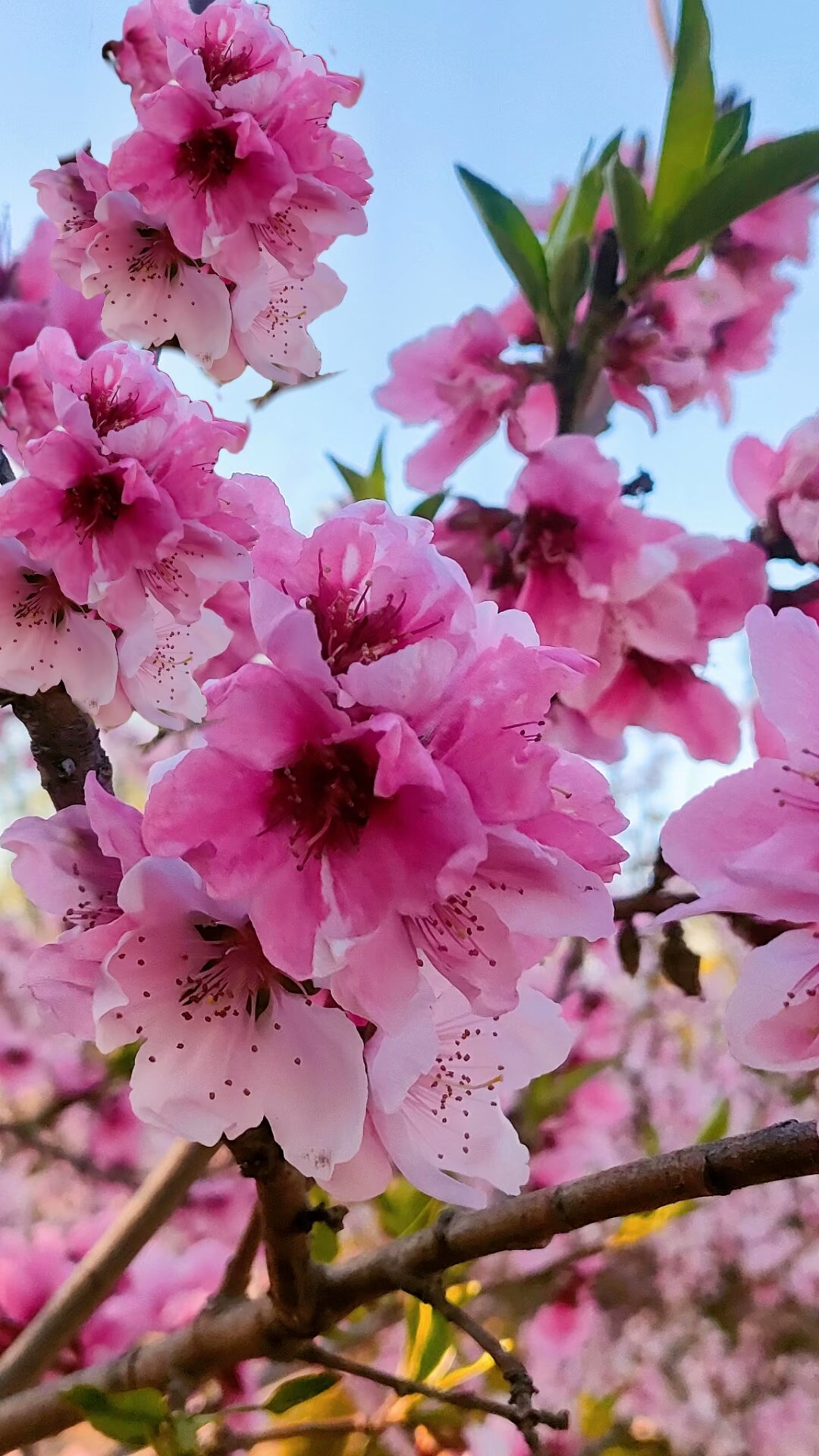 粉色的碧桃鲜艳动人,在蓝天下绽放着春天的气息。阳光洒下,花瓣轻轻摇曳,仿佛在为这个世界歌唱。