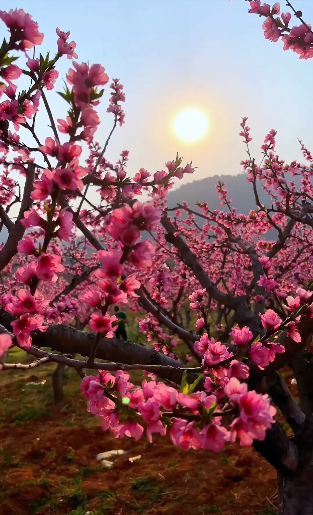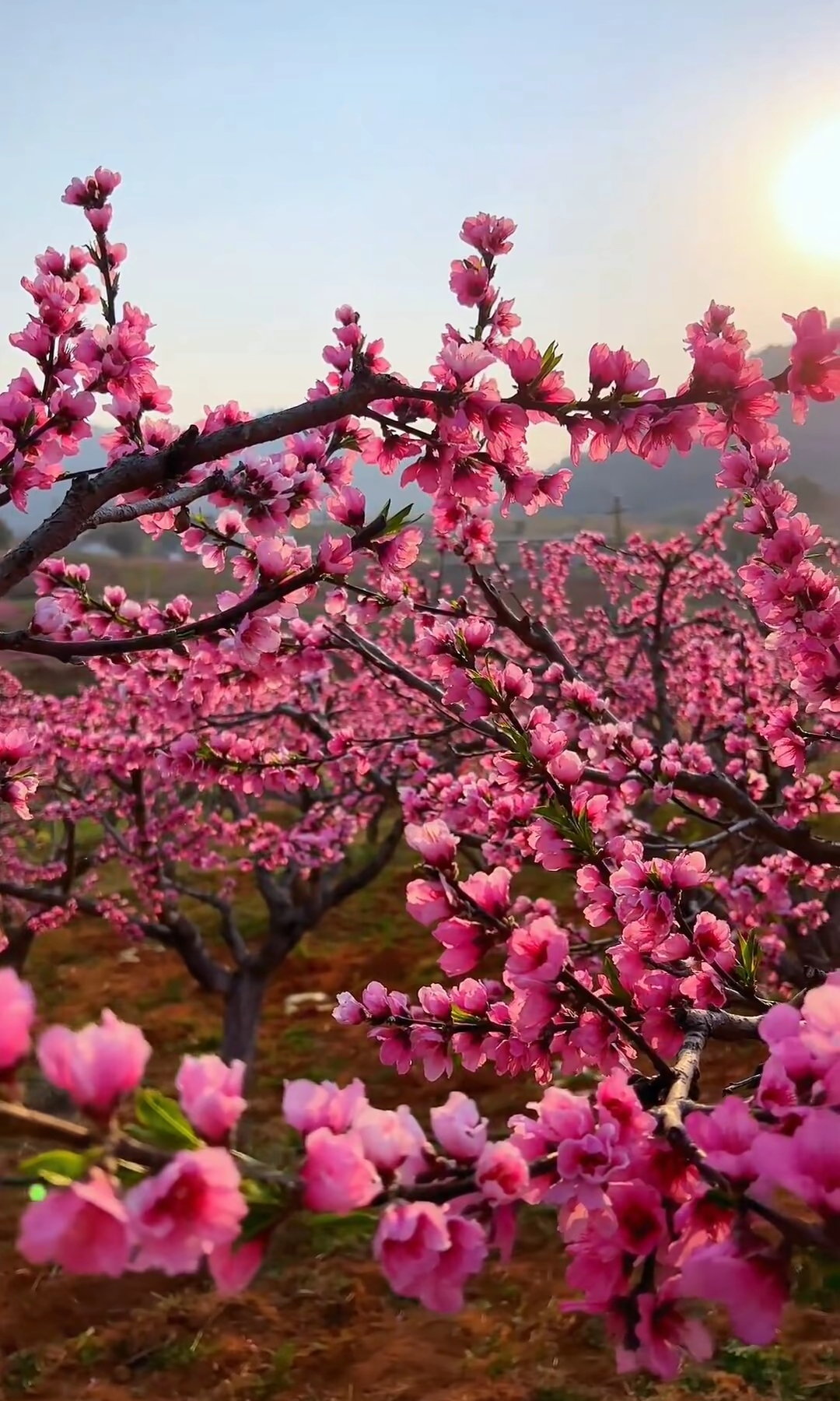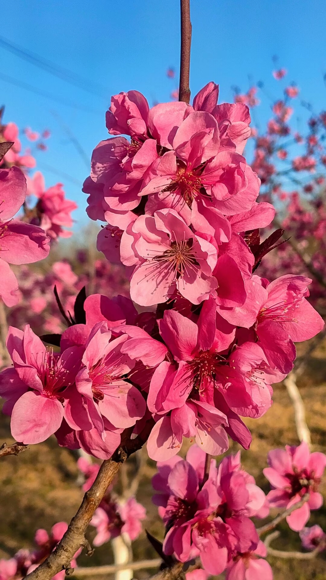 粉色的碧桃鲜艳动人,在蓝天下绽放着春天的气息。阳光洒下,花瓣轻轻摇曳,仿佛在为这个世界歌唱。