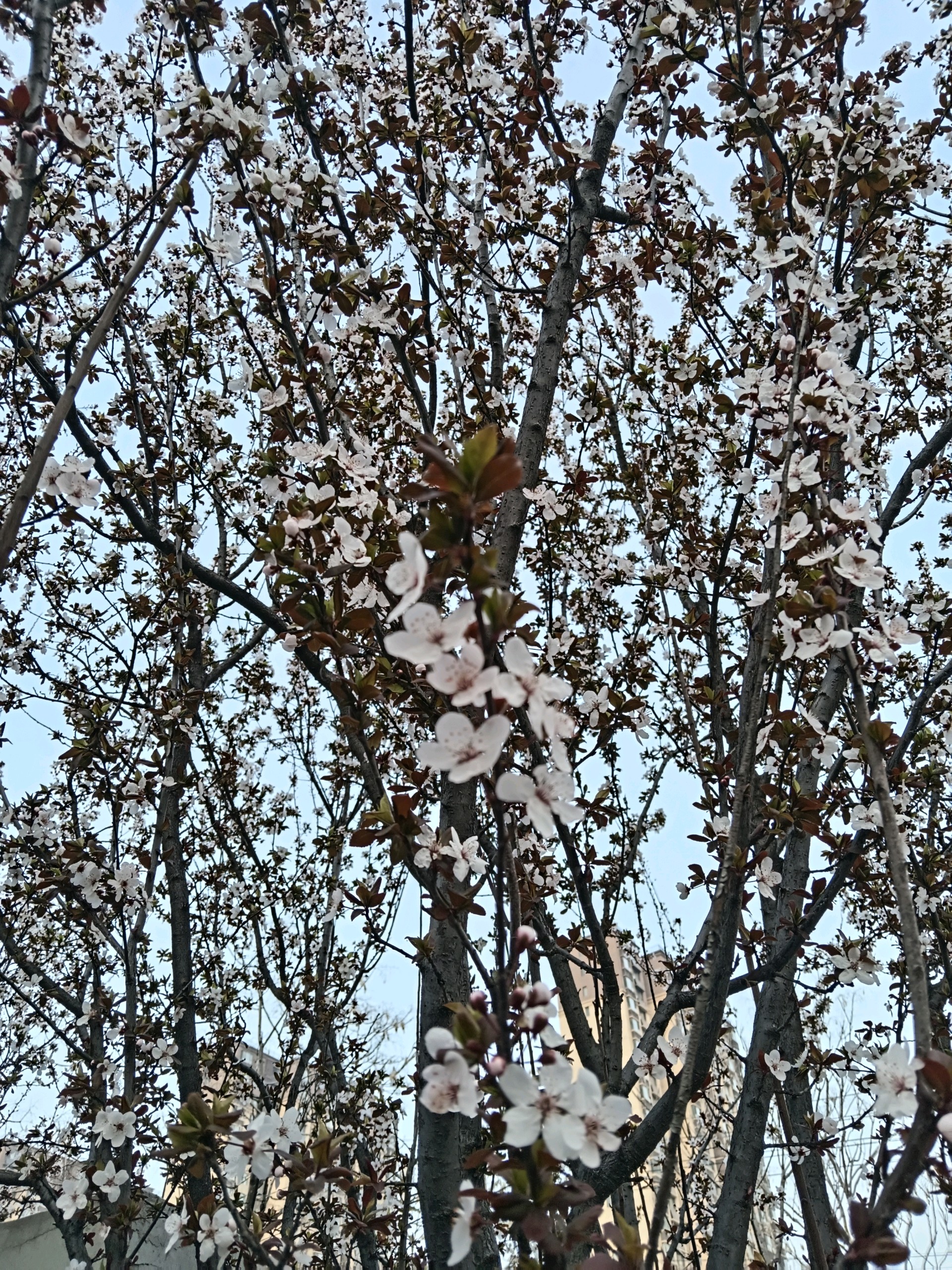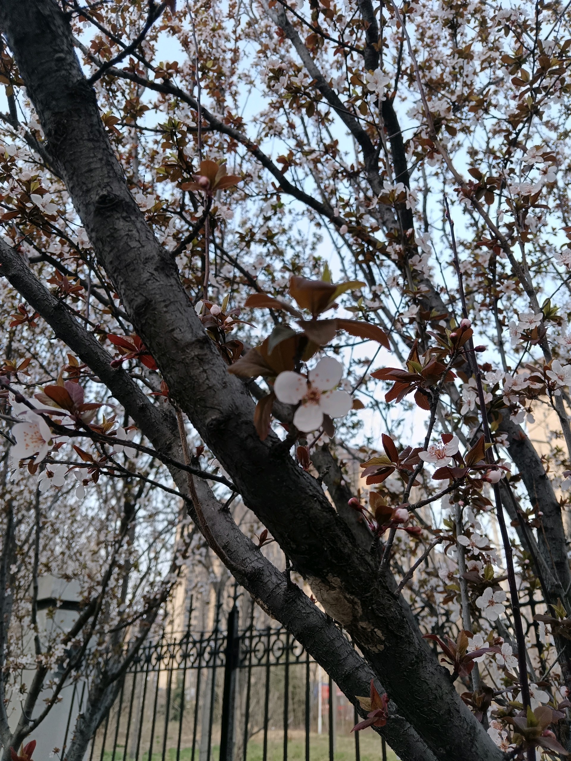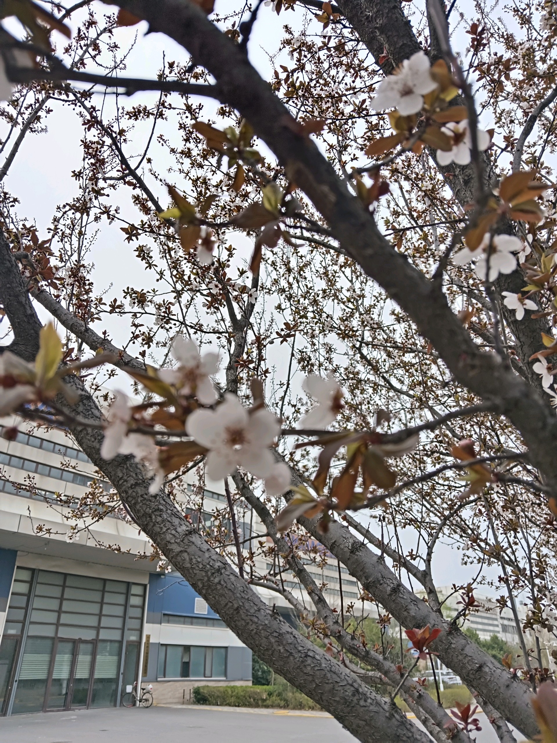 工业园的紫叶李树纷纷开花了,很是漂亮。最近气温较高,桃花含苞待放,也要开了。想到海子的诗,“面朝大海,春暖花开”。