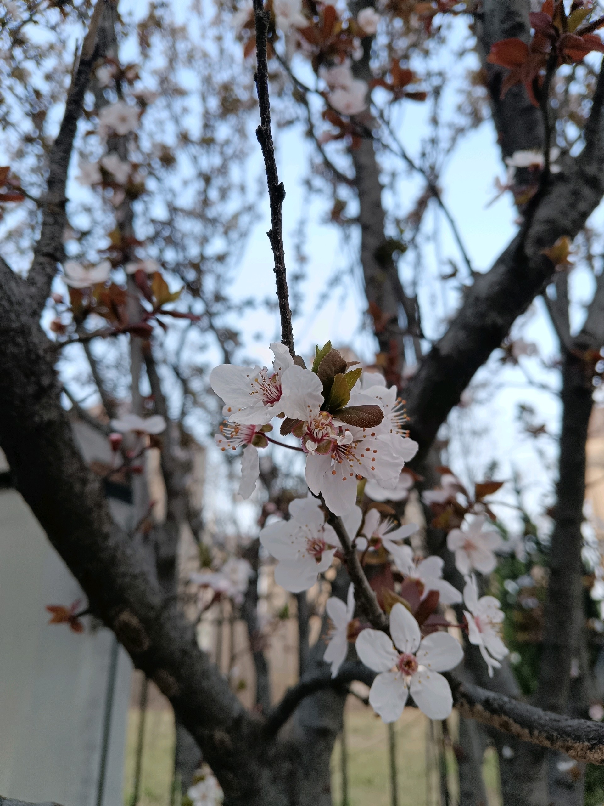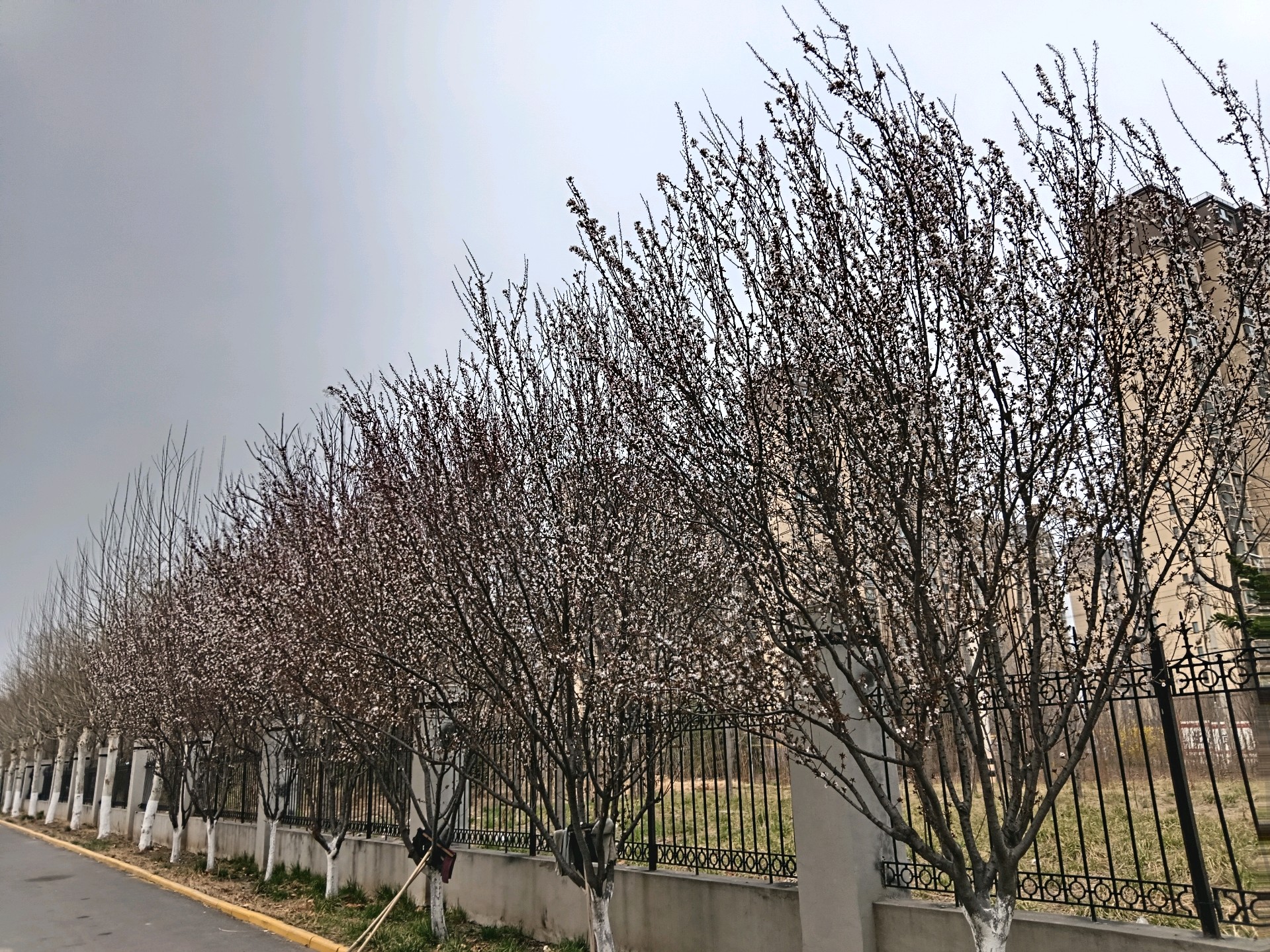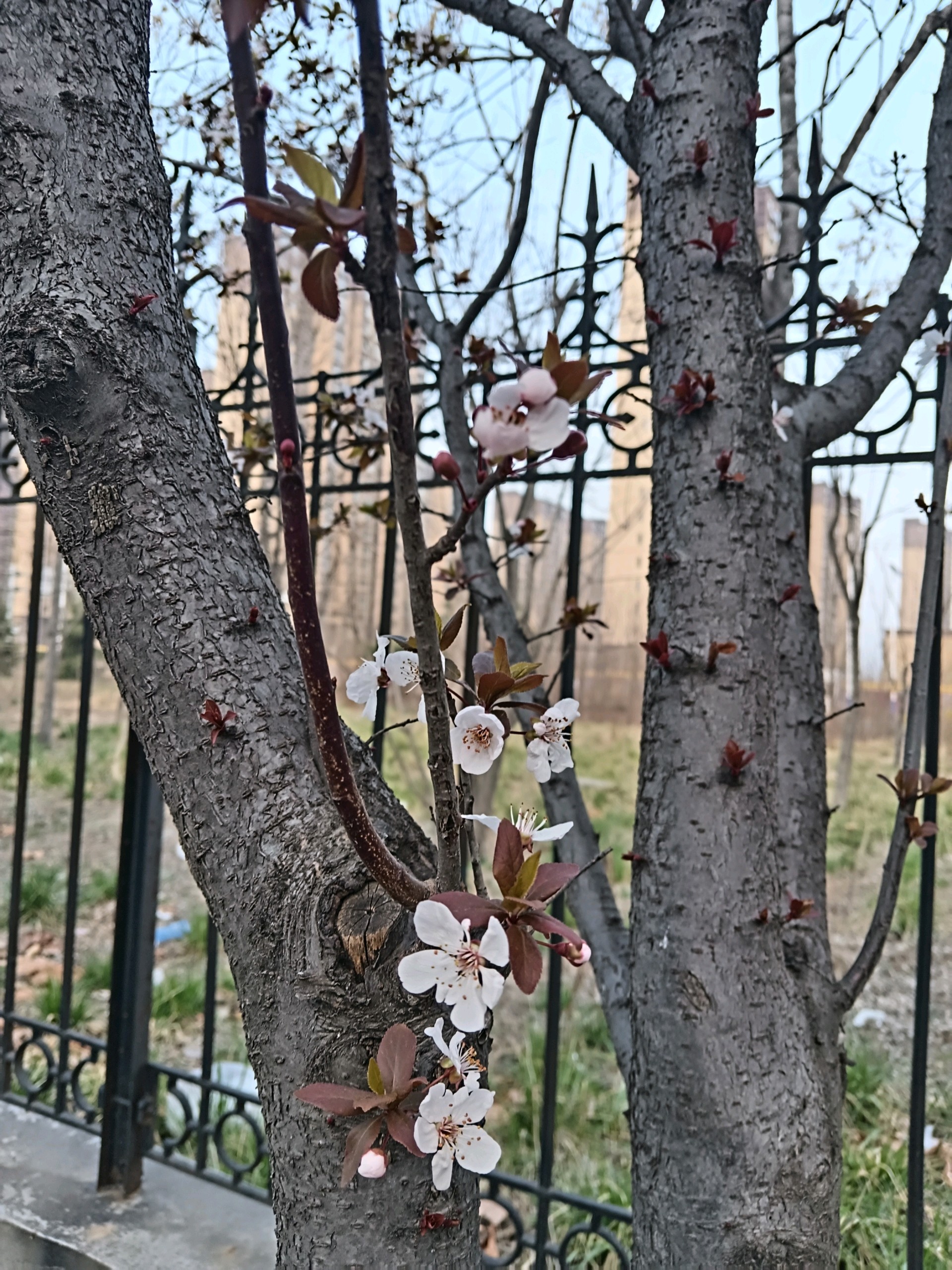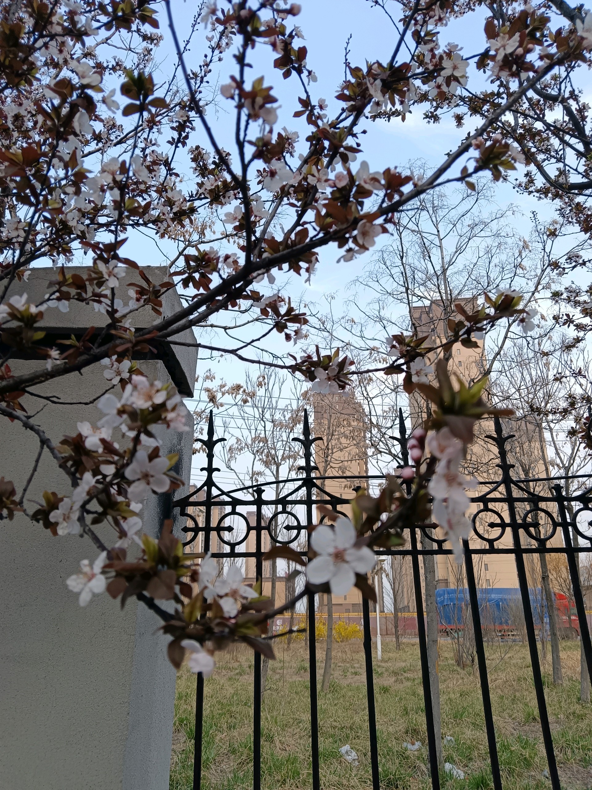 工业园的紫叶李树纷纷开花了,很是漂亮。最近气温较高,桃花含苞待放,也要开了。想到海子的诗,“面朝大海,春暖花开”。