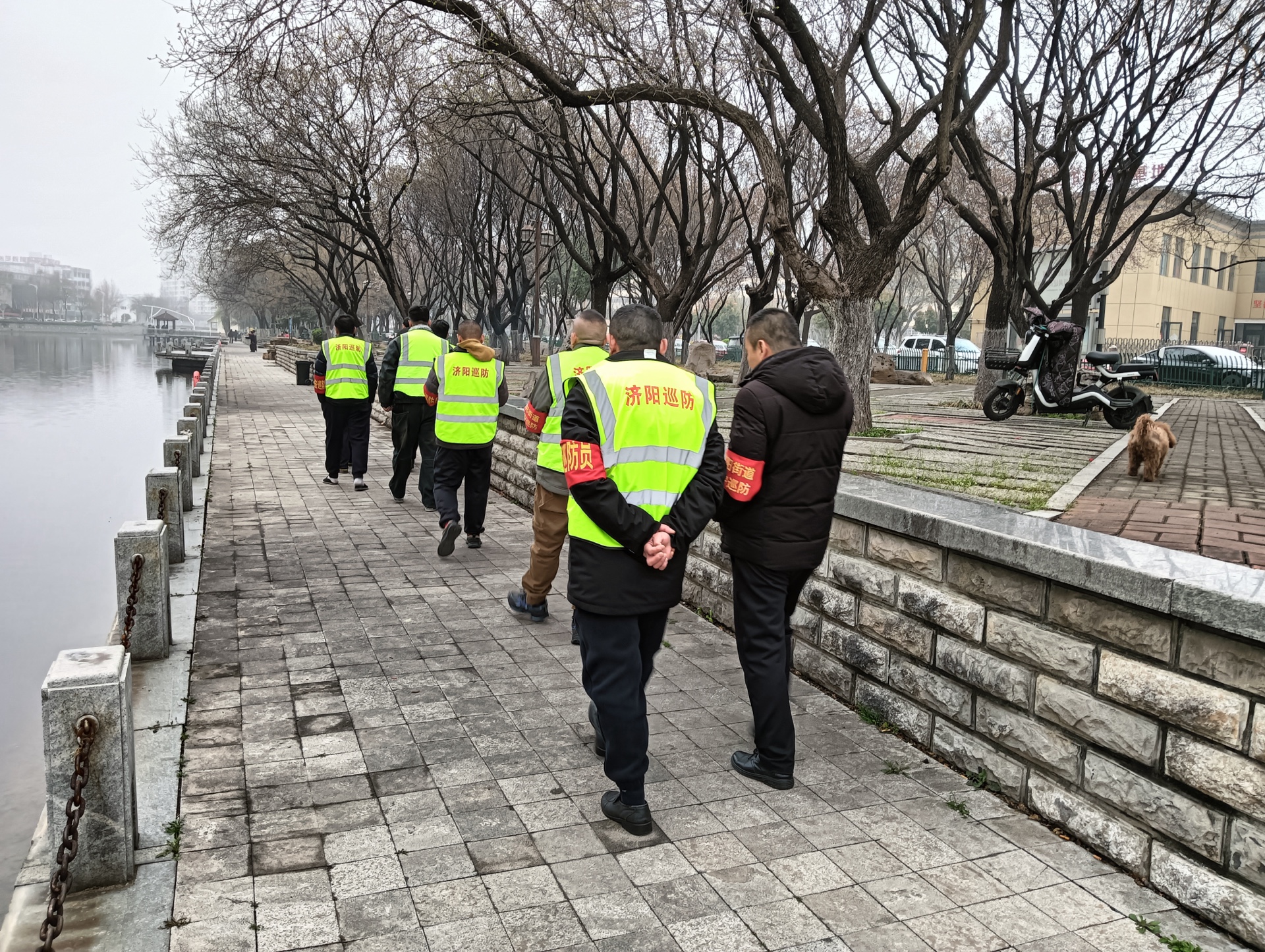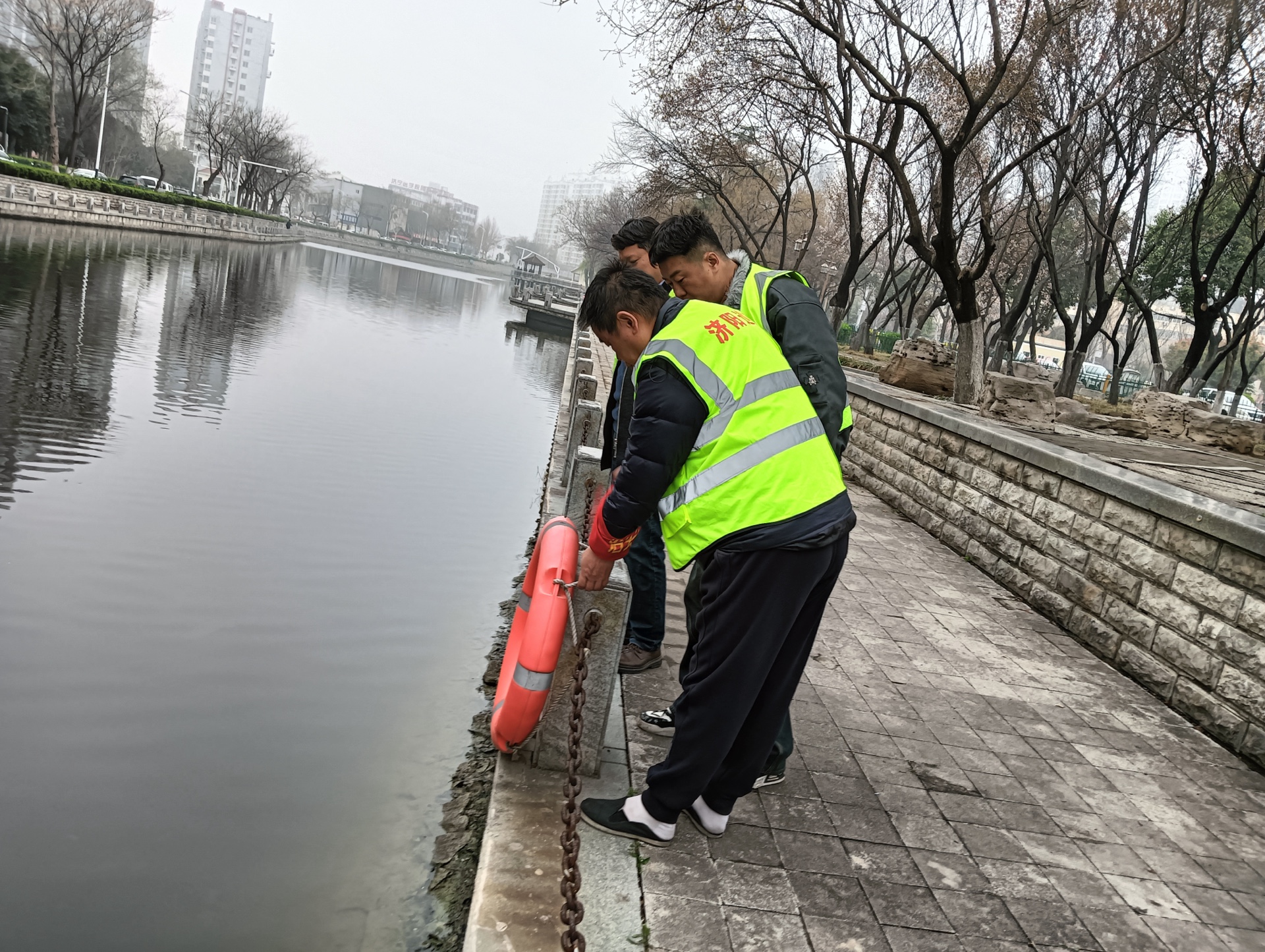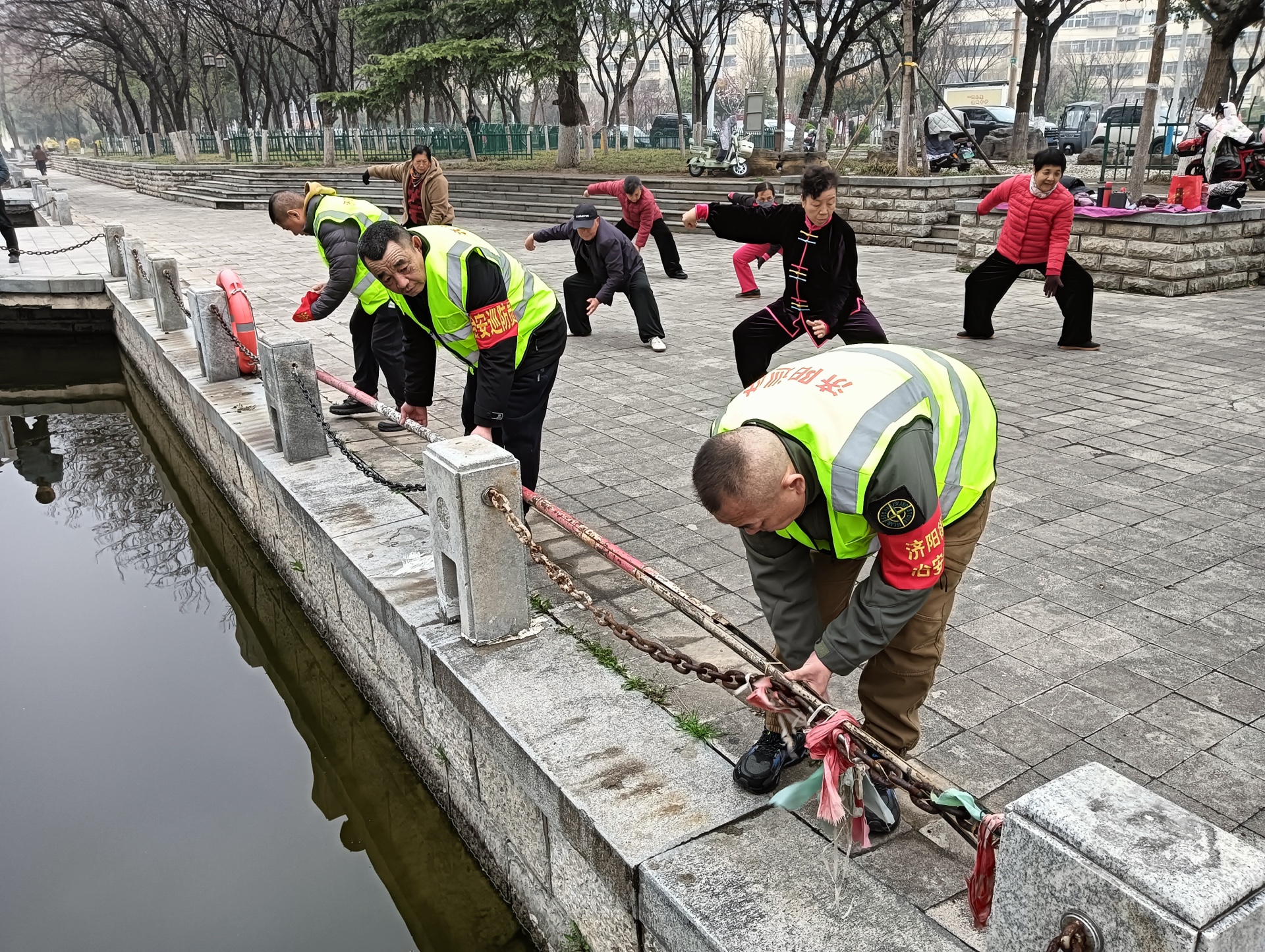 此次行动聚焦春季河道安全防护重点。志愿者们先对步道护栏进行全面检修,逐一排查锁链衔接处、固定装置的稳固性,拧紧松动螺丝,清理缠绕的杂物,确保护栏无安全隐患;随后,他们重点检查岸边救生圈、救生绳等应急设施,确认装备完好、摆放规范,为突发情况做好保障。巡逻过程中,志愿者们还向周边晨练的居民宣传防溺水安全知识,提醒大家远离危险水域。