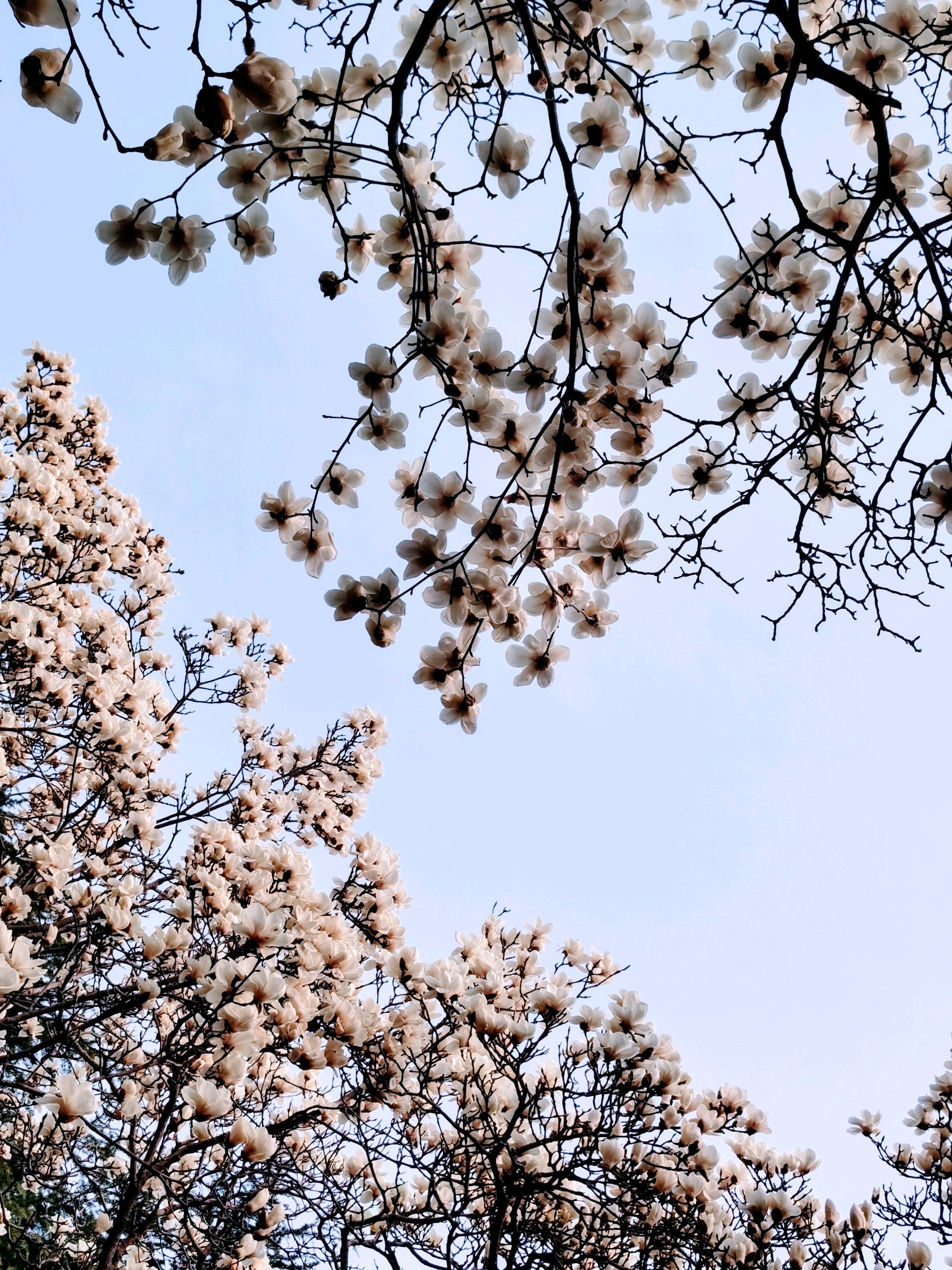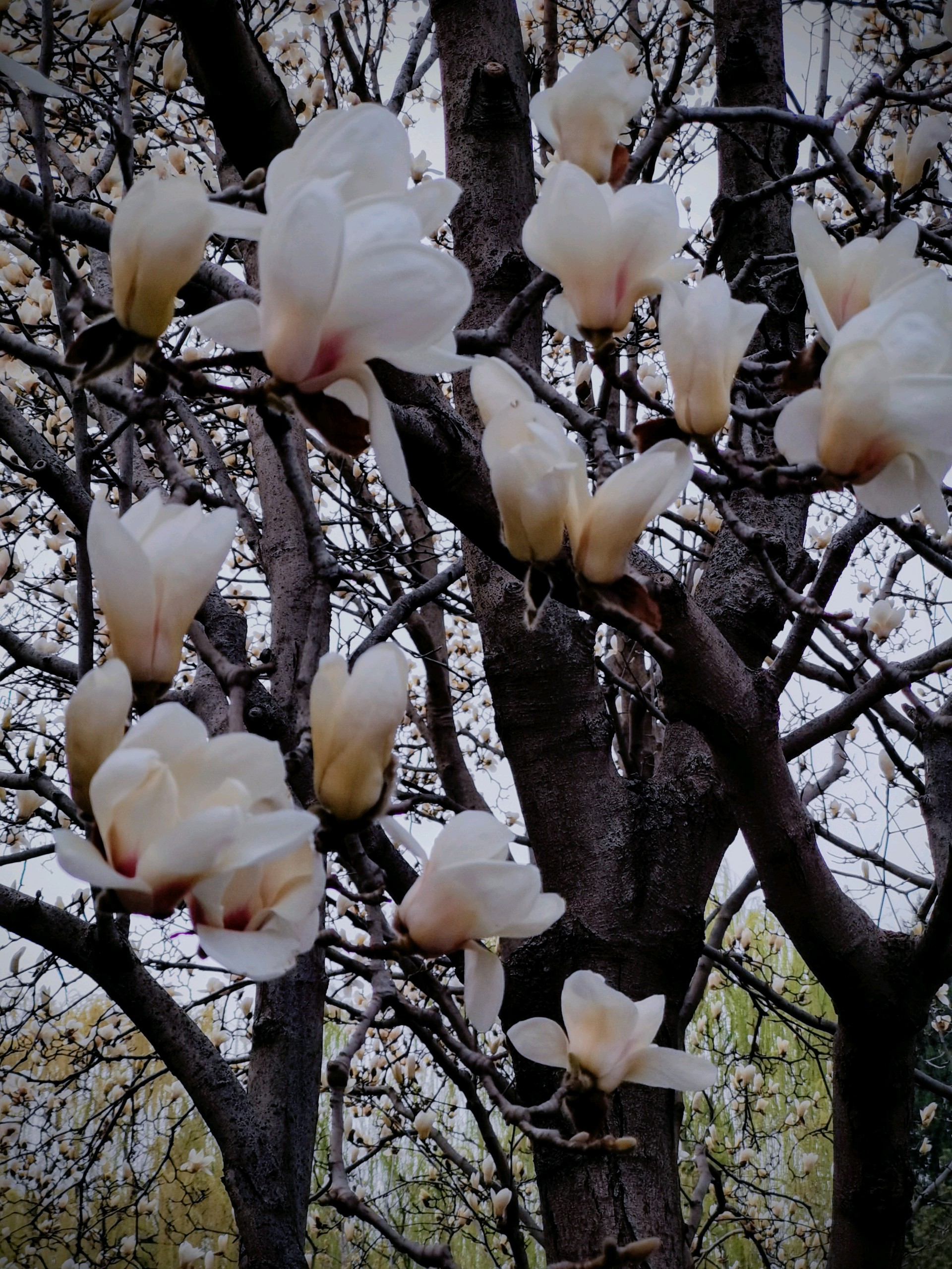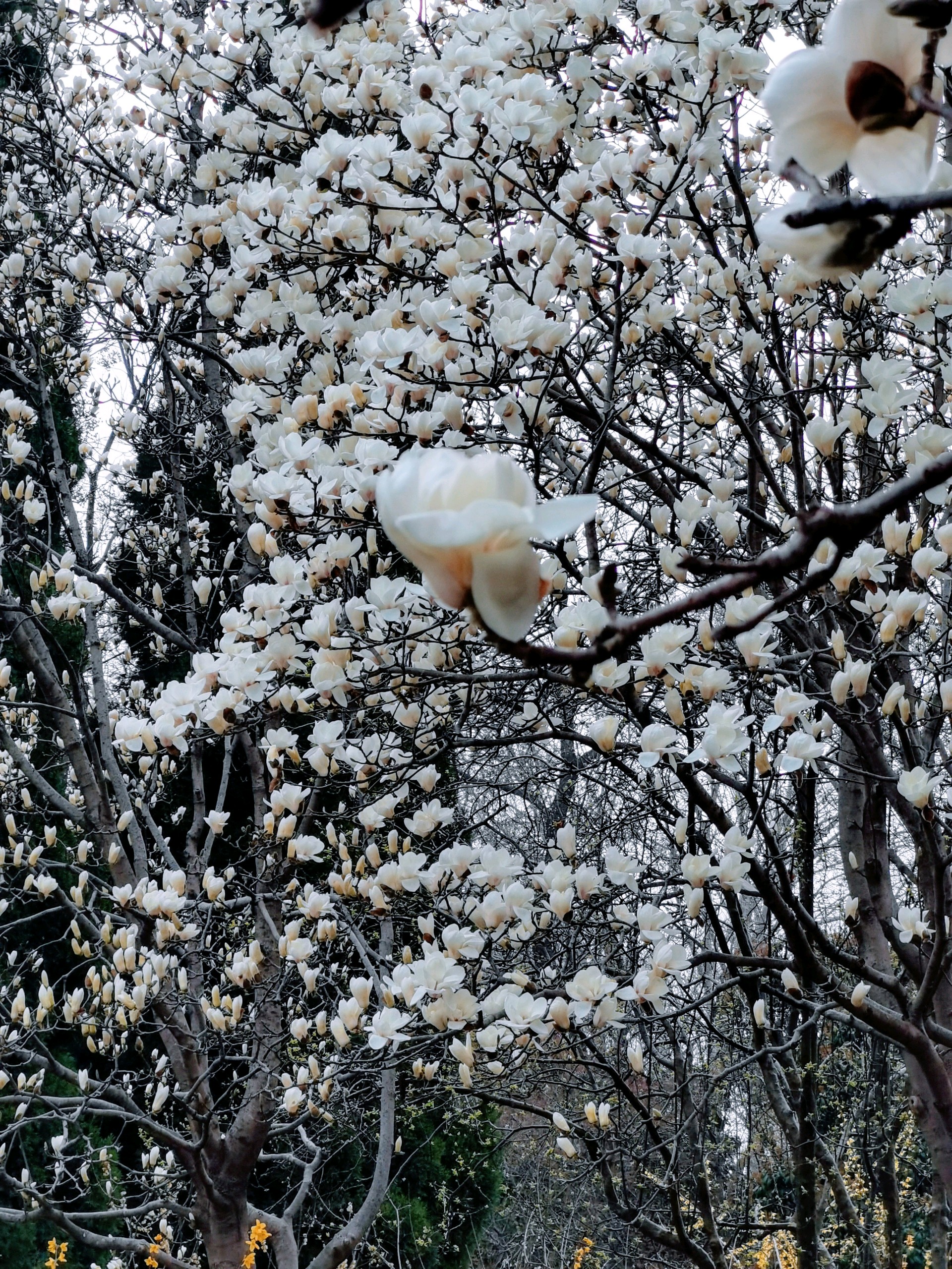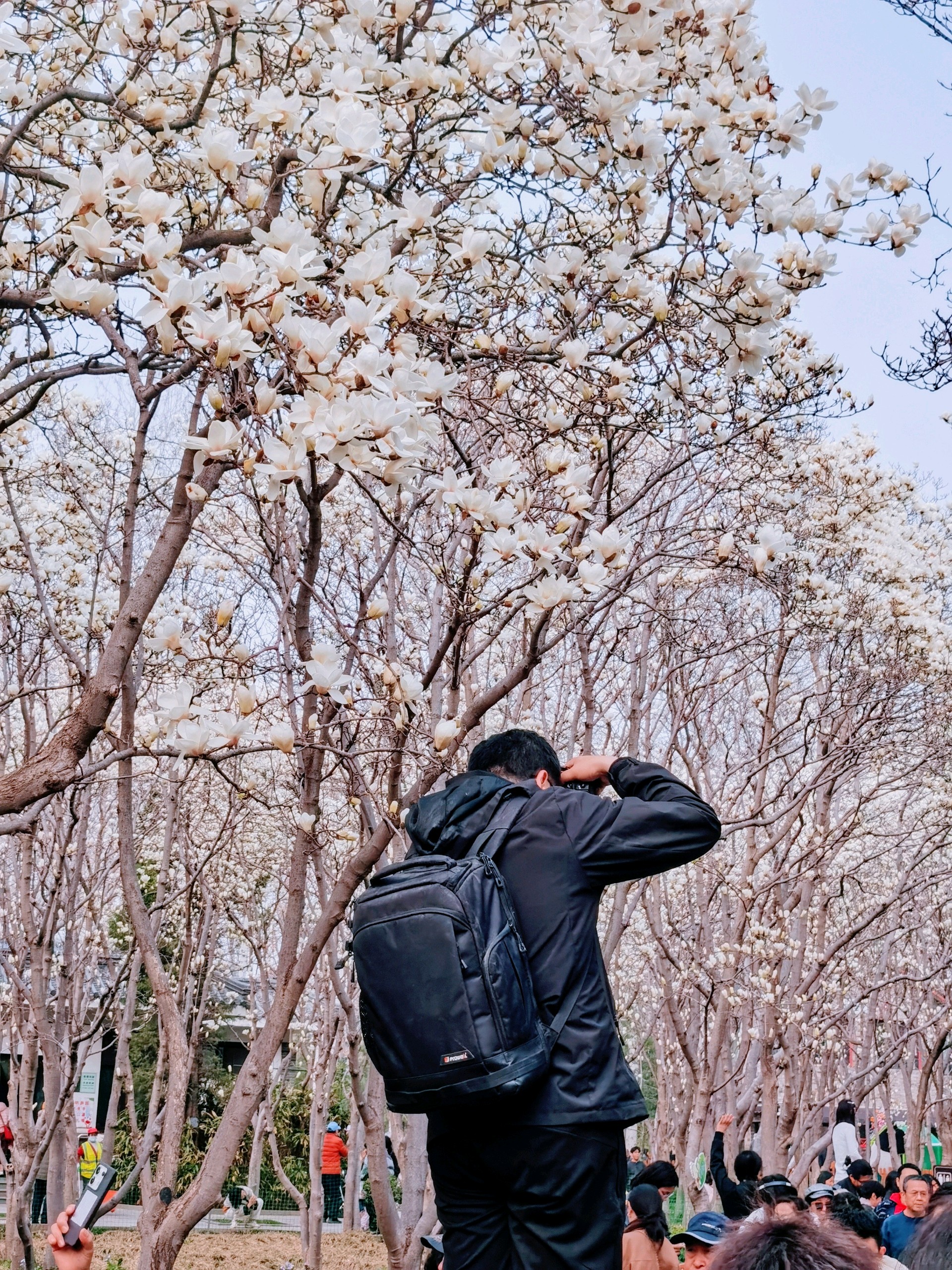 百花公园玉兰绽放,游人如织。粉白枝头闹,青衫树下停。春深何必问,花海自倾城。