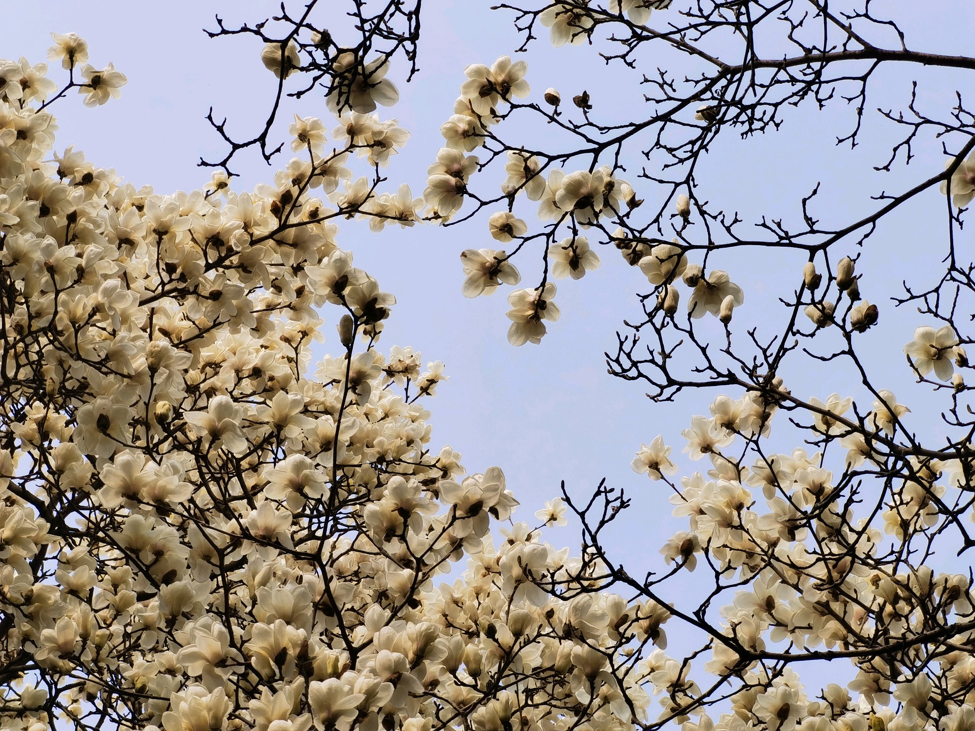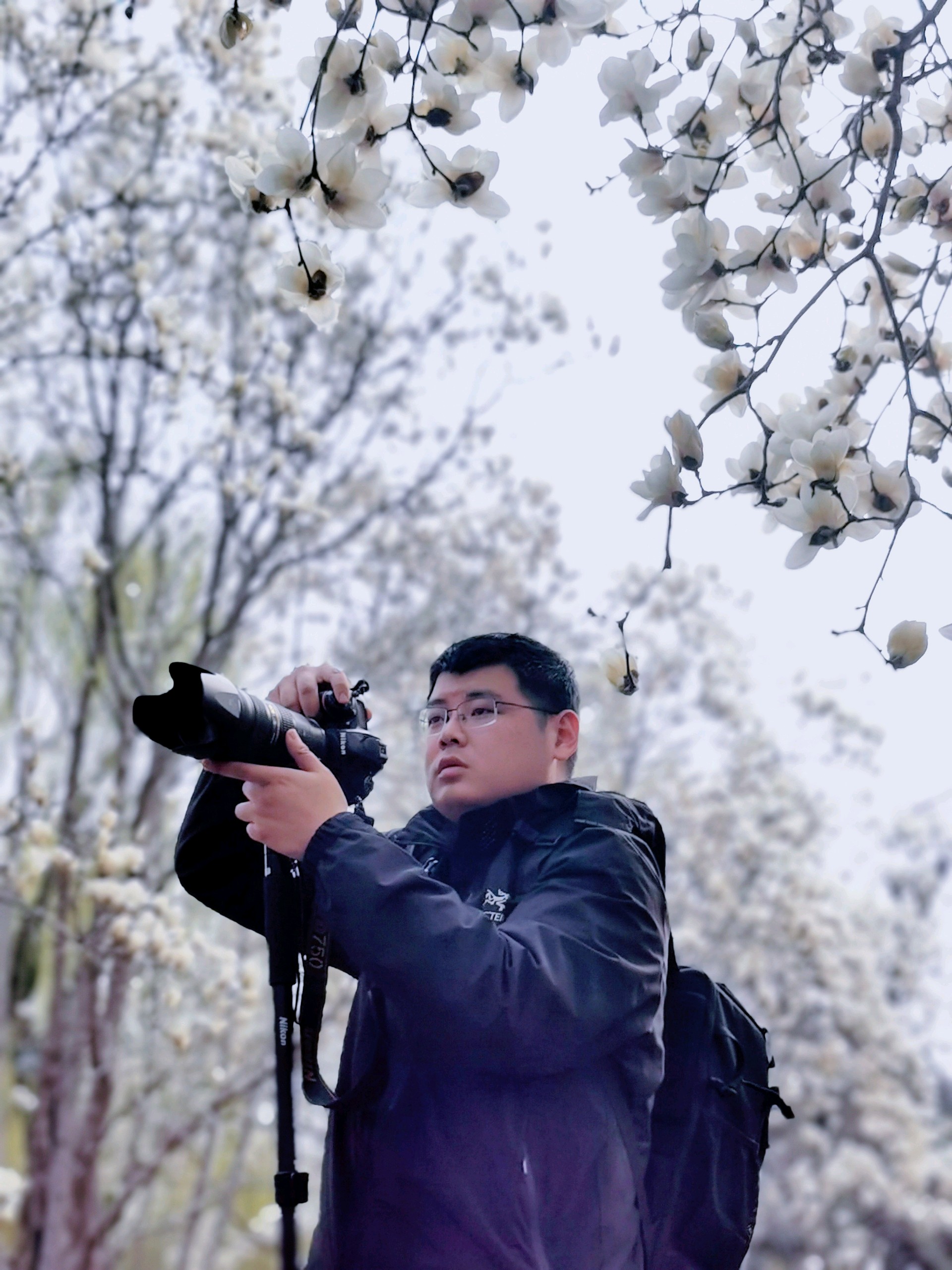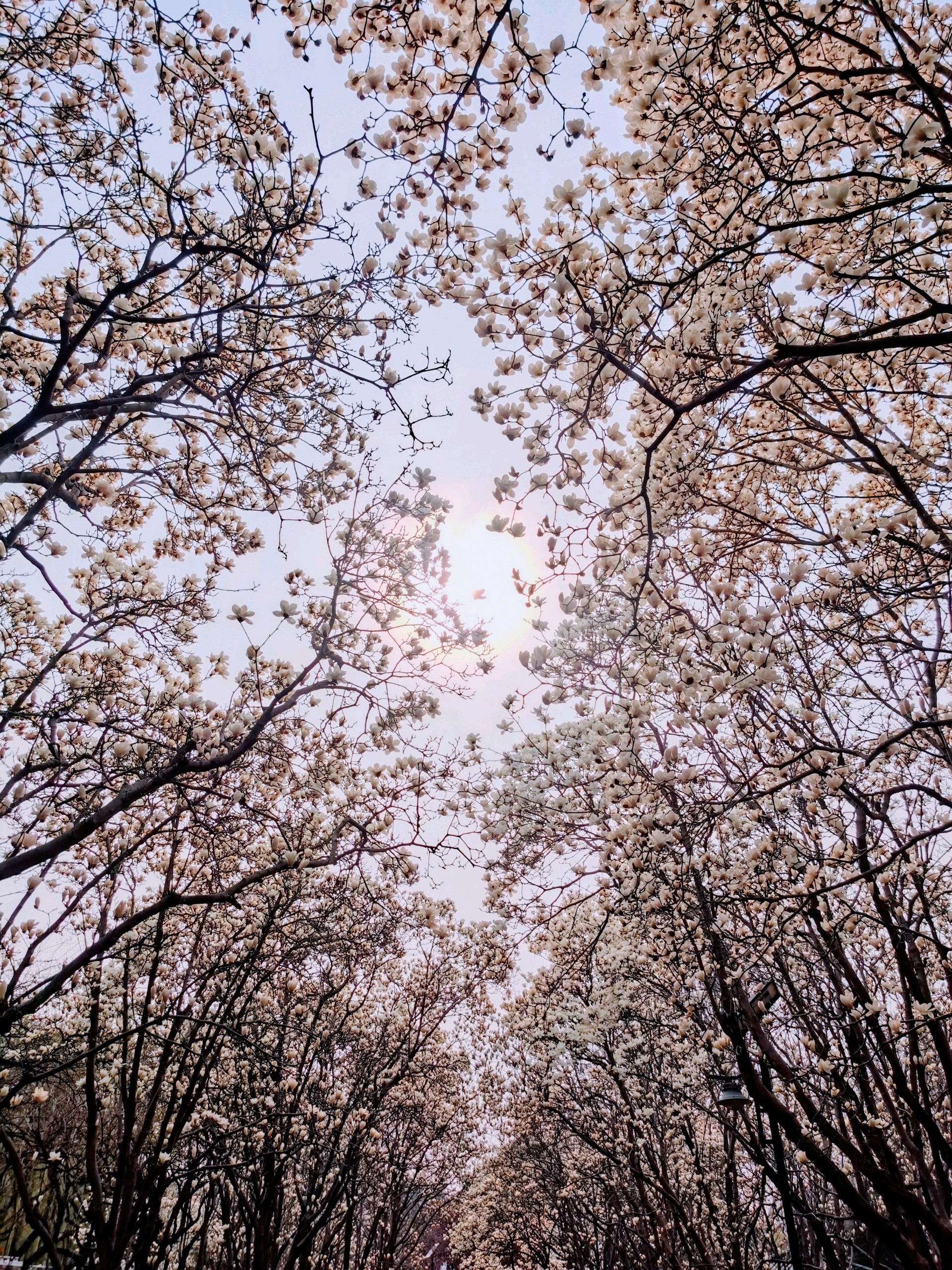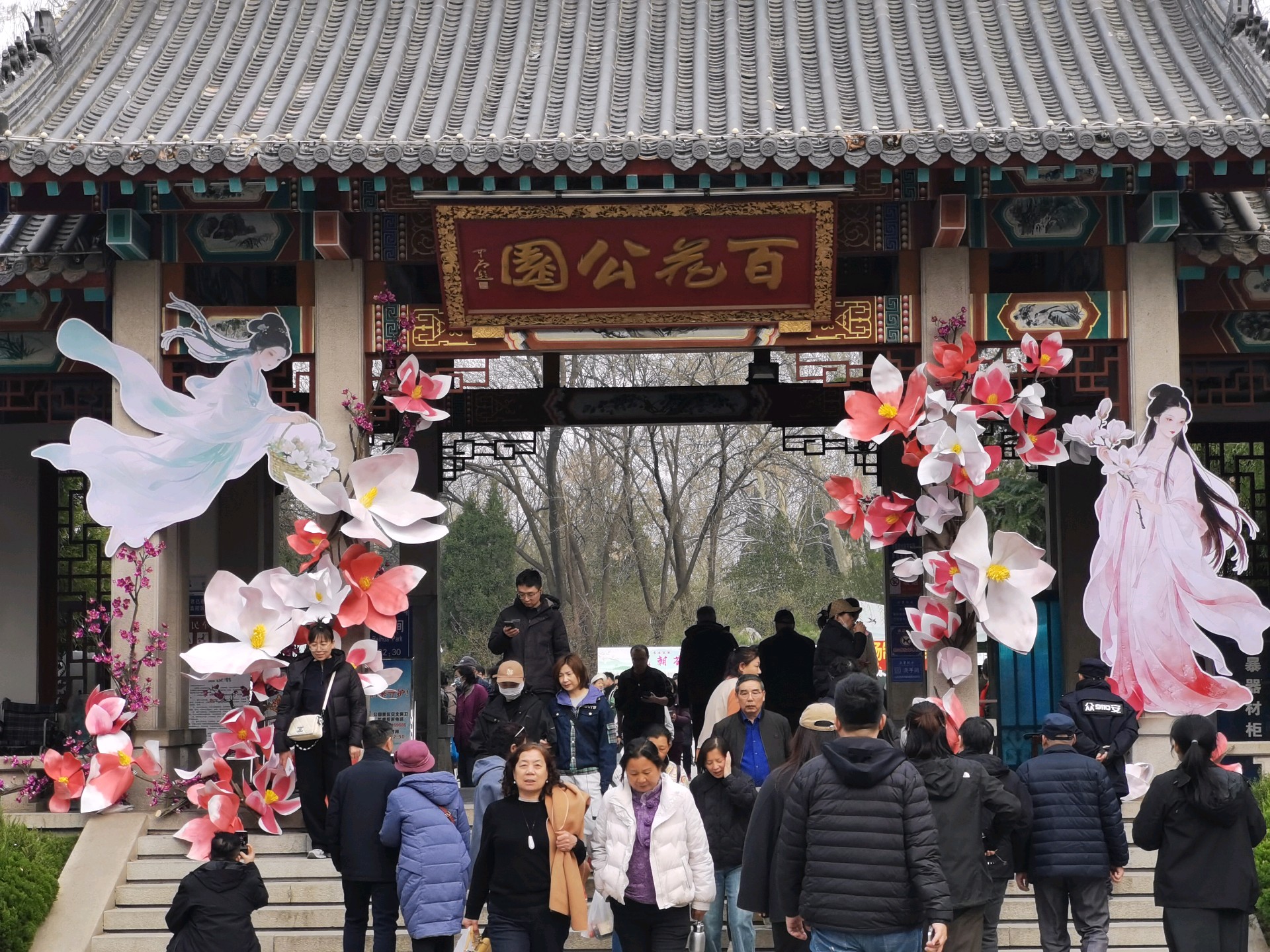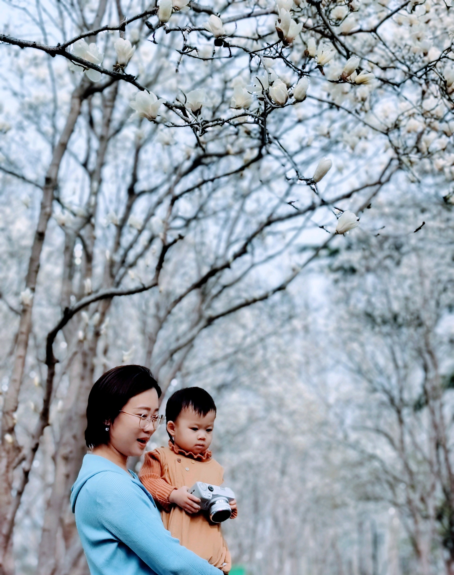 百花公园玉兰绽放,游人如织。粉白枝头闹,青衫树下停。春深何必问,花海自倾城。