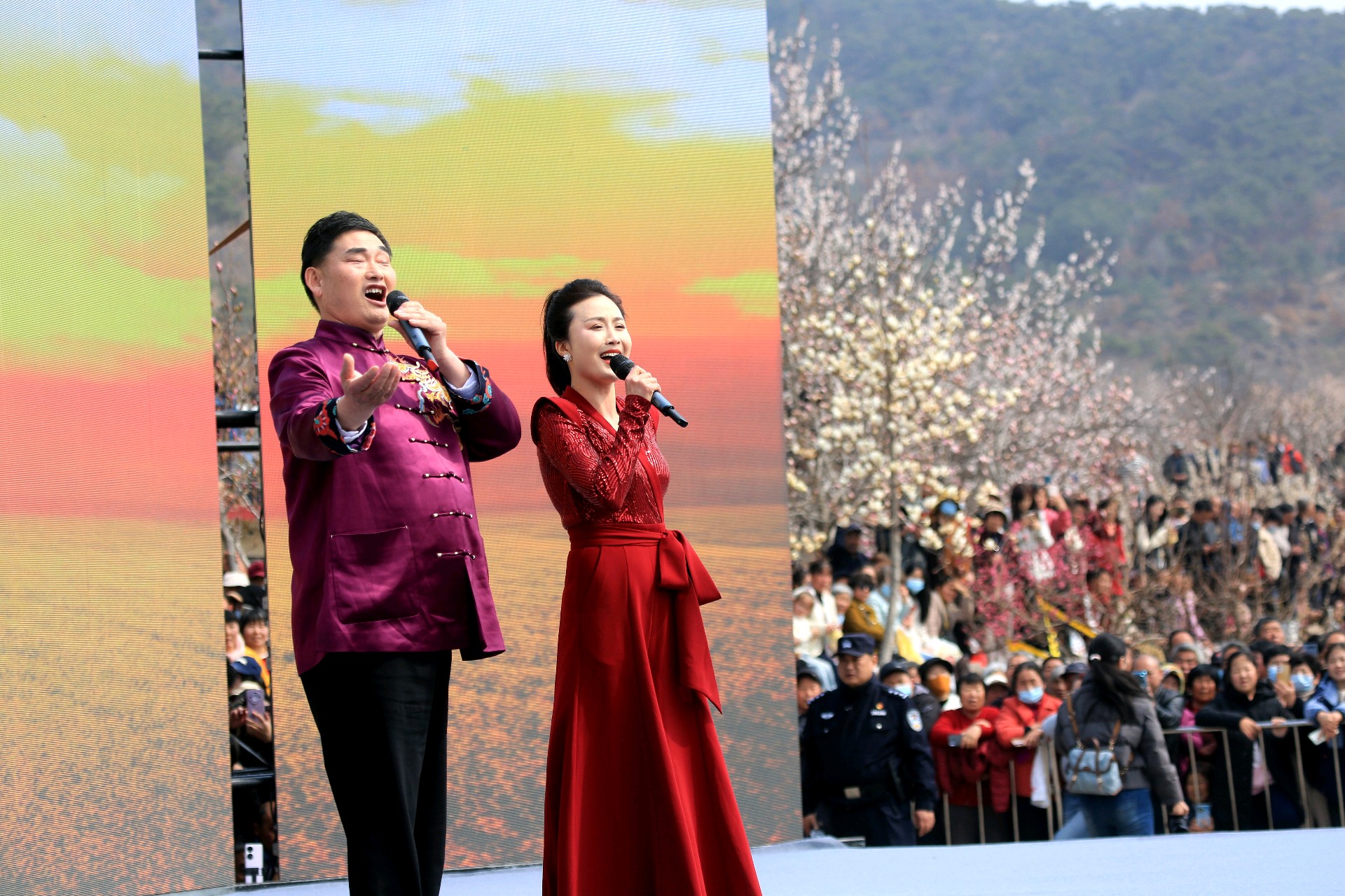 3月22日,在日照市五莲县叩官镇大旺村,大衣哥朱之文和青年歌手马翠霞同台演唱《在希望的田野上》,受到数万观众的热烈欢迎。
