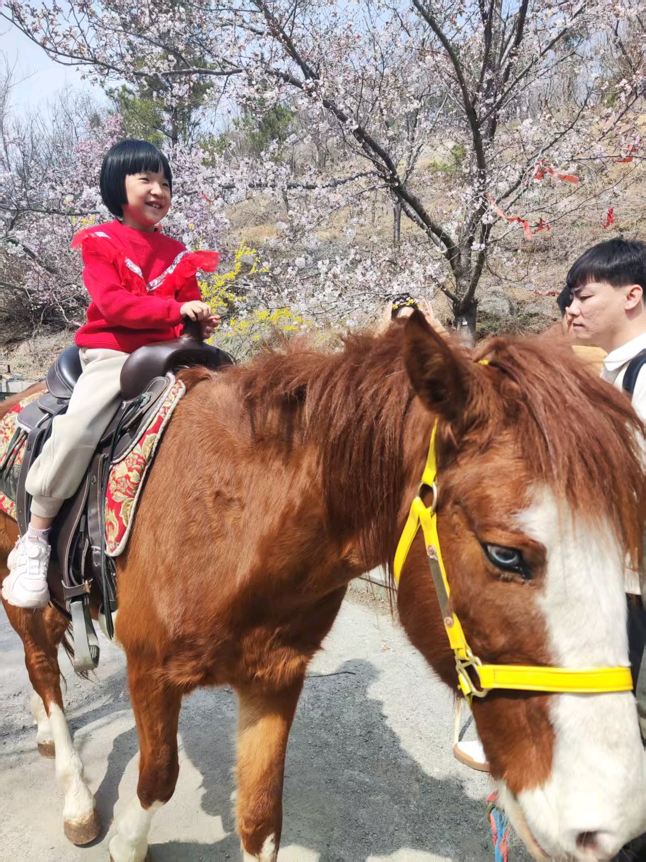 在樱花长廊,不少游客,在樱花树下,拍照留念,一个穿着红衣服,10岁左右的女孩子,骑在一匹红棕马上,激动和兴奋,难以言表。