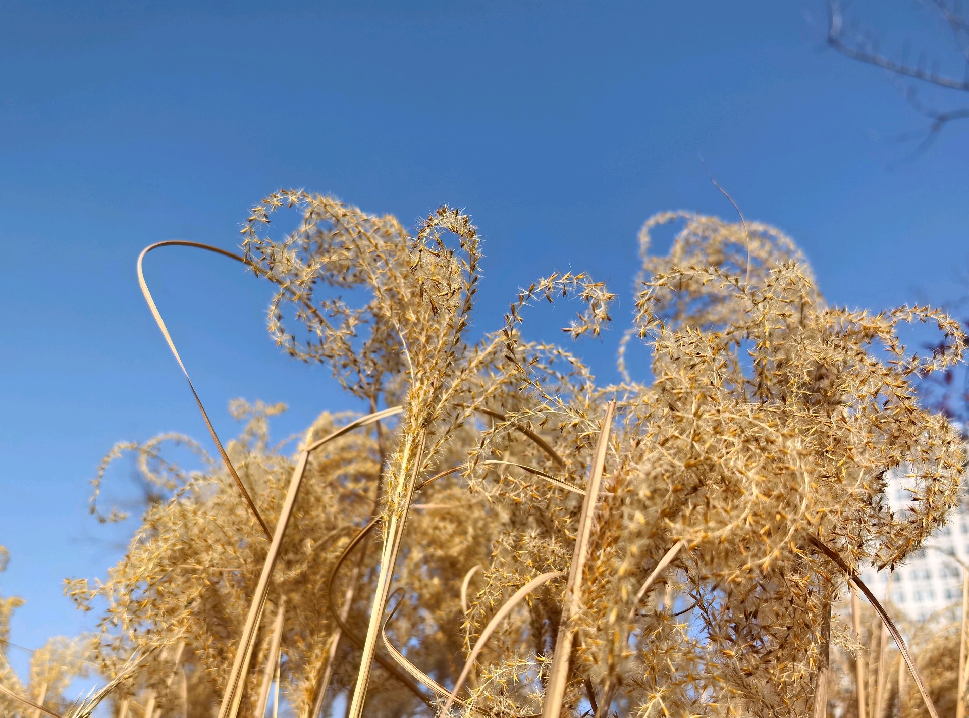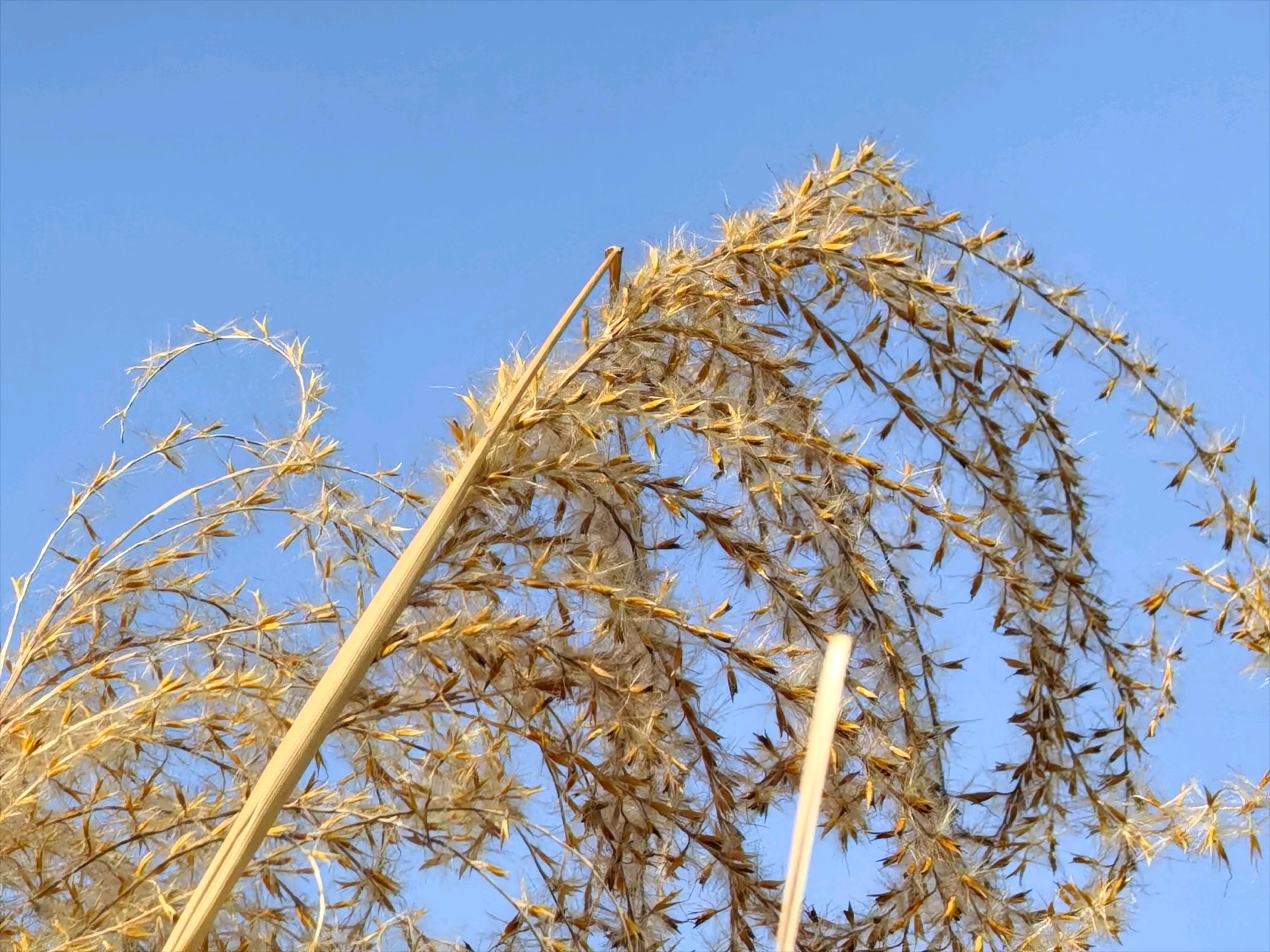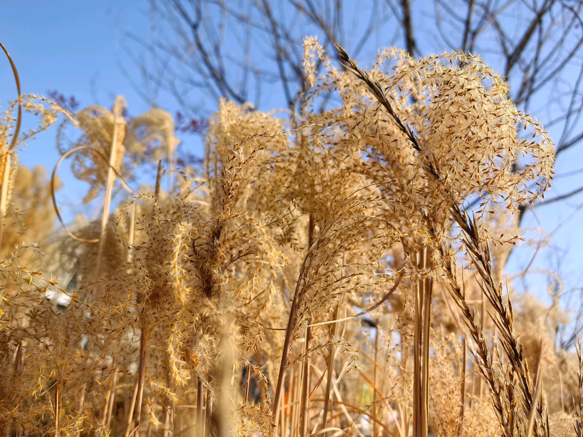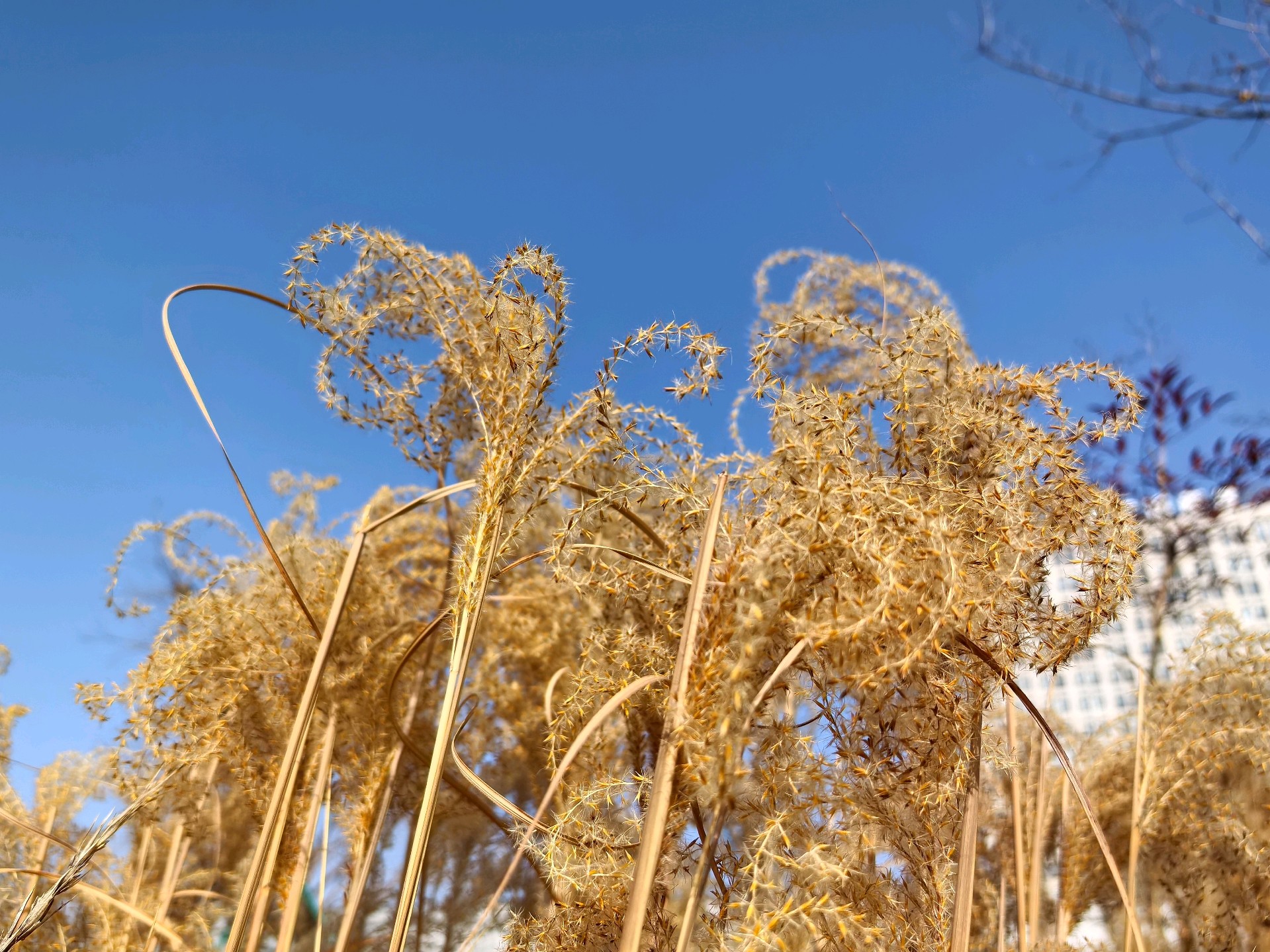 澄澈如洗的蓝天是最干净的画布,晴空下的金芒诗篇,而这丛芦苇便是风写下的温柔诗行。它们褪去了春夏的鲜绿,换上一身暖金色的绒羽,在晴空里舒展着卷曲的穗芒,像无数细碎的星光落进了人间。阳光穿过蓬松的花穗,把每一根纤弱的茎秆都镀上了暖亮的轮廓,让枯荣的质感也变得温柔而有力量。风过时,金浪与蓝天轻轻相拥,没有喧嚣,只有一种沉静又治愈的美。这是属于季节的浪漫,也是自然写给城市的温柔情书,让寻常的草木,在晴空下也成了动人的风景。