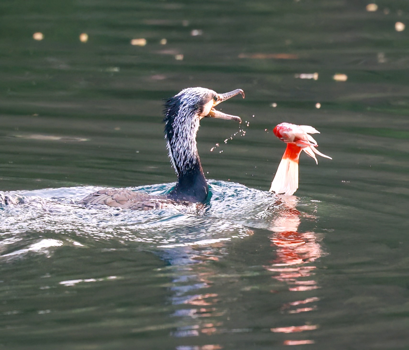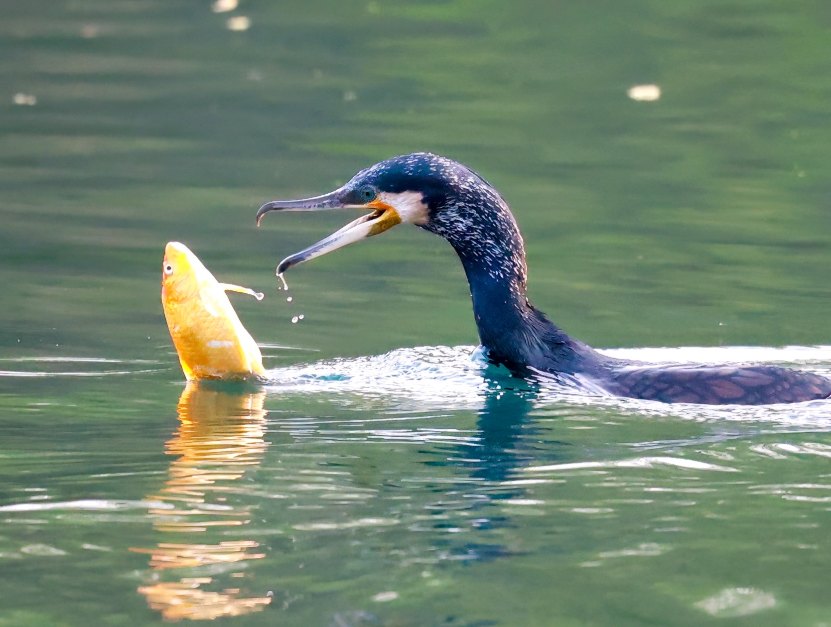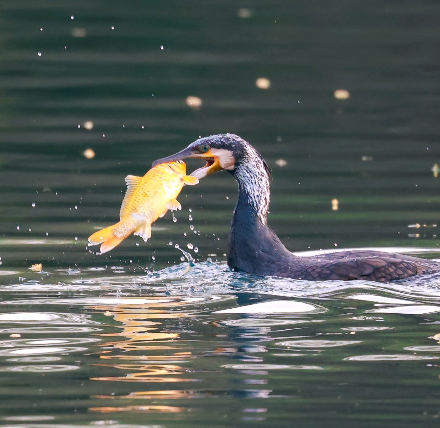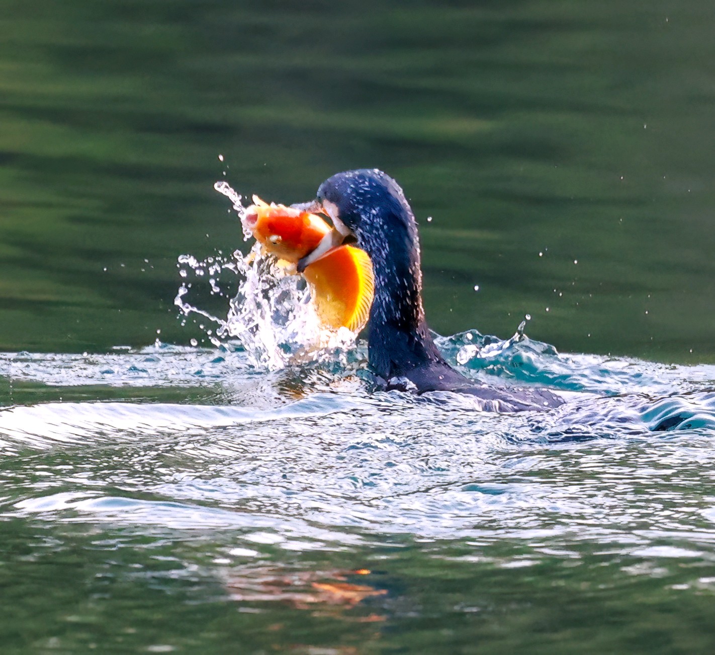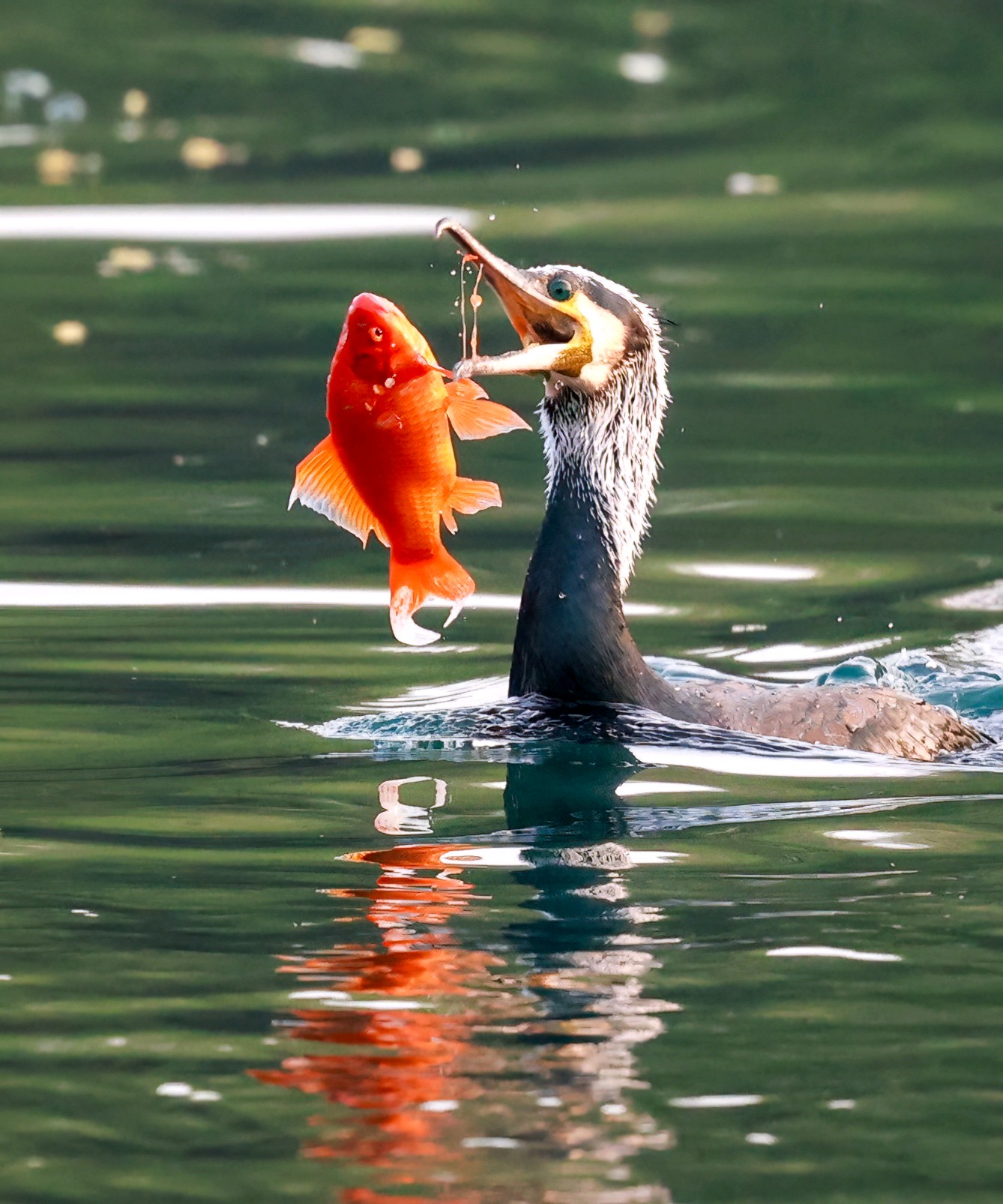 鸬鹚捕鱼的最大看点在于一个“快”字,堪称一场精彩的水上表演。它们时而在湖面上低空盘旋,一旦锁定目标,便如离弦之箭般一头扎进水中,身姿矫健。别看它们在水上不起眼,入水后借助短而有力的翅膀在水下快速推进,最深可潜至近20米,能憋气长达一分钟。转瞬之间,它们便会衔鱼而出。无论是小个的泥鳅还是大个的鲤鱼,都难逃它们的“铁嘴”,经常能看到它们喉咙鼓鼓的,塞满了鱼浮出水面。