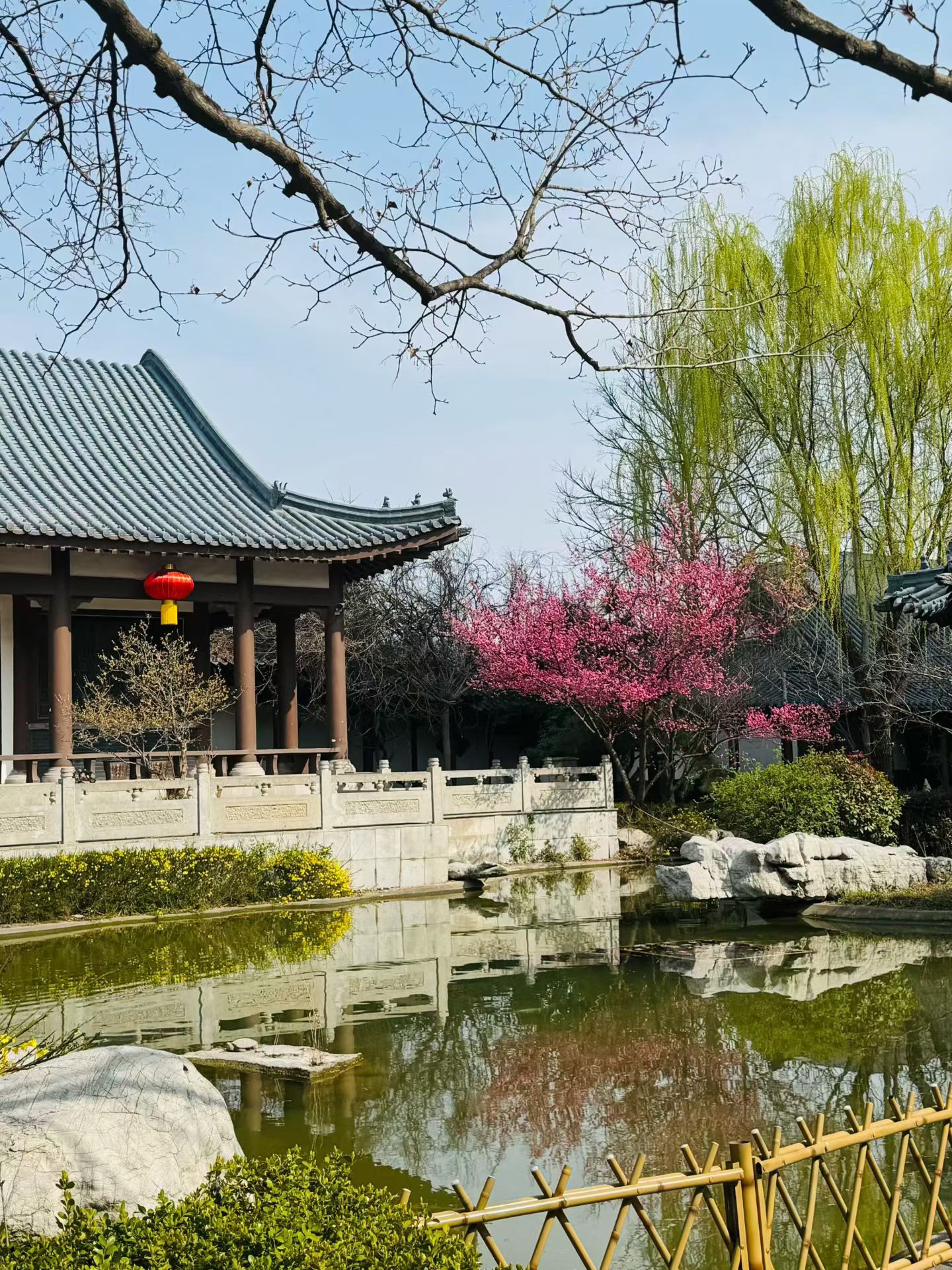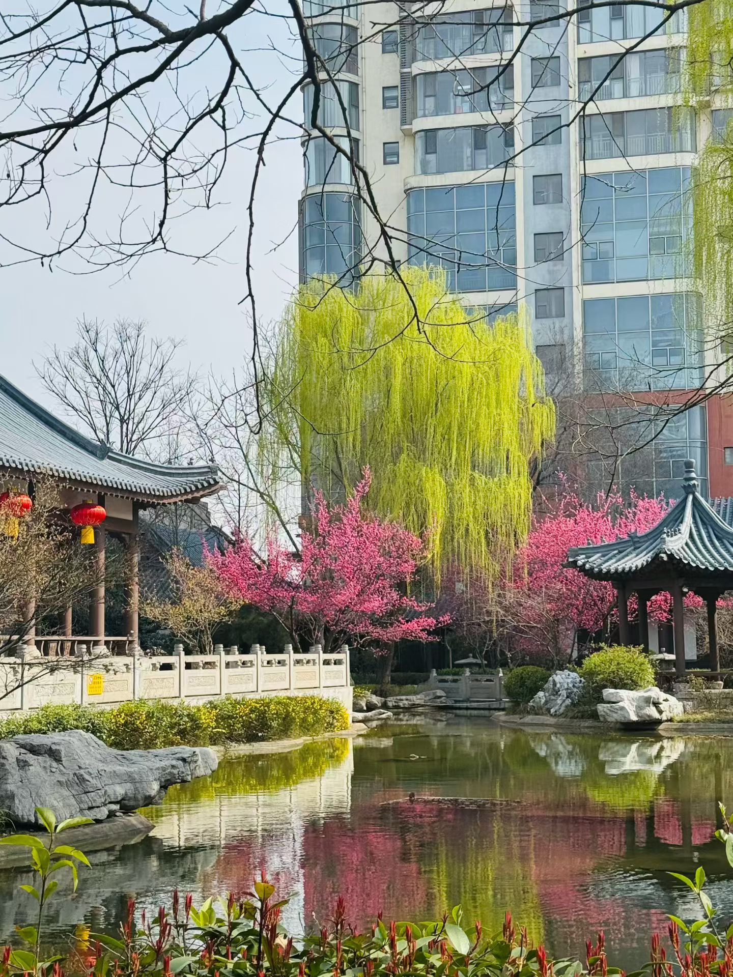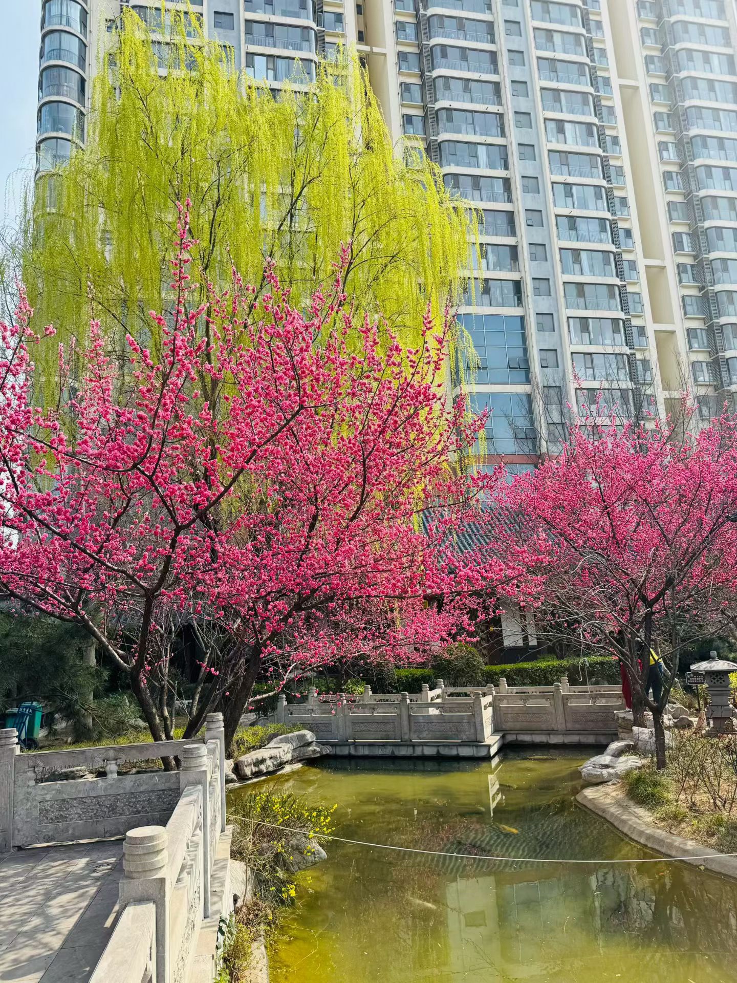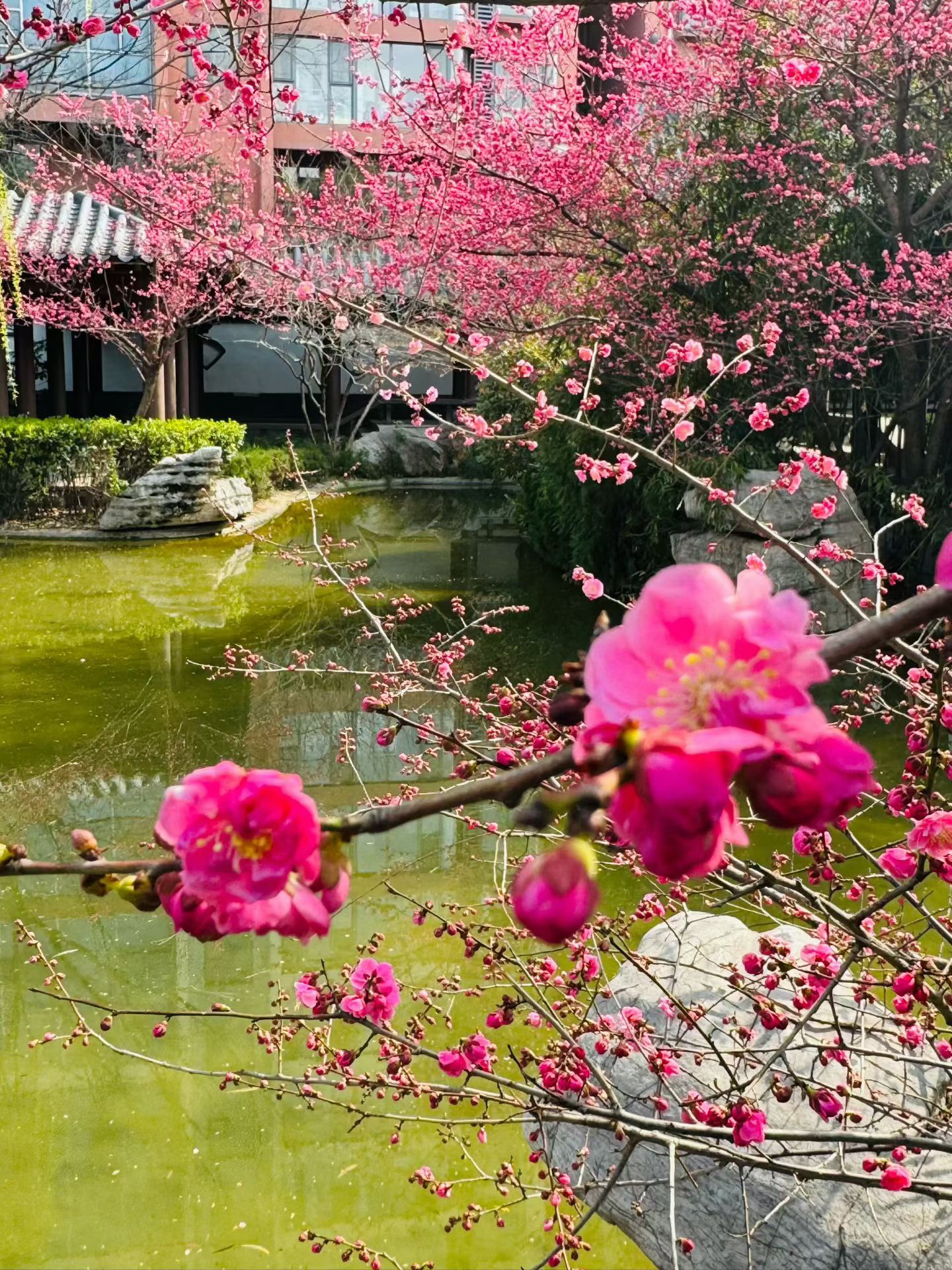 文案如下: 粉色的碧桃盛开在池塘边,与古老的建筑和绿色的植被相互映衬,构成了一幅美丽的画卷。