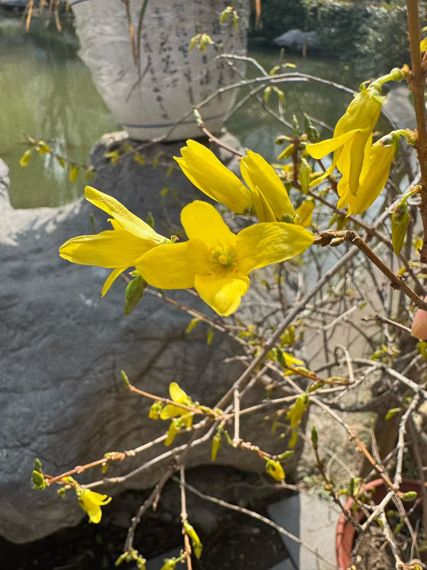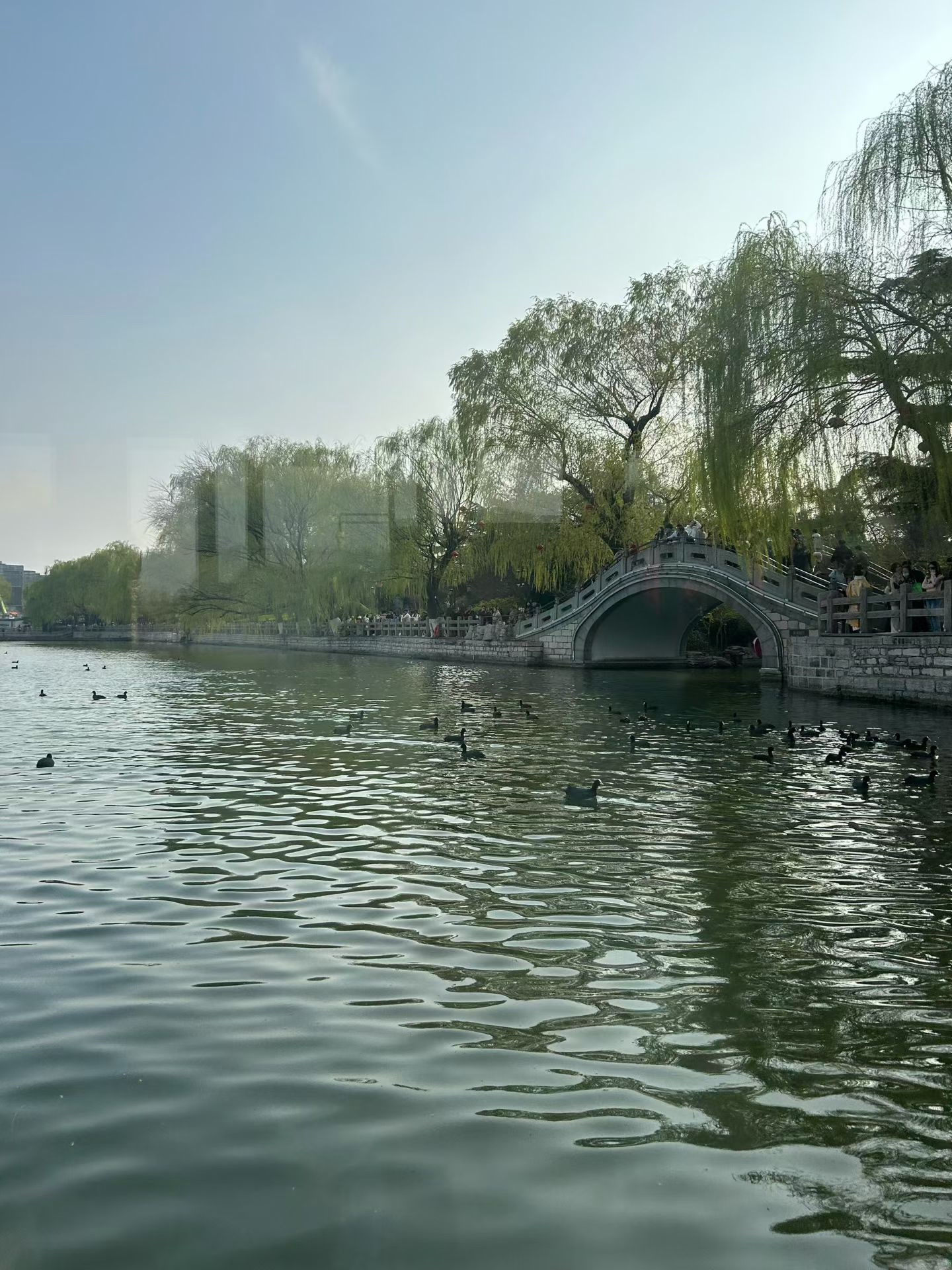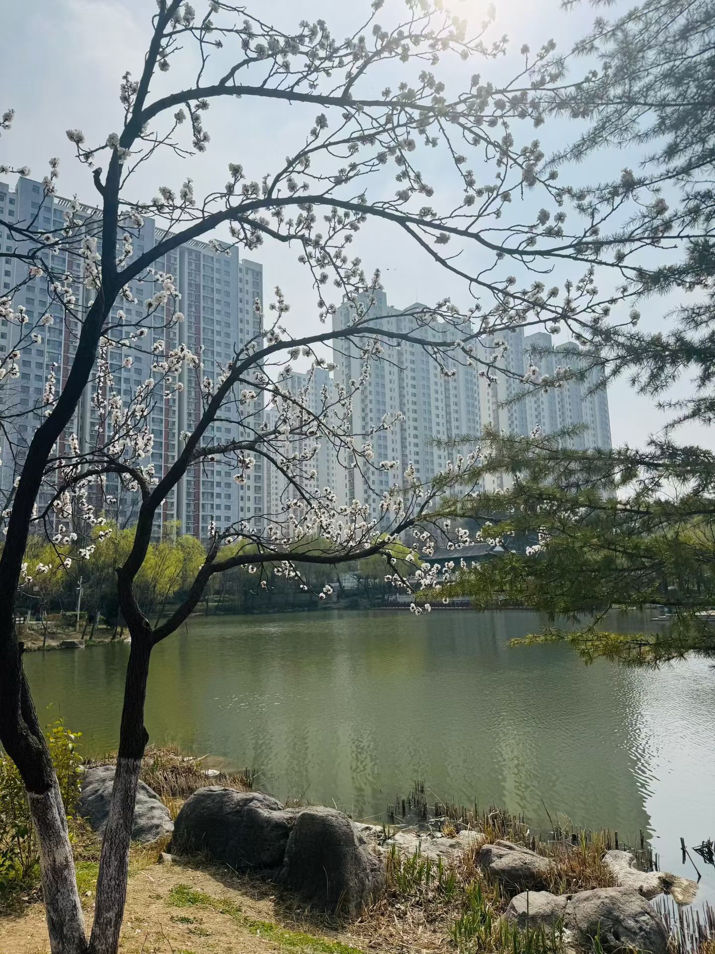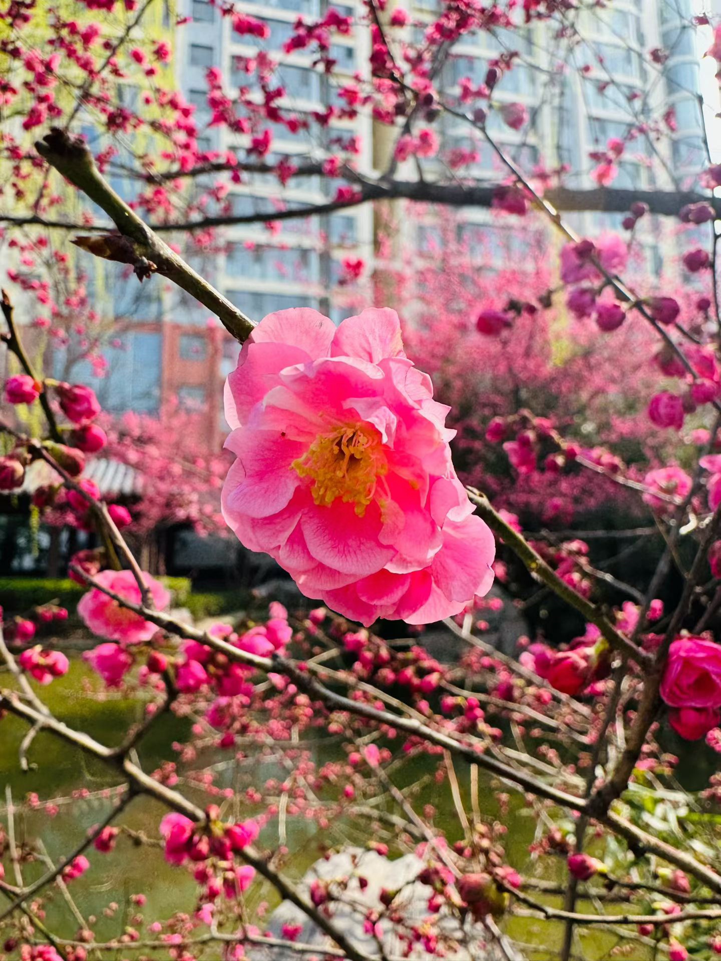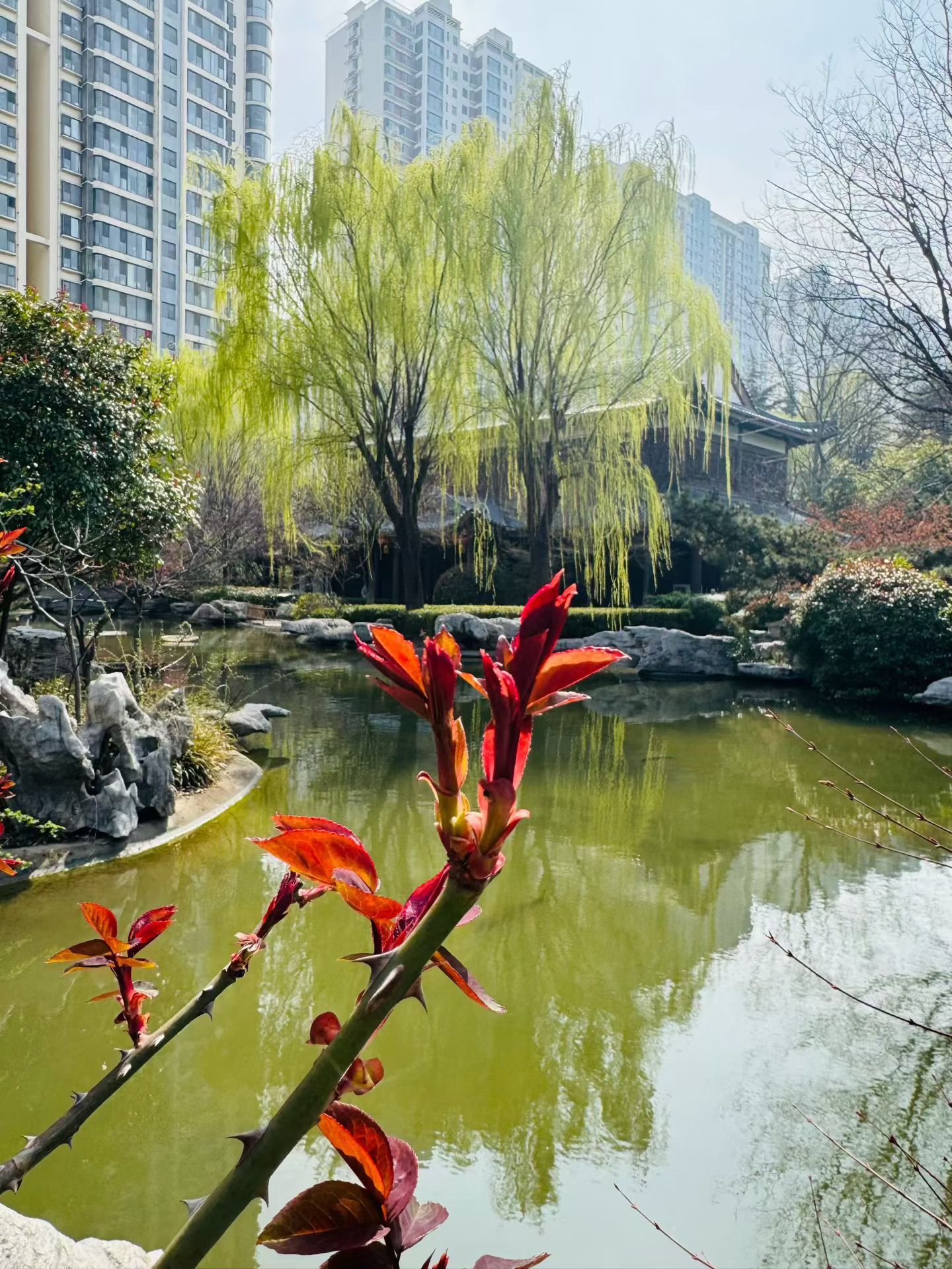 文案如下: 粉色的碧桃盛开在池塘边,与古老的建筑和绿色的植被相互映衬,构成了一幅美丽的画卷。