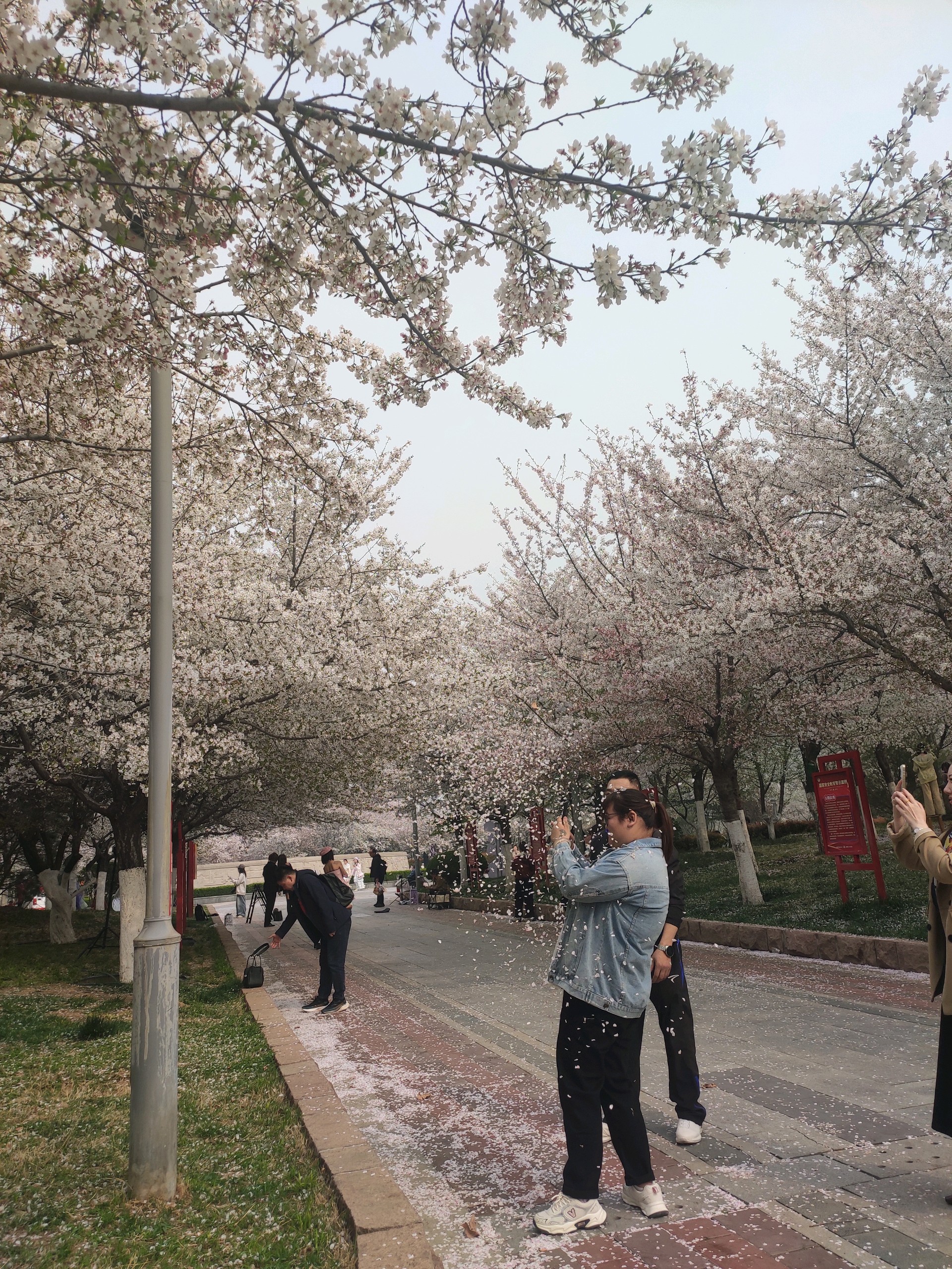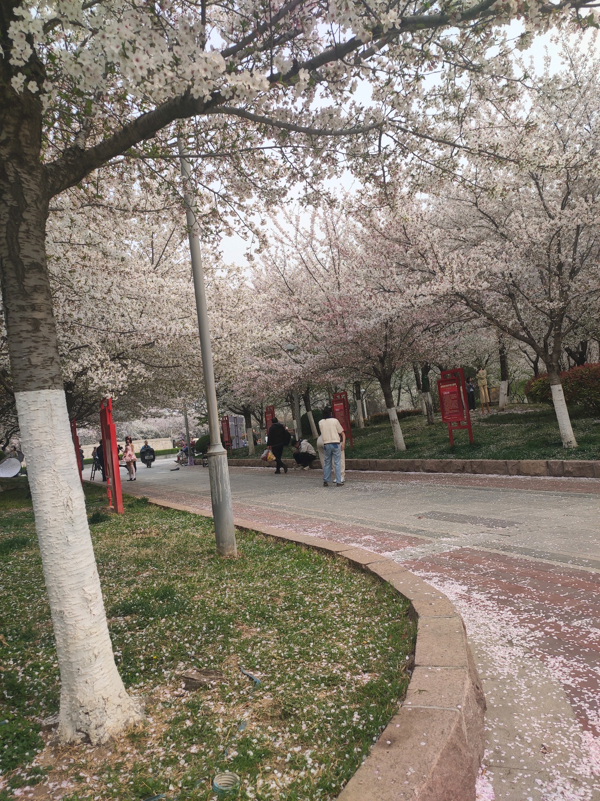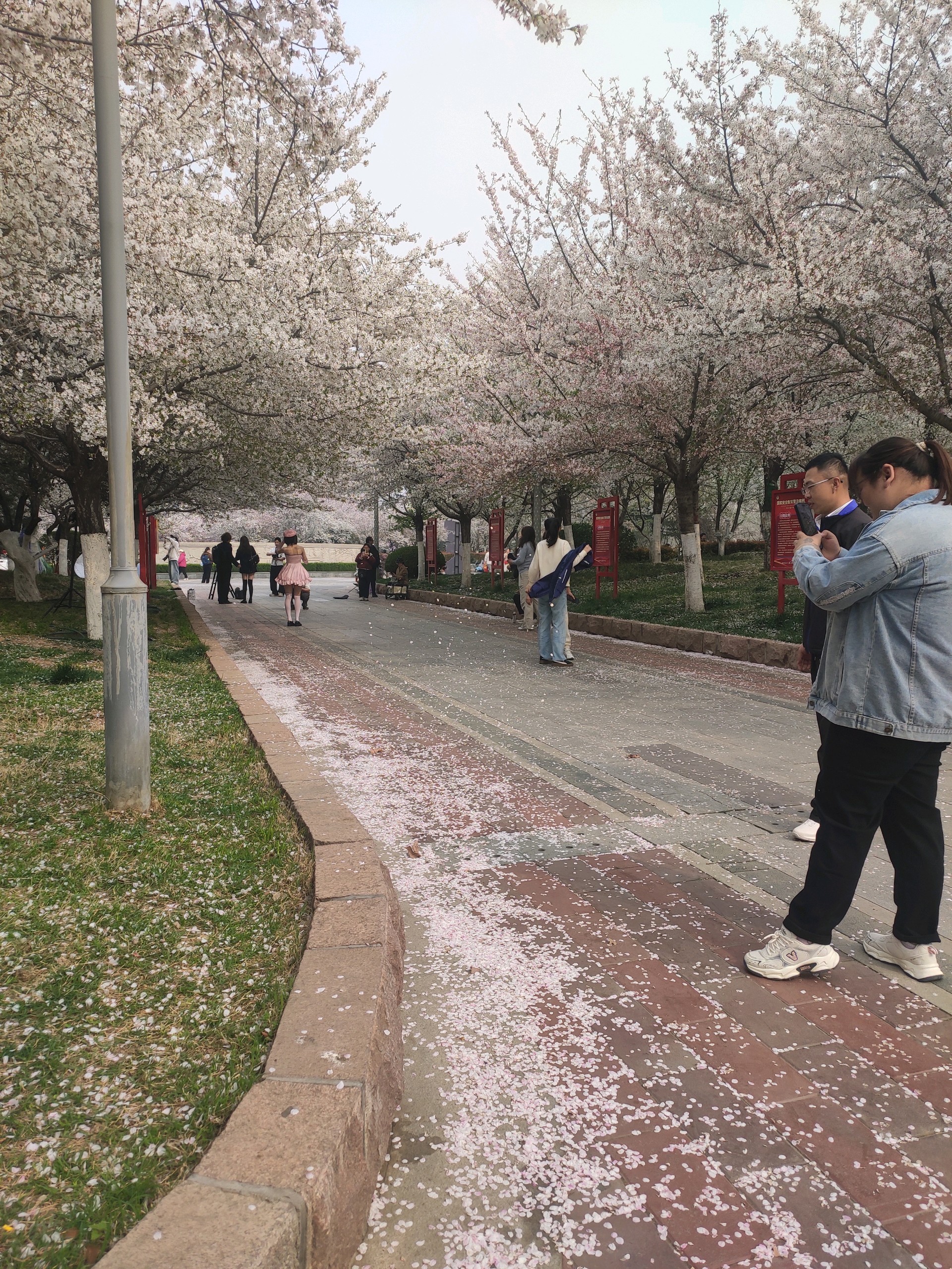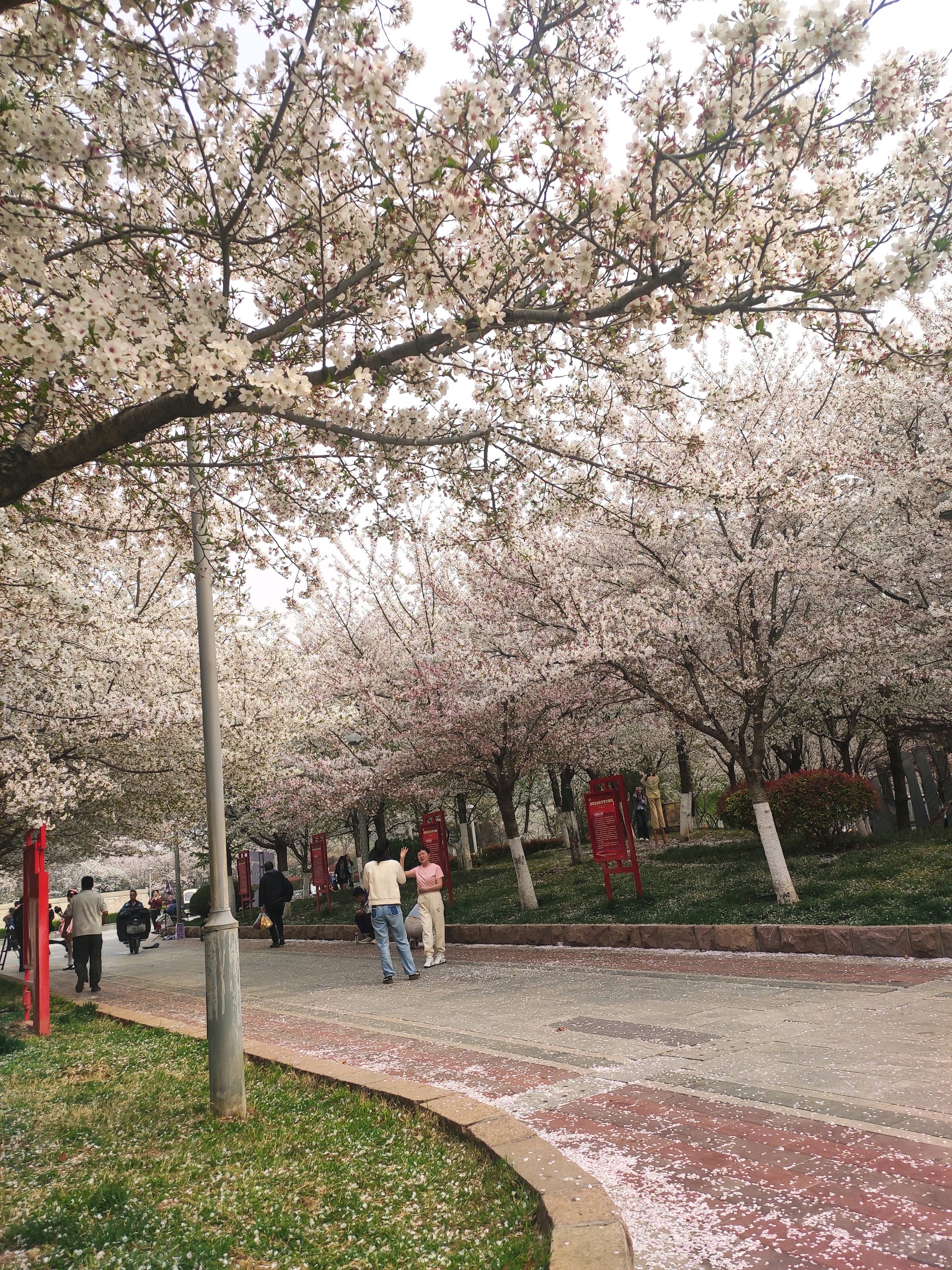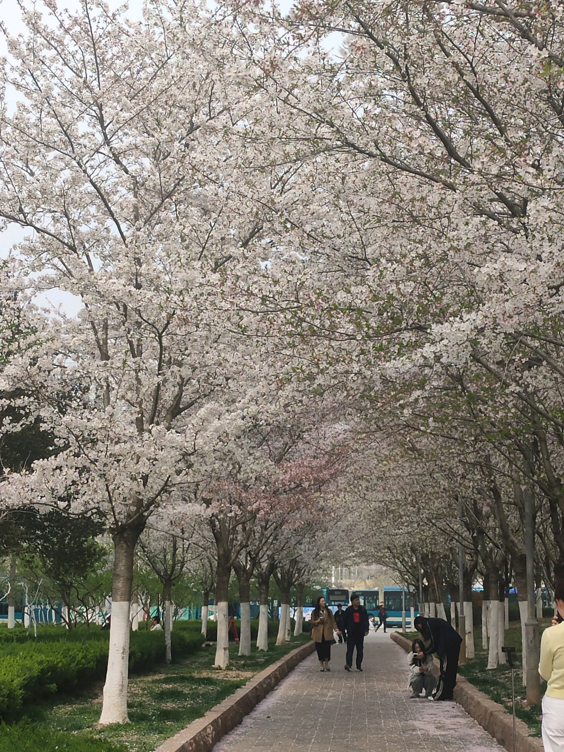 大明湖火车站广场,有几条樱花大道,直两旁开满了樱花,道中间樱花雨飘落,满地落花,简直美爆了。