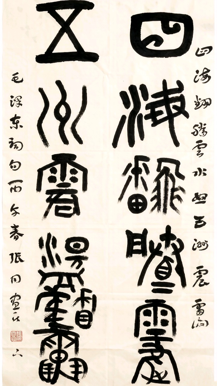 细观此作,大字篆书如泰山磐石,稳如昆仑。先生深得朱复戡一脉金石精髓,却又不囿于古法。那“五”字如巨斧劈山,横竖之间尽显力拔千钧;“海”字波涛汹涌,三点水化作浪花飞溅,仿佛真的听见了惊涛拍岸之声。墨色浓黑如漆,笔锋苍劲老辣,每一笔都饱蘸着岁月的沉淀。小字行草侧旁呼应,如溪流潺潺,温润而有力,与大字的雄浑形成绝妙对比。这哪里是写字?分明是将伟人诗词中那份“一万年太久,只争朝夕”的革命豪情,用最古老的篆书形式,重新熔铸进新时代的血脉。
