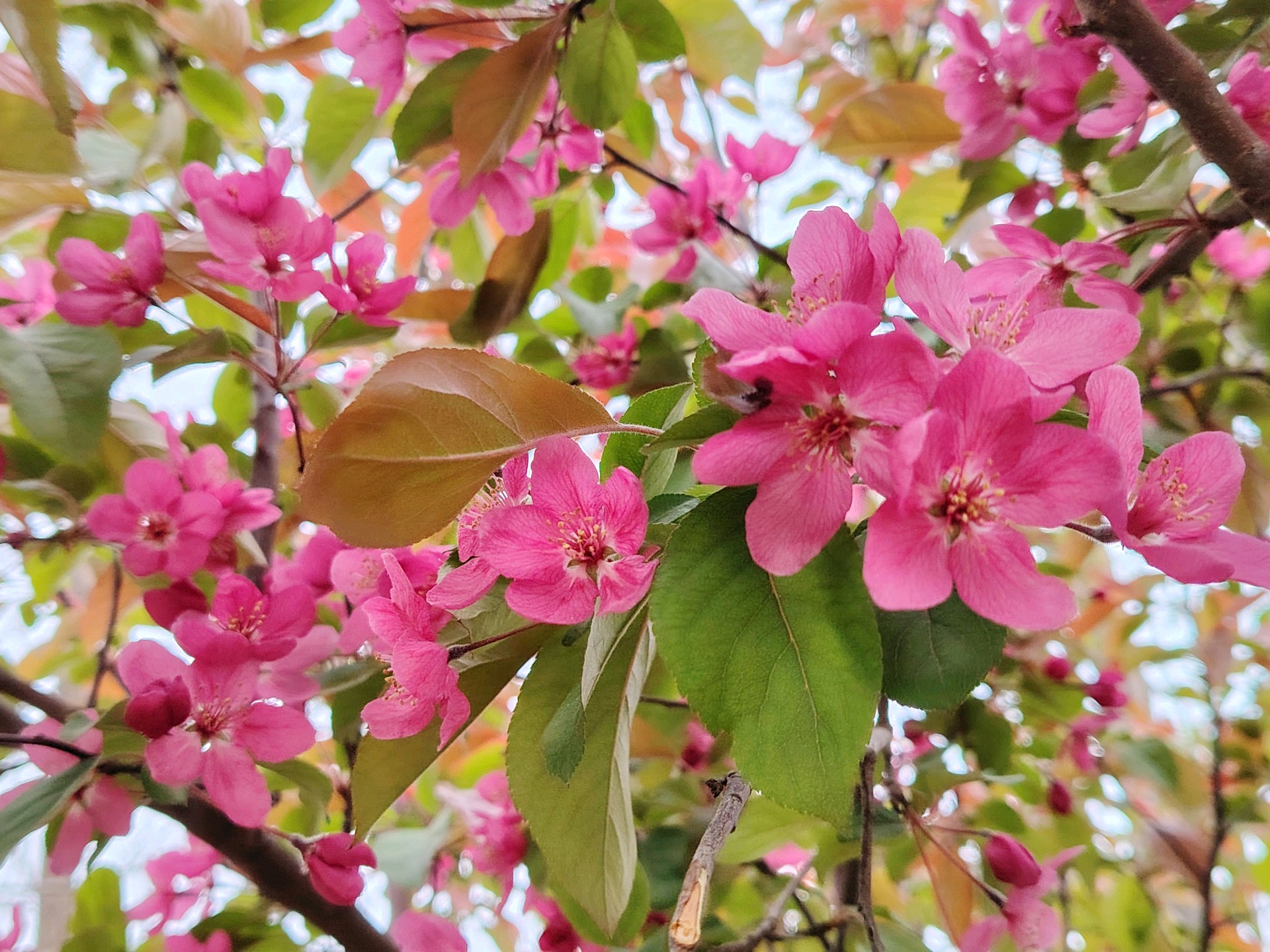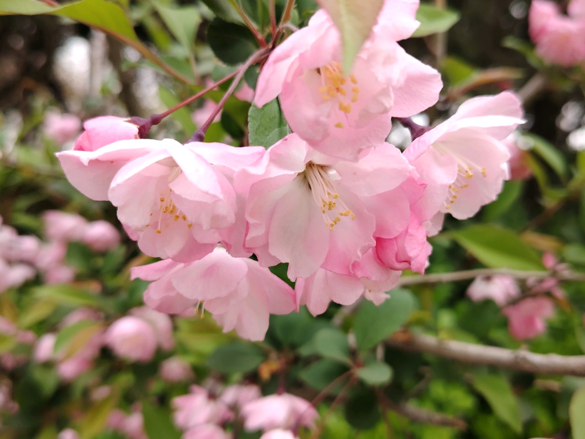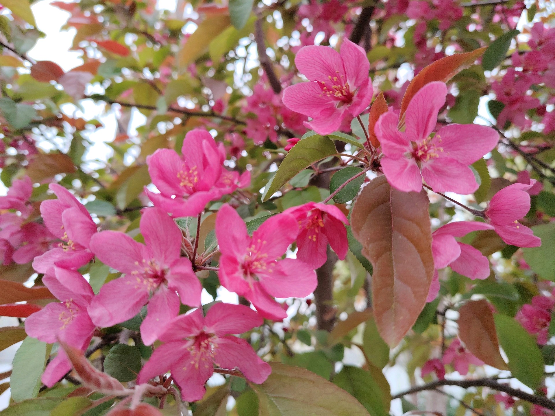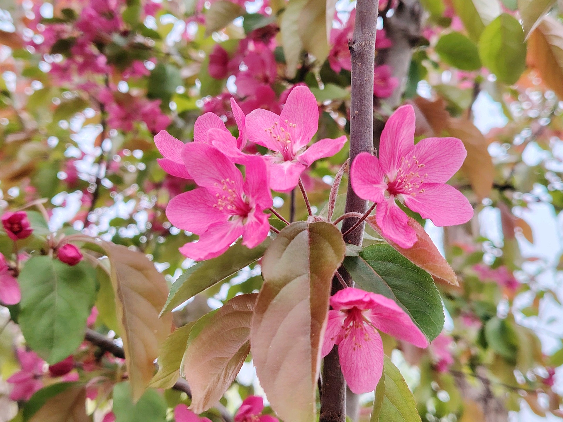 清晨,迎着初升的朝阳,一树树的海棠花迎风绽放,灿若云霞。