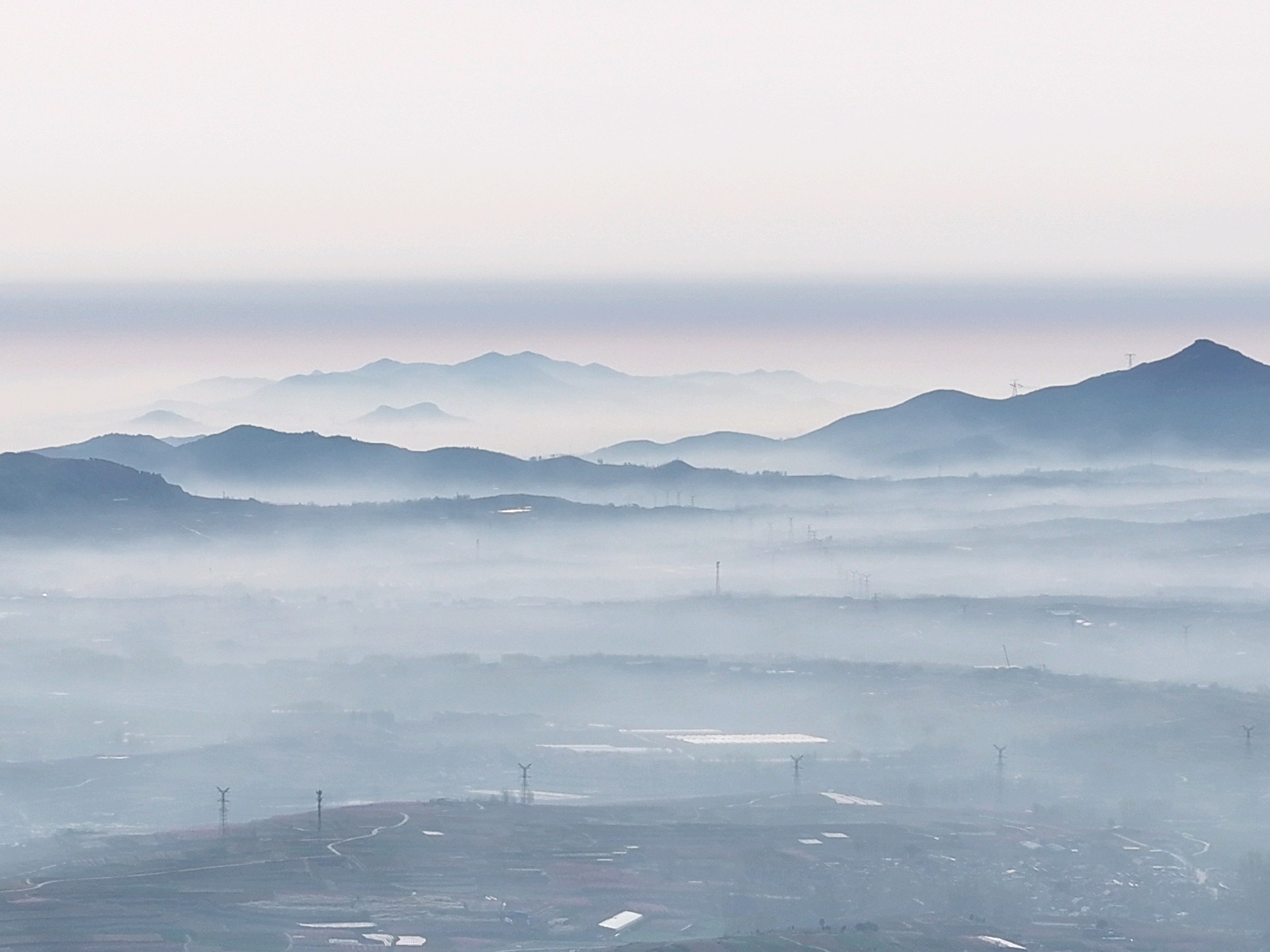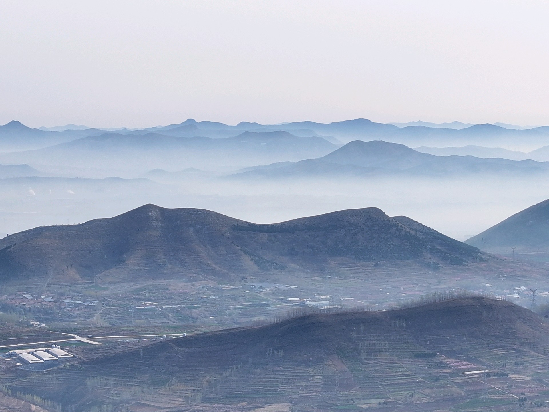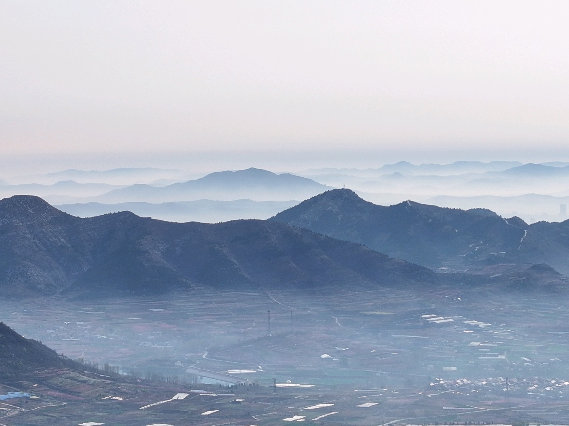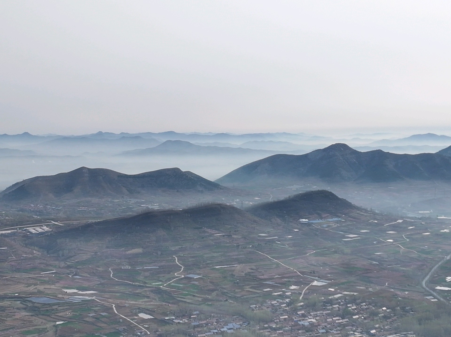 3月31日,春季时节,临沂市沂蒙山区雨后现美丽的平流雾景观。远山、村庄、小路、河流、城市,如同披上了一层薄薄的轻纱,在太阳的映照下,云雾缭绕宛若仙境!美不胜收。王东元 摄影
