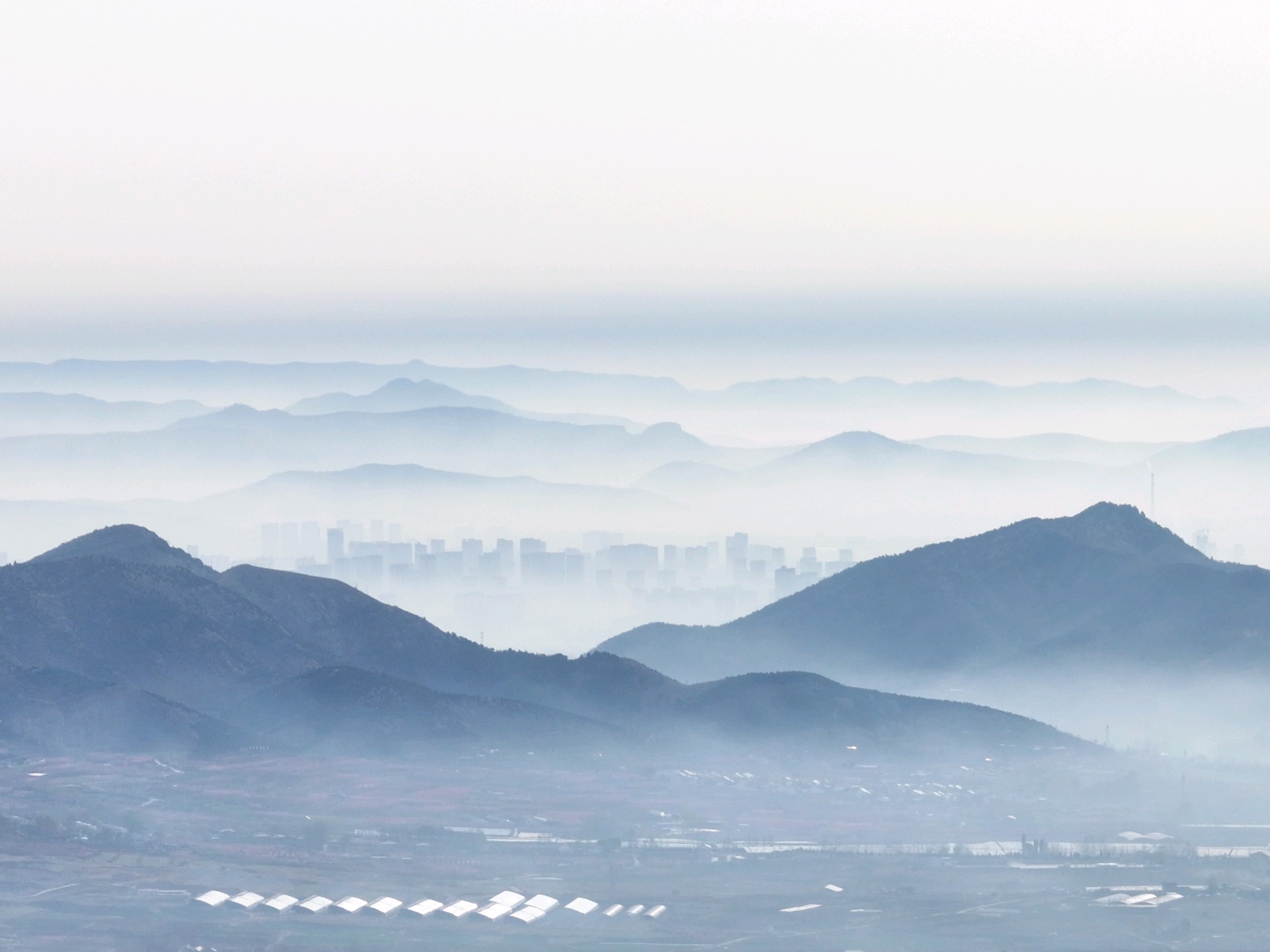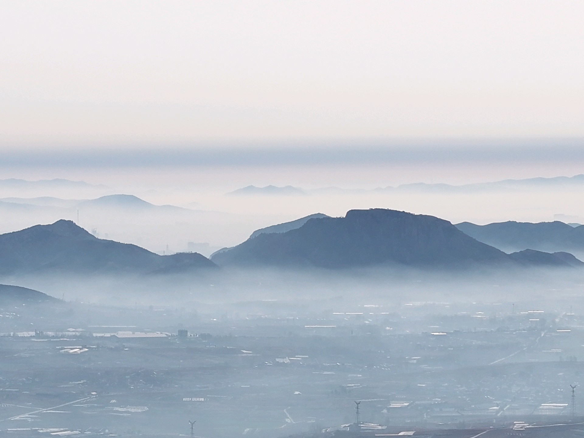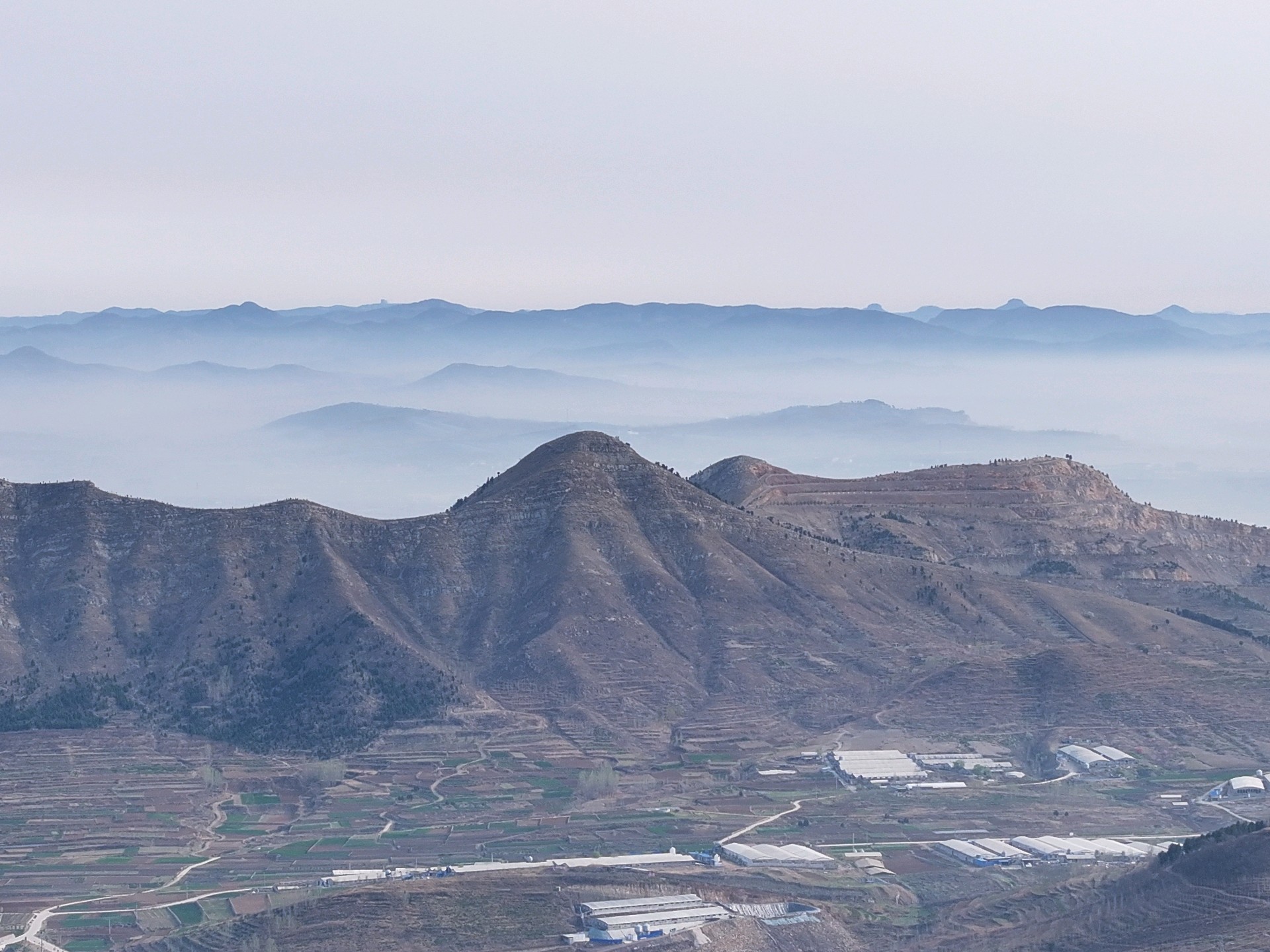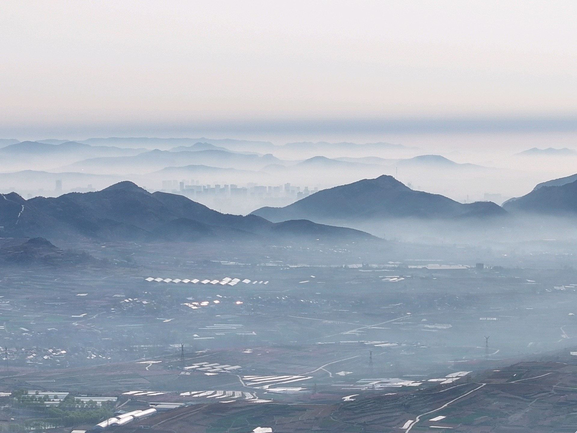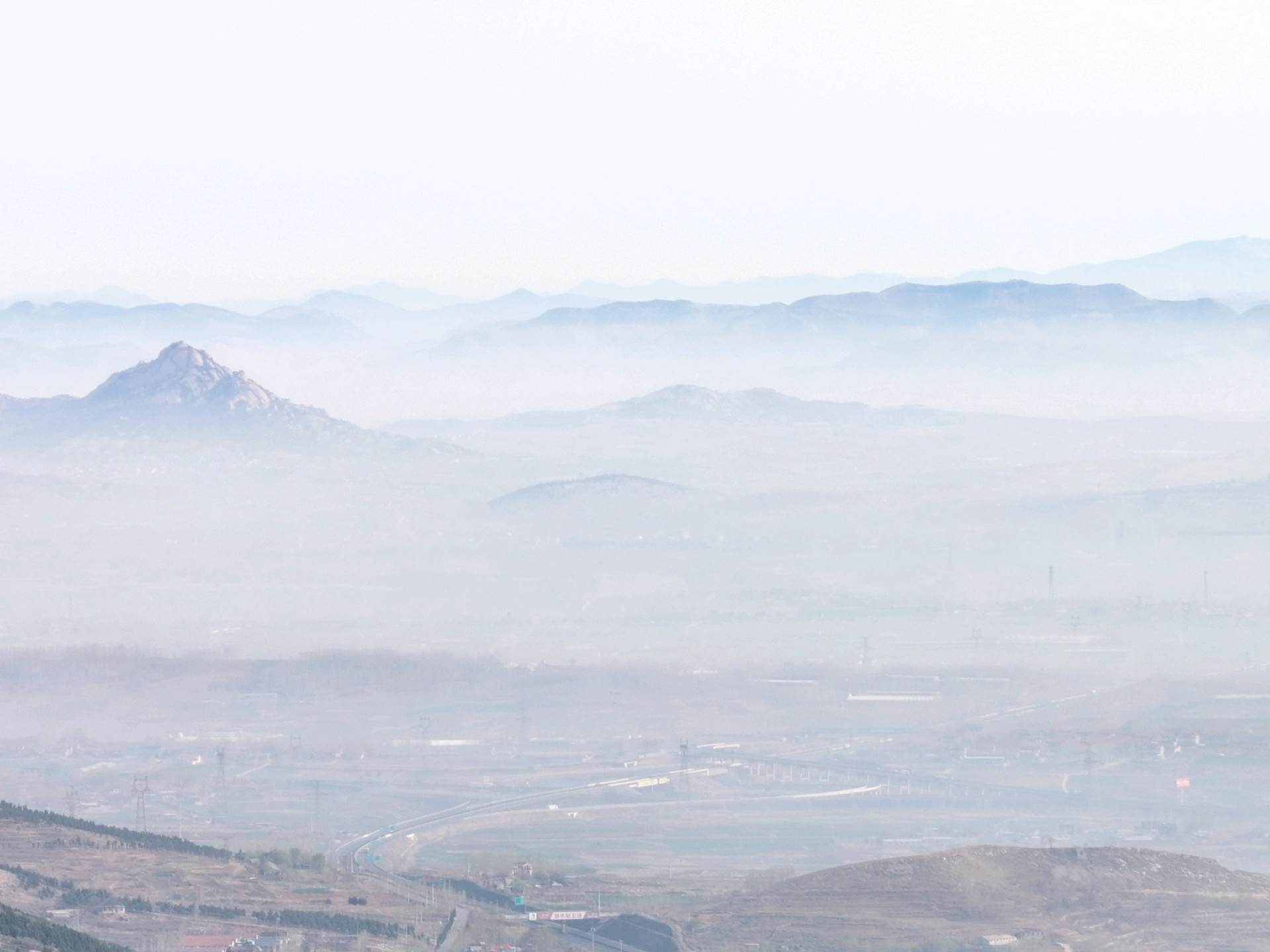 3月31日,春季时节,临沂市沂蒙山区雨后现美丽的平流雾景观。远山、村庄、小路、河流、城市,如同披上了一层薄薄的轻纱,在太阳的映照下,云雾缭绕宛若仙境!美不胜收。王东元 摄影
