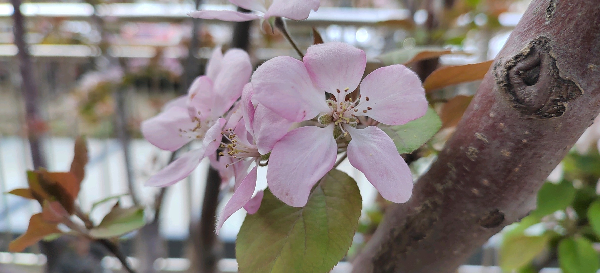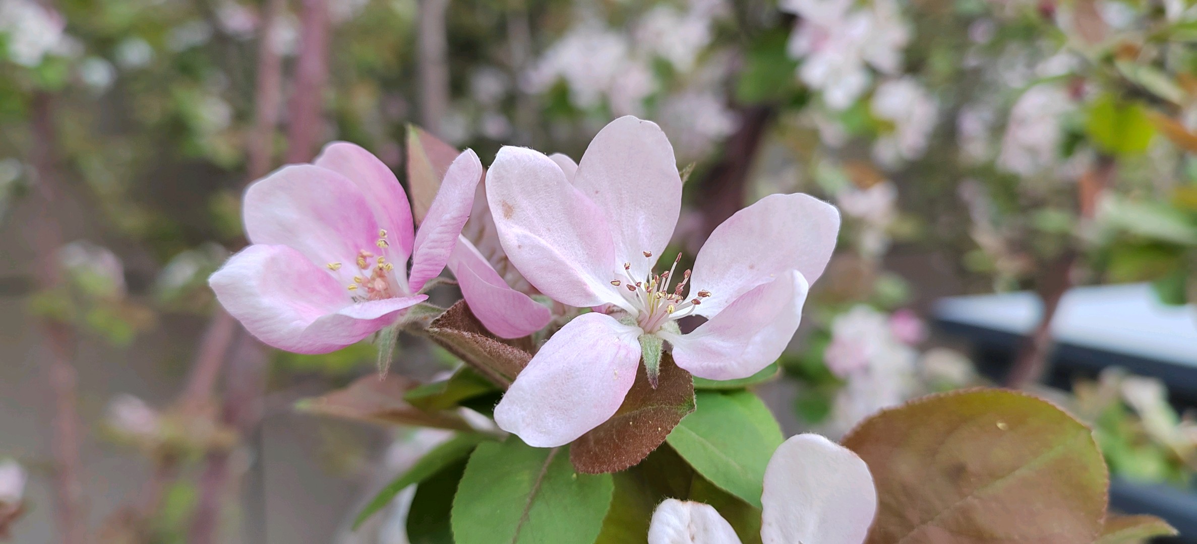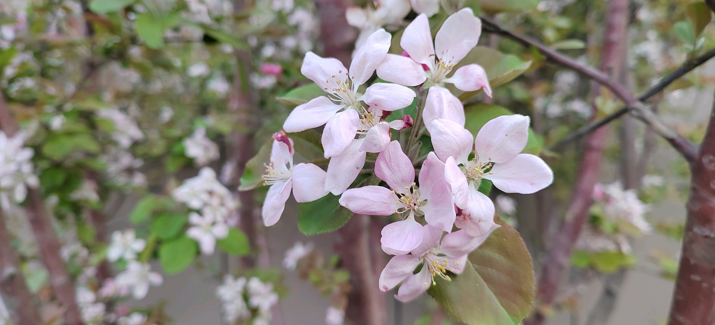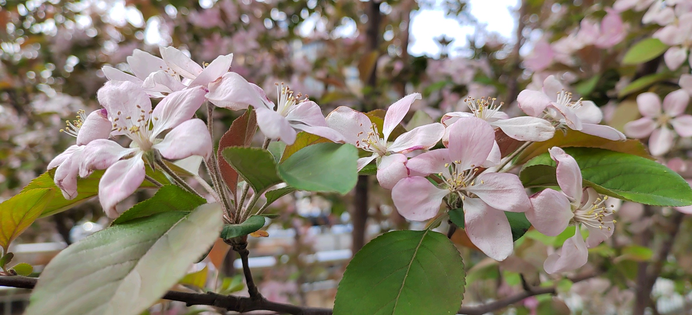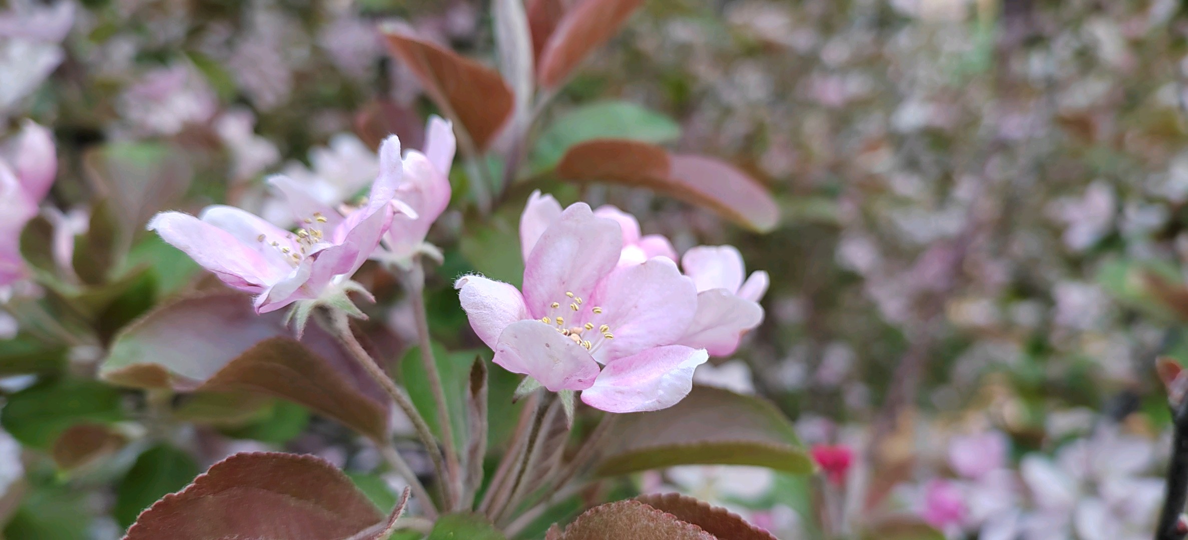 绚丽海棠是蔷薇科、苹果属北美海棠的栽培品种。落叶小乔木,树势强,树姿直立,树形圆而紧凑,树干棕红色,皮孔大而多。枝条斜出,小枝紫红色,老枝红褐色。嫩叶紫红色,逐渐变为翠绿色;叶卵圆形至椭圆形,先端短尖,基部圆形或宽楔形,边缘具钝锯齿。总状伞形花序,花期4月中下旬,花蕾深紫红,花深粉红色,杯状,花开繁密而艳丽,花梗紫红色,密被柔毛,半直立。果期6-10月,果锥形,橘黄或枯红色,果顶尖,萼片宿存直立,挂果期可长达数月。