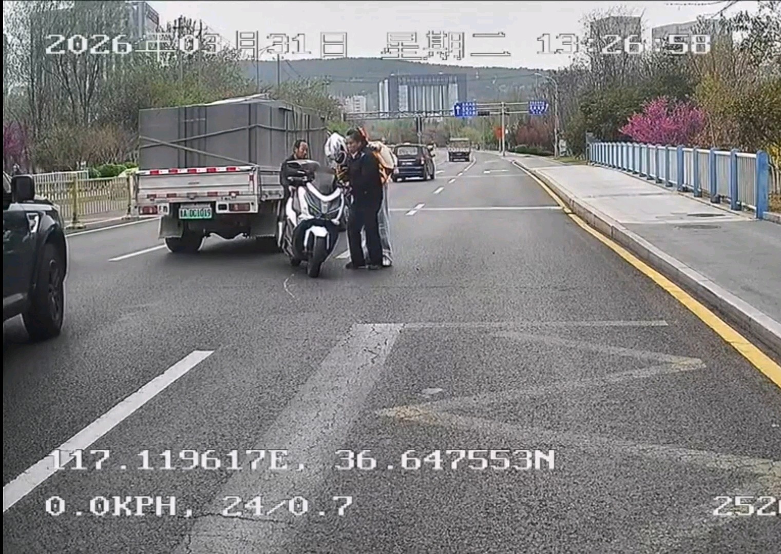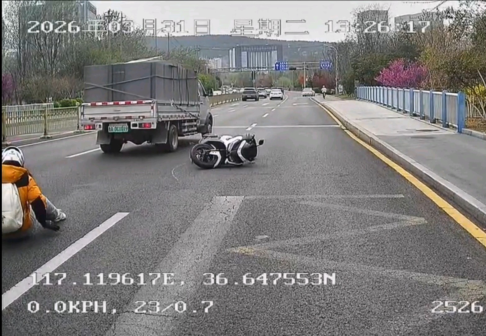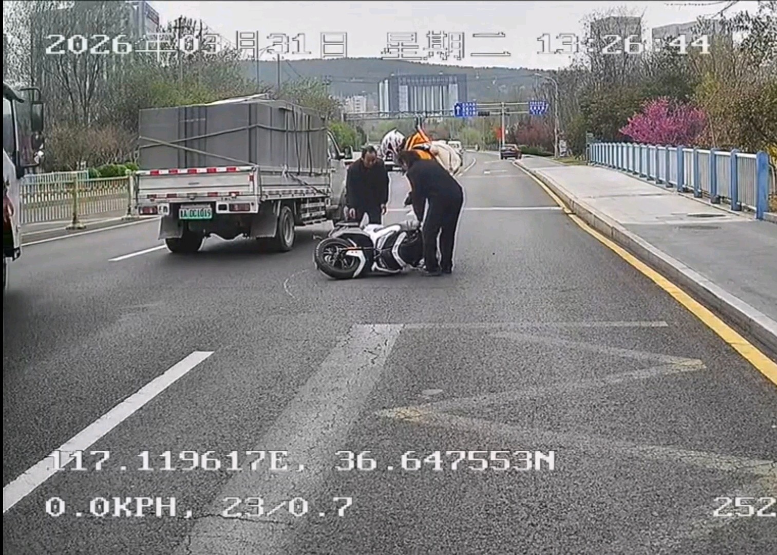 3月31日13时26分许,552路驾驶员柏静驾驶公交车行驶至旅游路奥体东路时,突发惊险一幕:一辆摩托车与小货车发生碰撞,摩托车重重摔倒并滑出数米远,现场情况紧急。