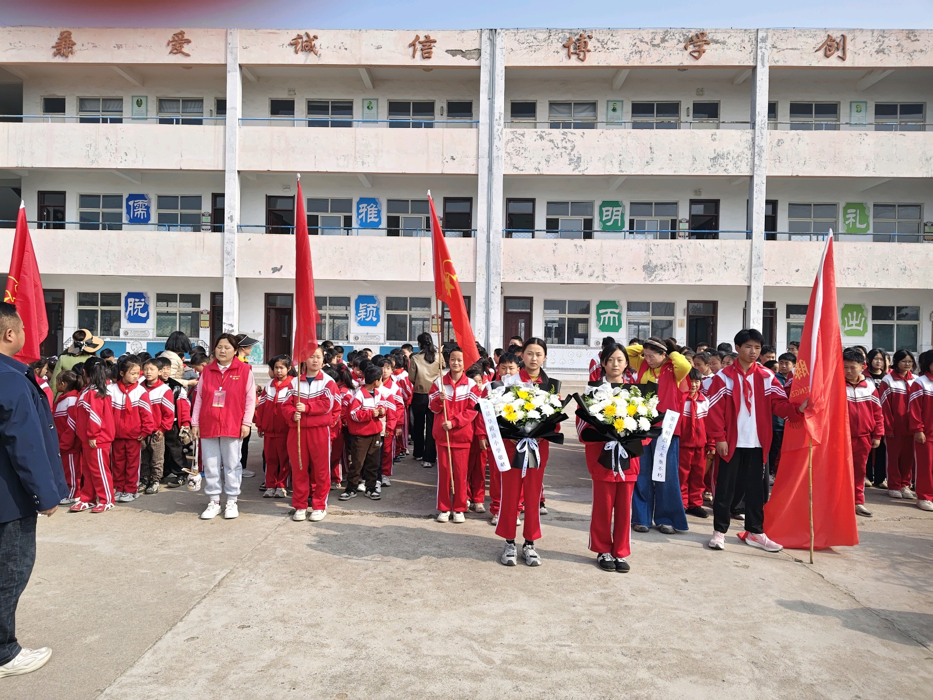 列队肃立,心怀崇敬 清晨的阳光洒满场地,全体师生身着整洁校服,手持洁白祭菊,神情庄重。师生们整齐列队,面向纪念碑肃然伫立,在《义勇军进行曲》的激昂旋律中,开启这场庄重的追思之旅 。 默哀寄思,致敬英魂
