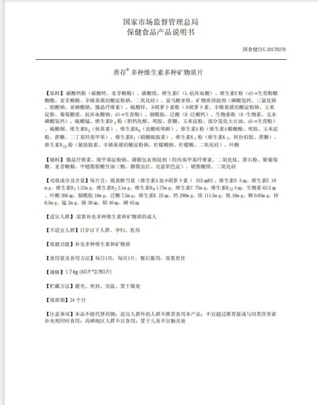 第二:该产品善存多种维生素多种矿物质片 国食健注G20170278 40粒和80粒为同品,不存在商品信息与实物不符 本店提供了,药监局备案资料,以上资料均可以证明 产品为同一产品,我们已经致电了国家市场监管总局询问,询问该产品发货给买家是否存在违规。平台表示,产品为同一产品,页面有标注即可,平台可以拨打国家食品药品监督管理局的电话号码是12331 也可以通过信件核实情况