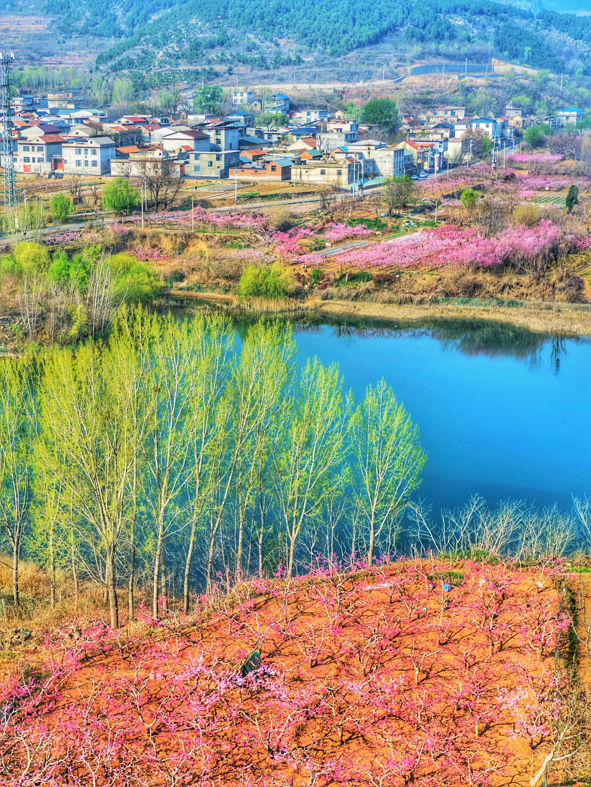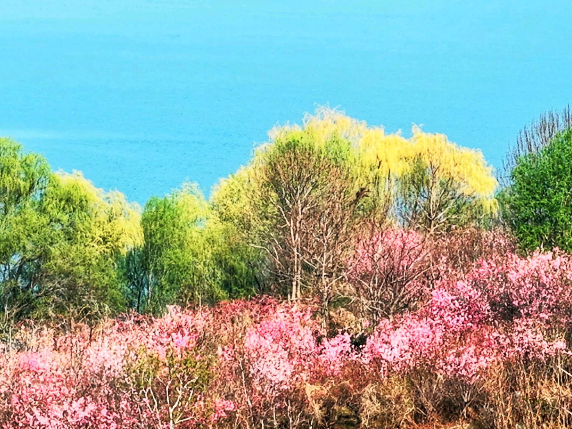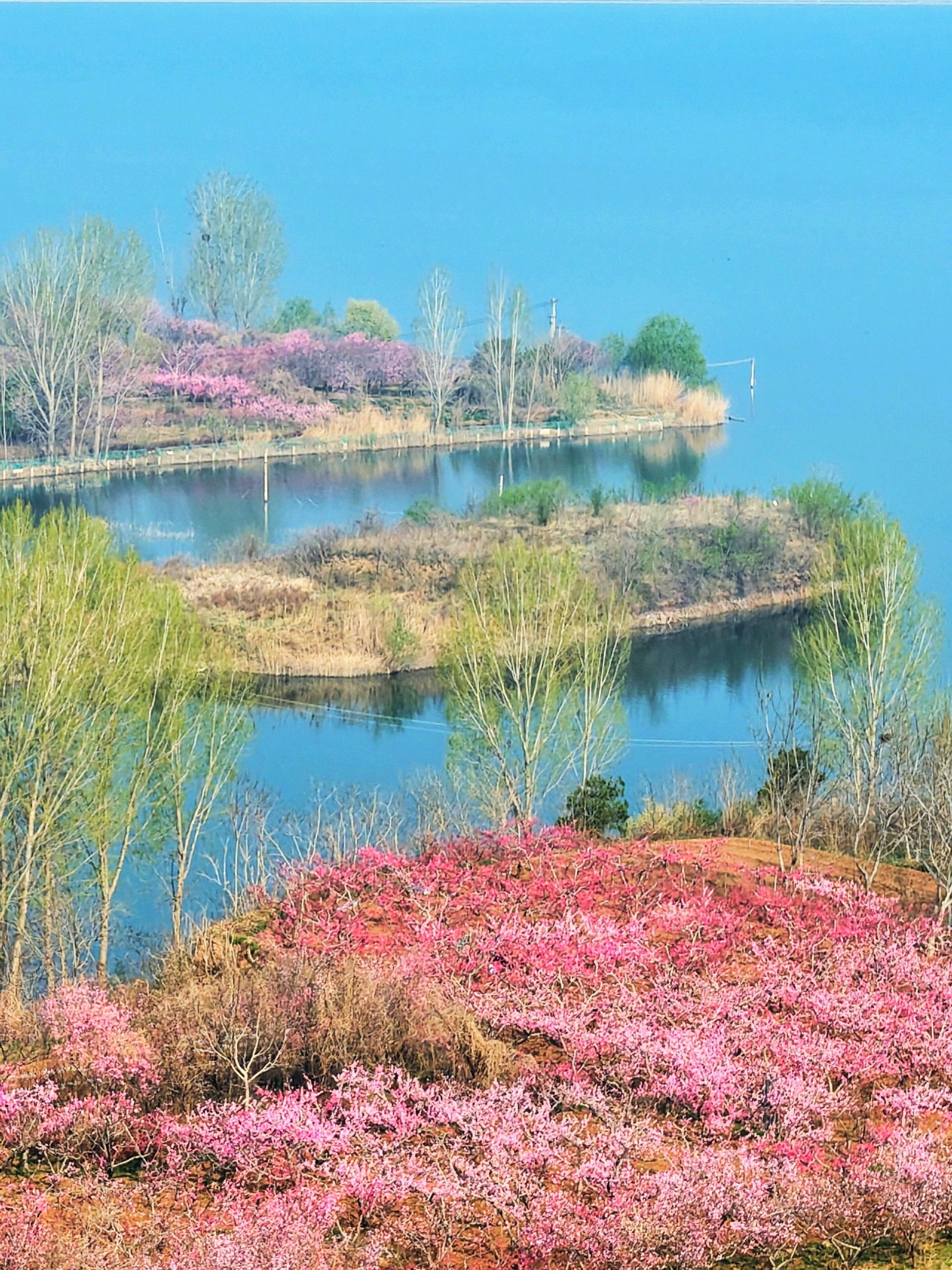 春风漫过济南的山野,把一湖碧水染成澄澈的蓝,把漫山桃林晕成粉霞的海。柳丝抽新绿,繁花缀枝头,远山含黛,村落安然。每一缕风都裹着花香,每一眼望都是春日限定的浪漫,这是泉城独有的、温柔又热烈的人间四月天。 ——拍摄于卧虎山水库