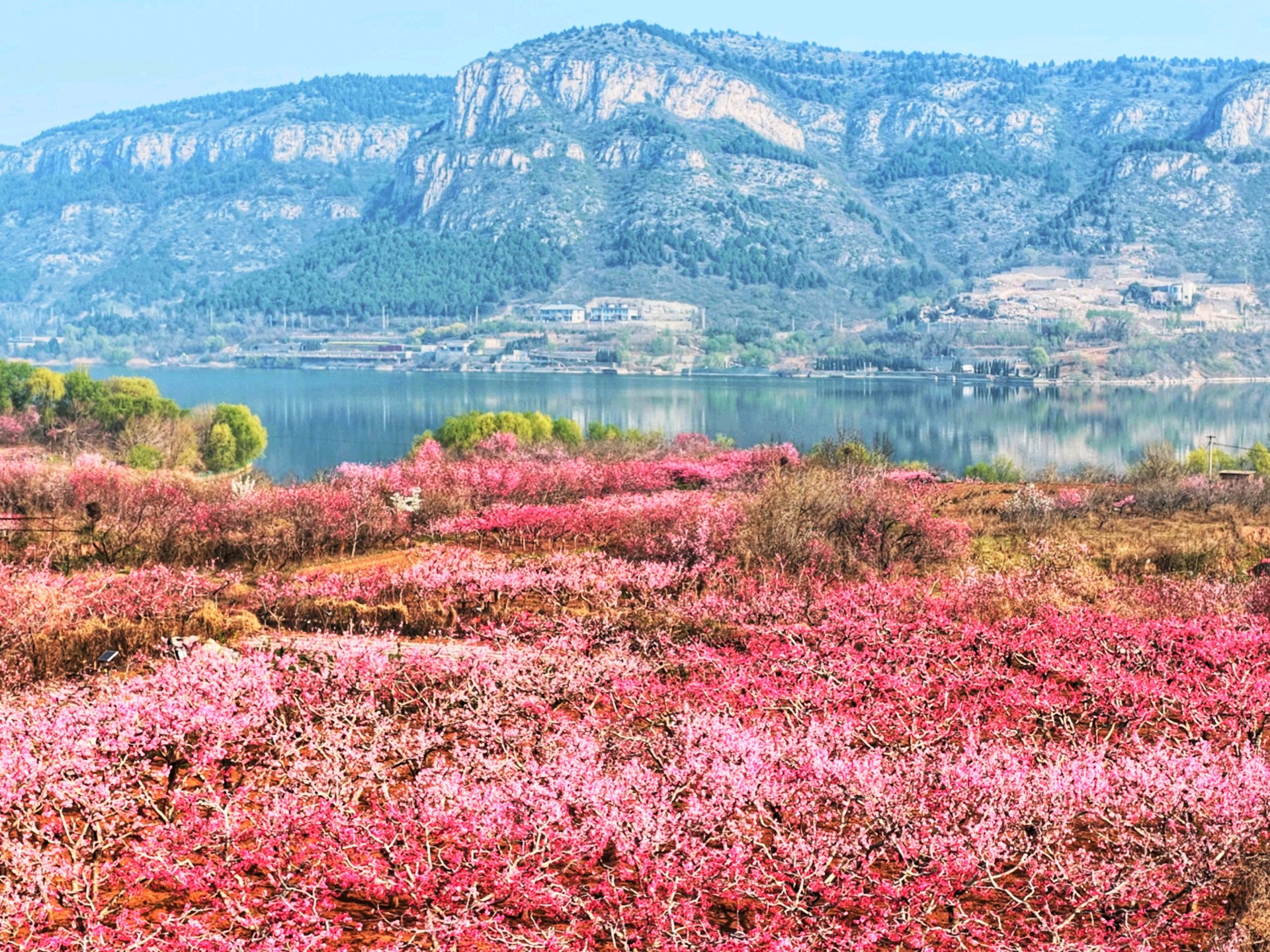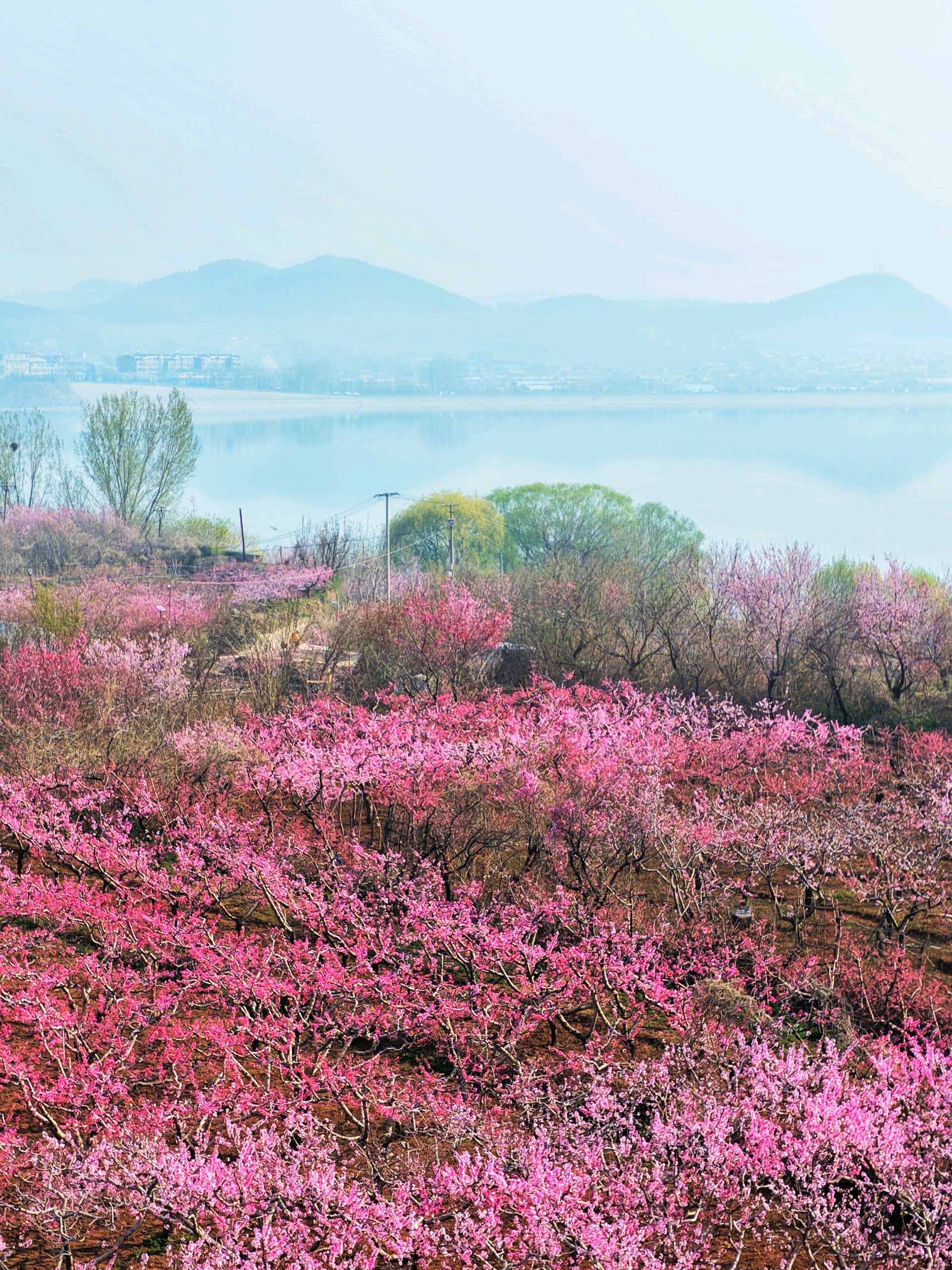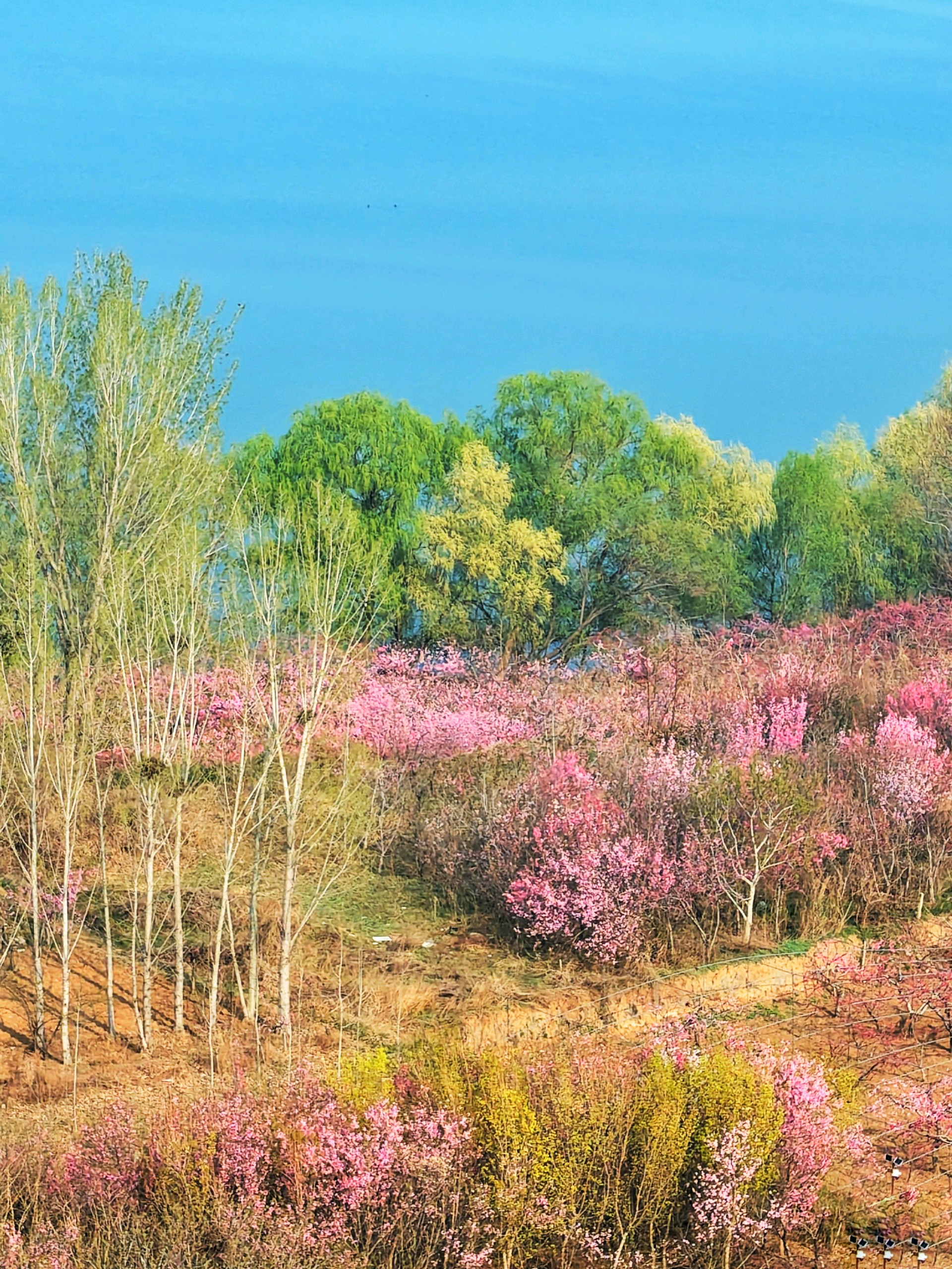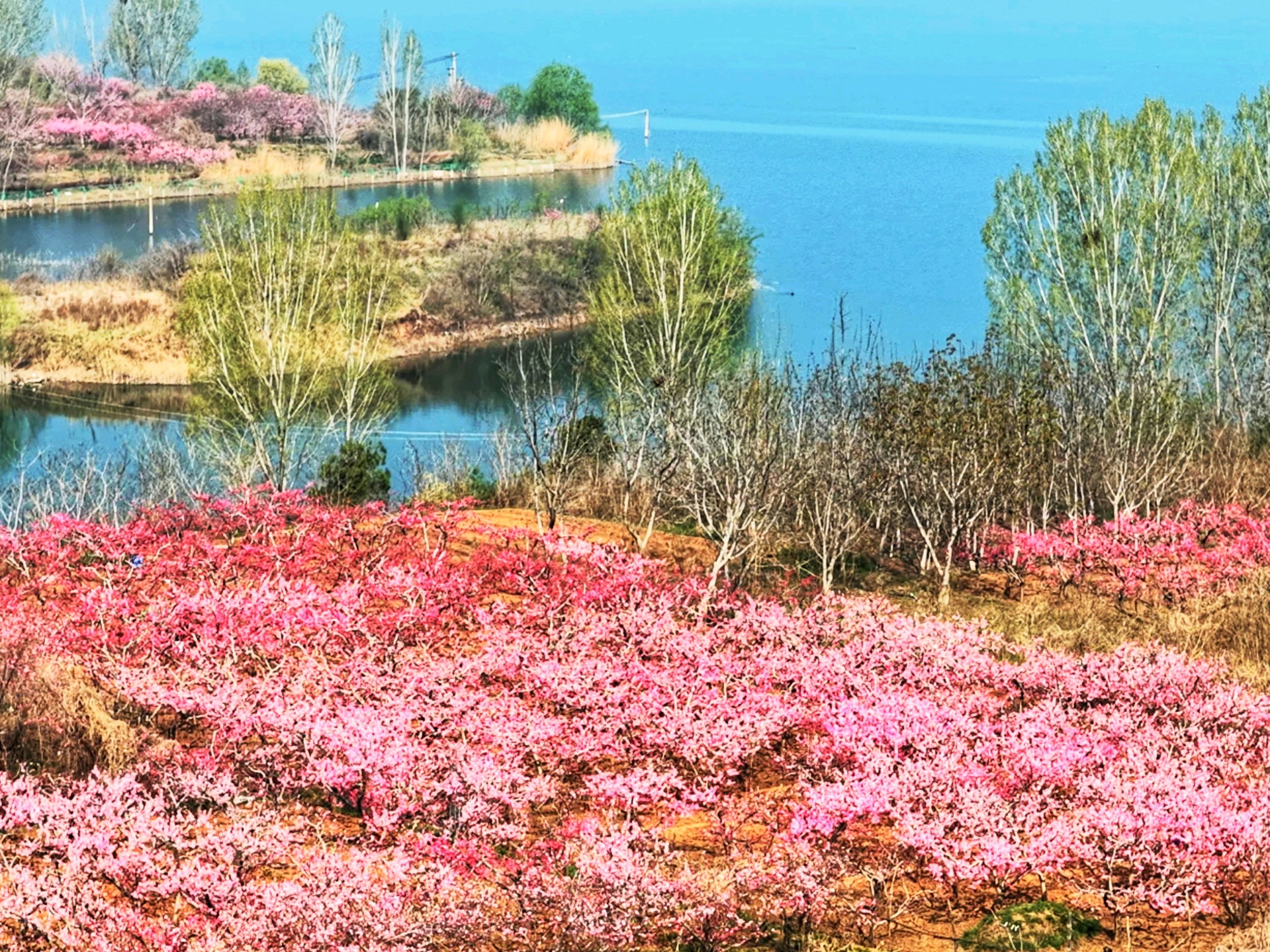 春风漫过济南的山野,把一湖碧水染成澄澈的蓝,把漫山桃林晕成粉霞的海。柳丝抽新绿,繁花缀枝头,远山含黛,村落安然。每一缕风都裹着花香,每一眼望都是春日限定的浪漫,这是泉城独有的、温柔又热烈的人间四月天。 ——拍摄于卧虎山水库