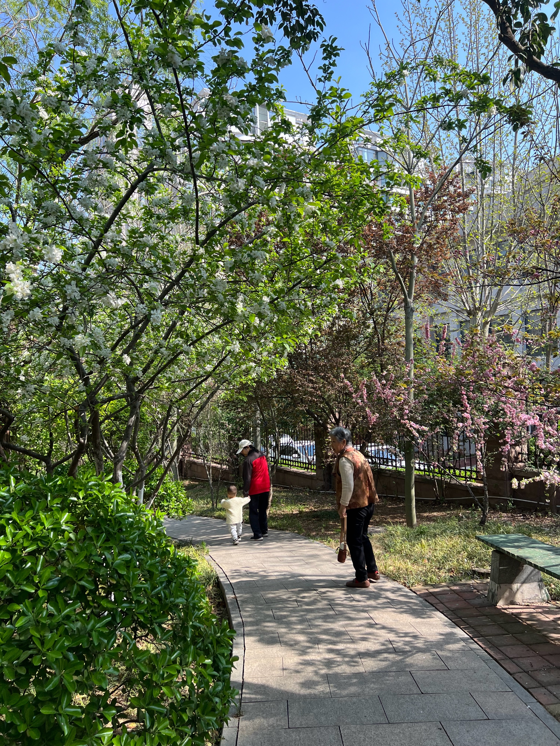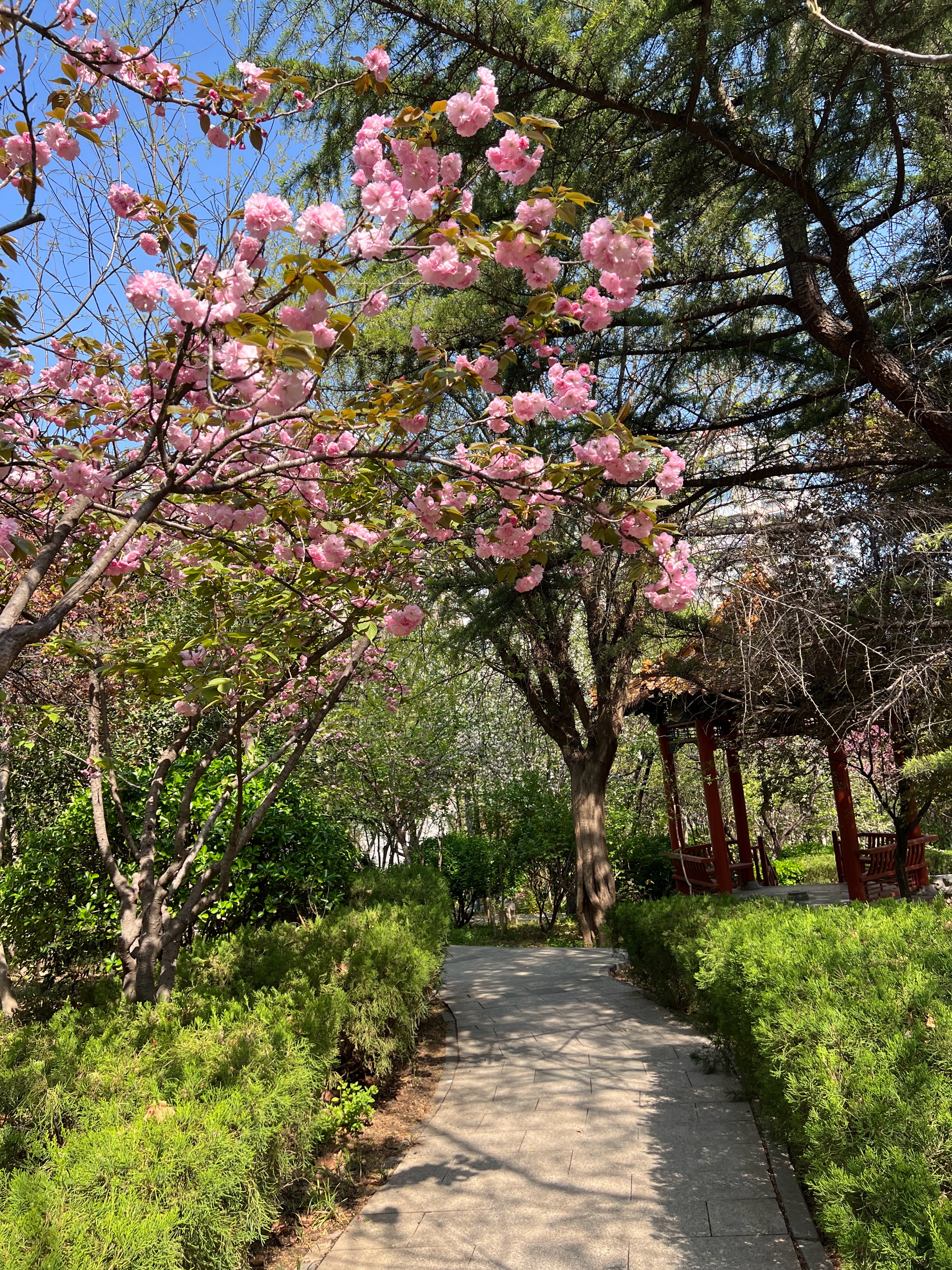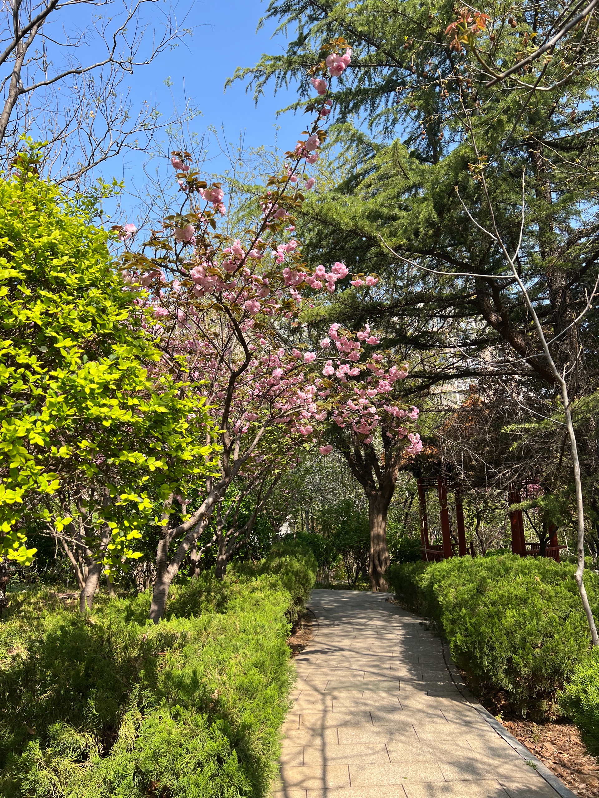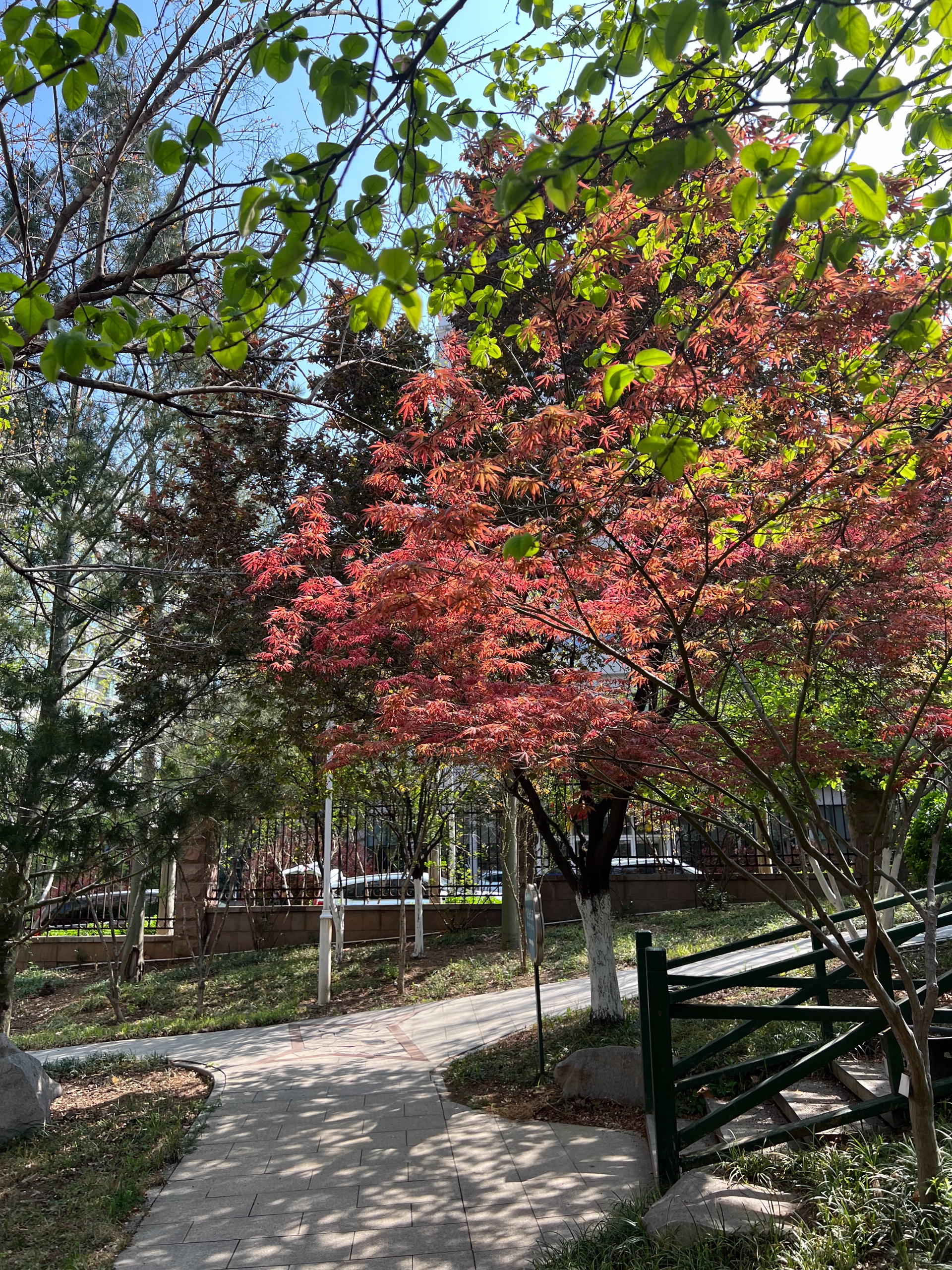 花红叶绿景色秀丽,蓝天为底色勾勒出美丽的画卷,小区春色满园随拍