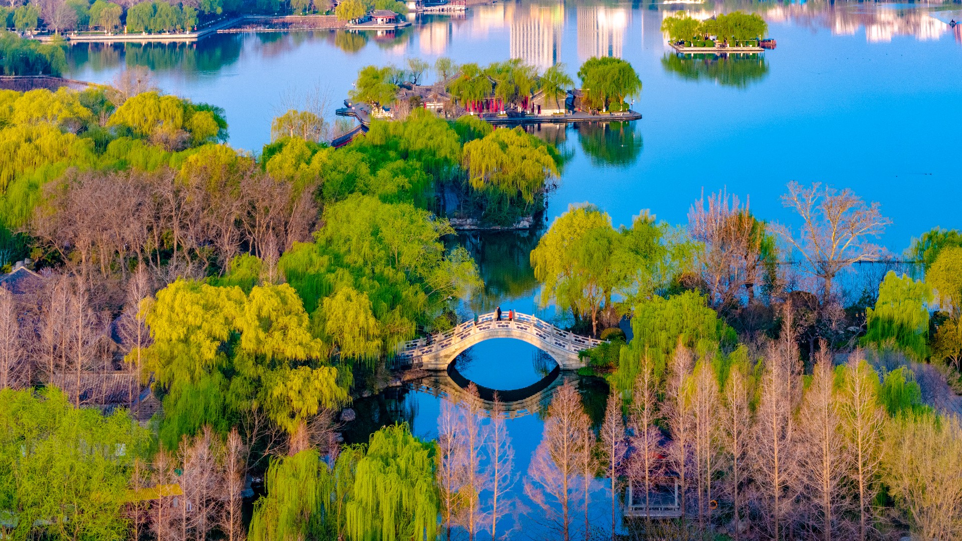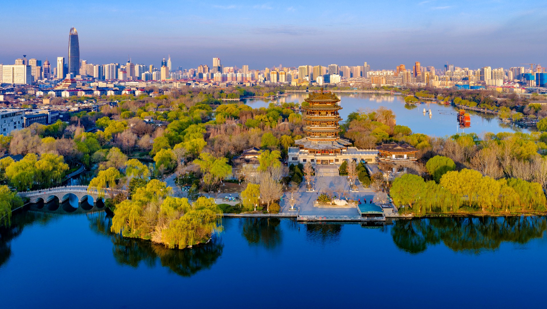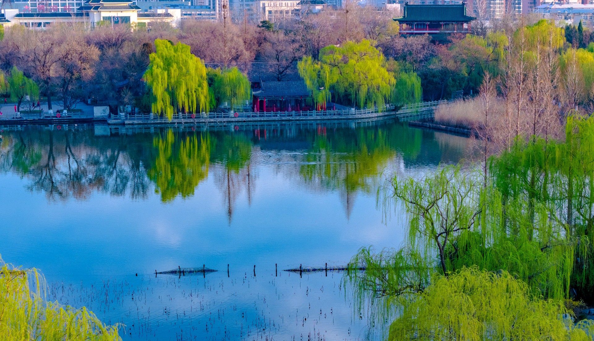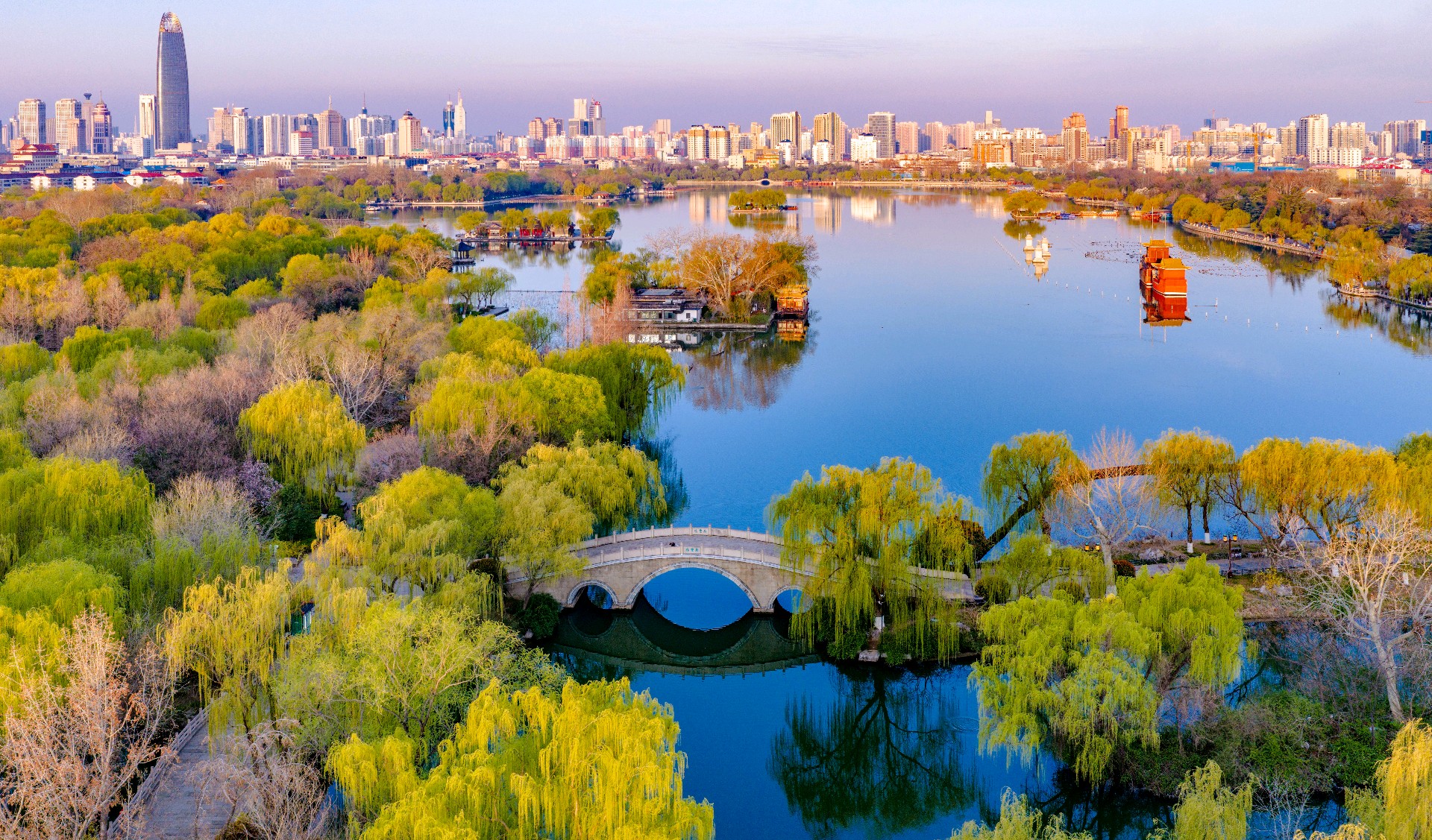 清晨的大明湖,朝阳初升,晨光洒满湖面,湖水澄澈清亮。新柳依依拂水,繁花次第开放,亭台小桥倒映水中,景致如画。空气清新沁人,市民悠然漫步,在晨光春色里,尽享泉城独有的宁静与美好。