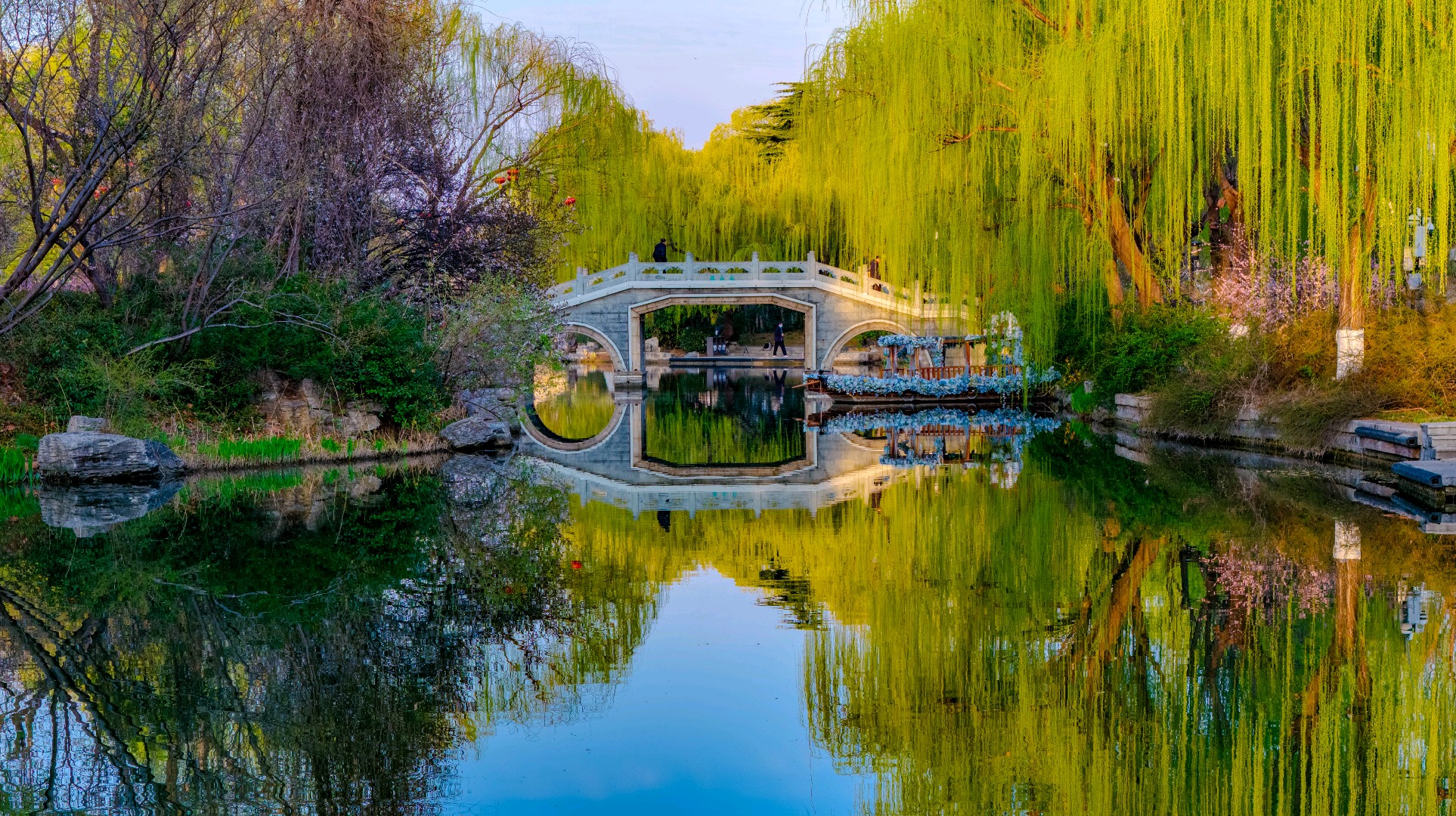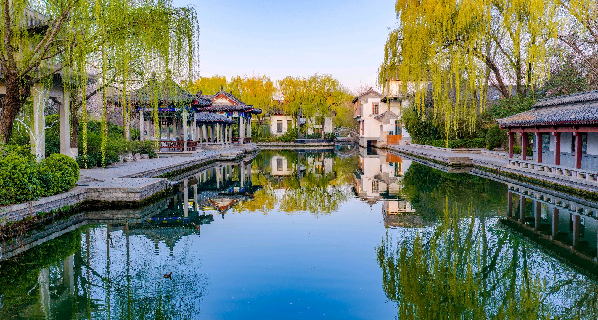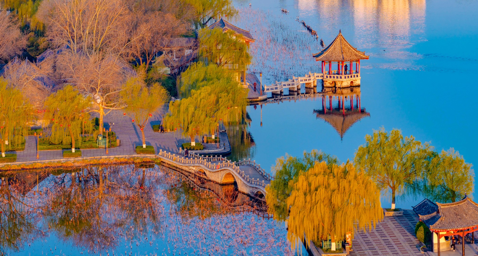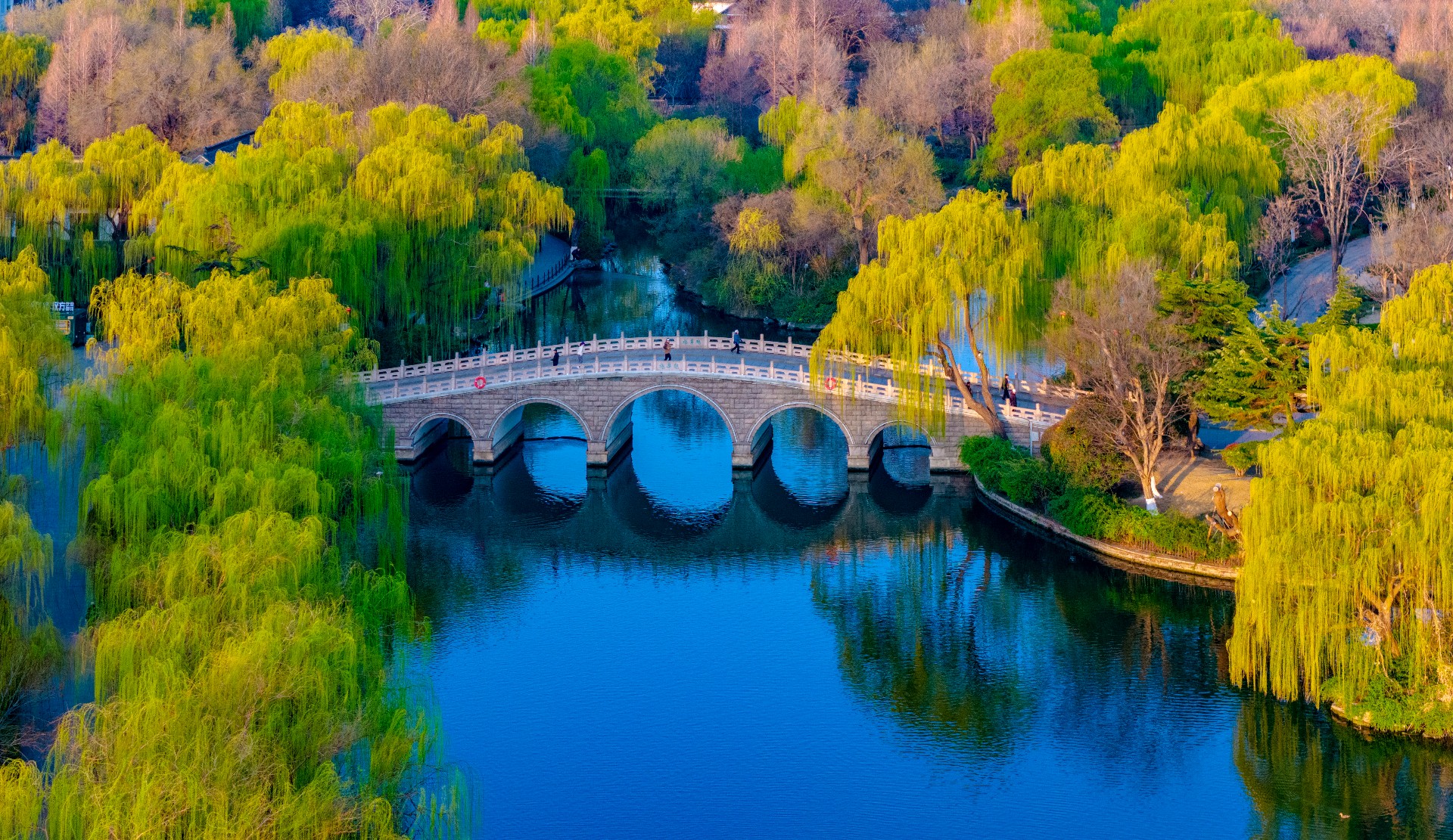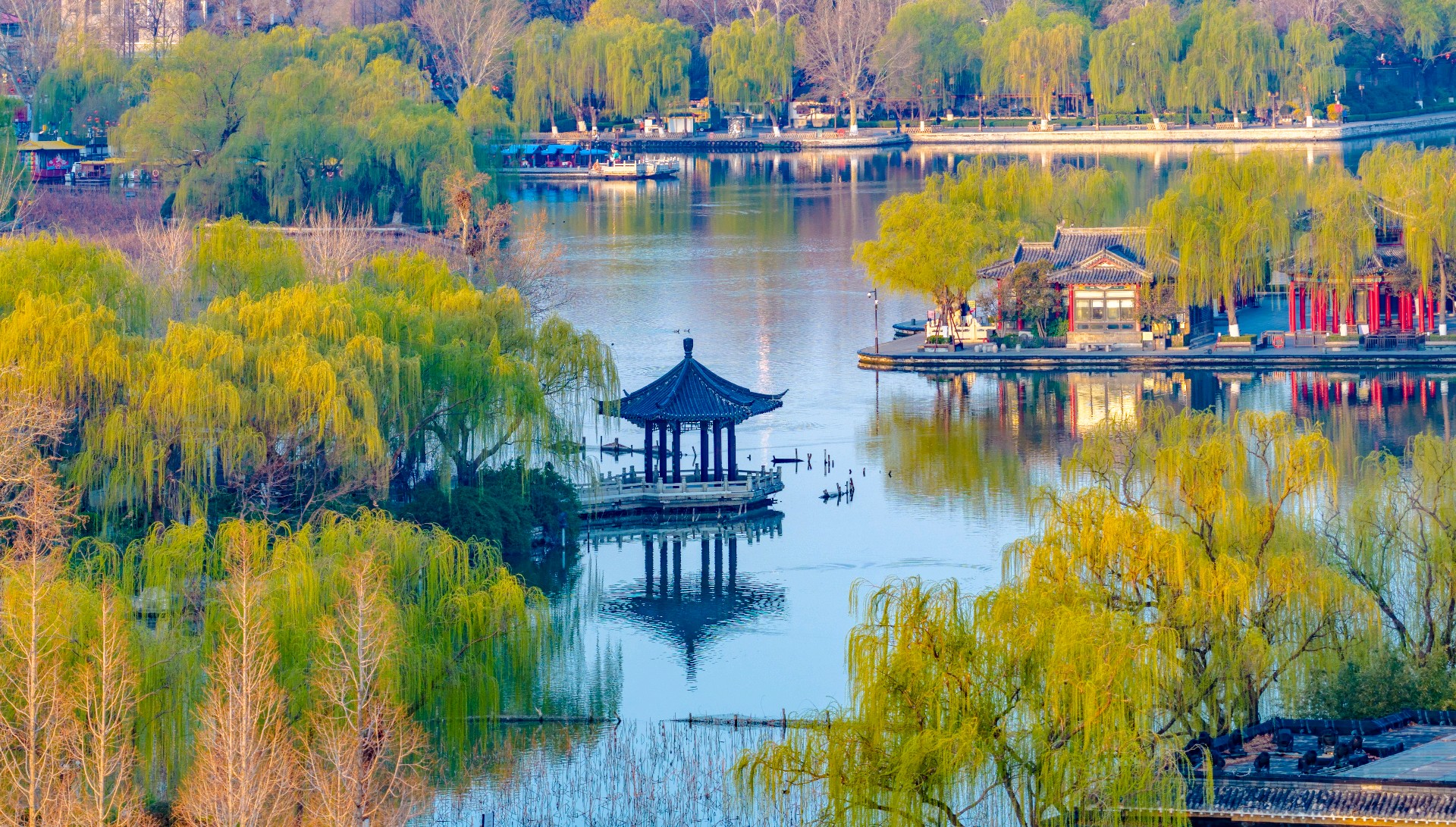 清晨的大明湖,朝阳初升,晨光洒满湖面,湖水澄澈清亮。新柳依依拂水,繁花次第开放,亭台小桥倒映水中,景致如画。空气清新沁人,市民悠然漫步,在晨光春色里,尽享泉城独有的宁静与美好。