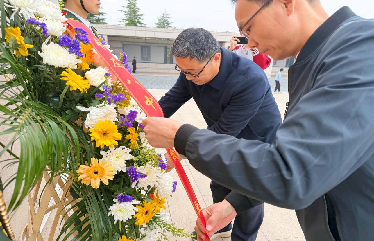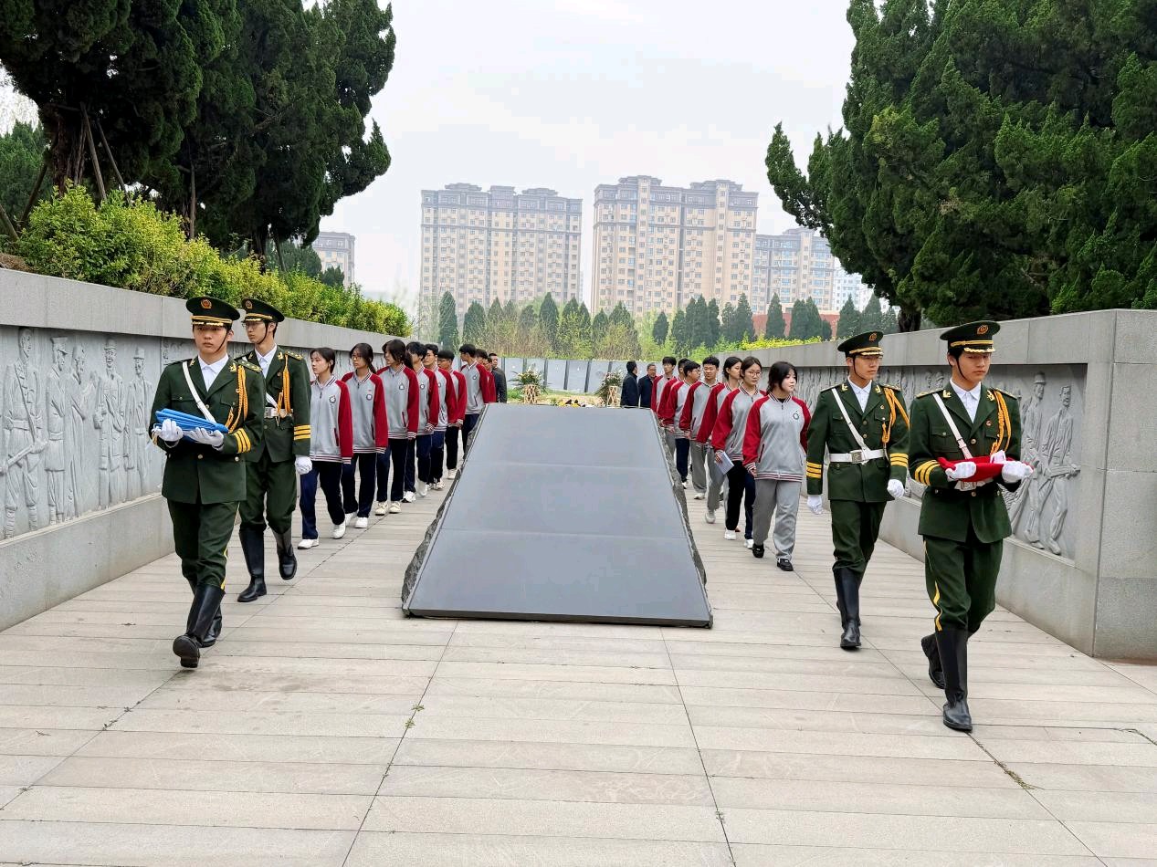 随后,四名团员代表手抬精心准备的花圈,缓步走向烈士纪念碑,郑重将花圈敬献于碑前,花圈上的挽联寄托着全校师生对英烈的无限敬仰与深切哀思。校团委郝书记及高二年级谢主任缓步上前,仔细整理花圈缎带,表达对革命先烈的崇高敬意。仪式上,团员代表面向团旗,高举右拳,重温入团誓词,铿锵有力的誓言在陵园上空回荡,彰显着新时代青年团员坚定的理想信念与责任担当。