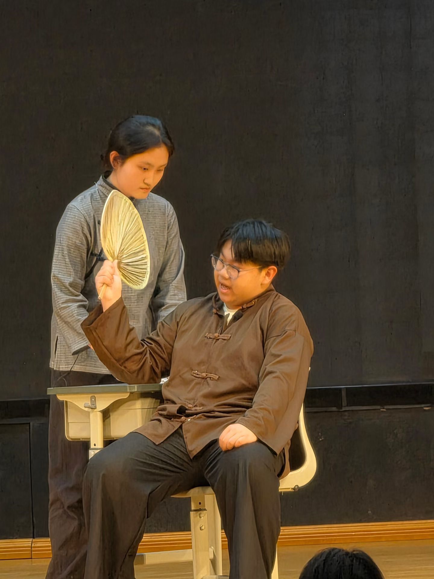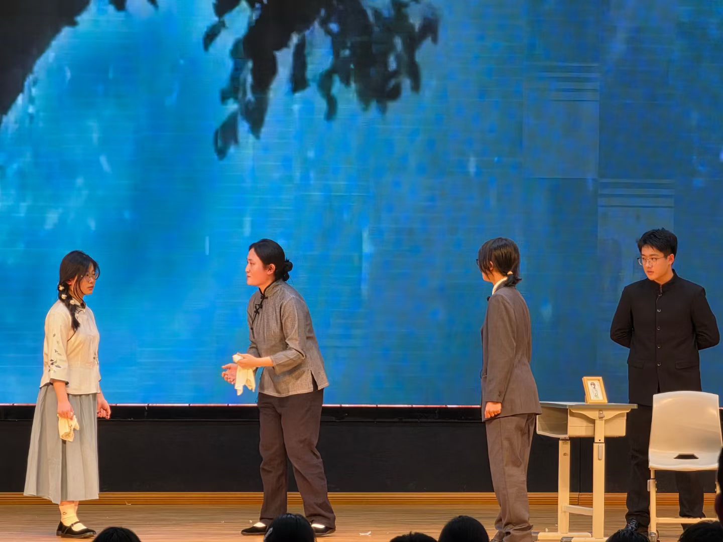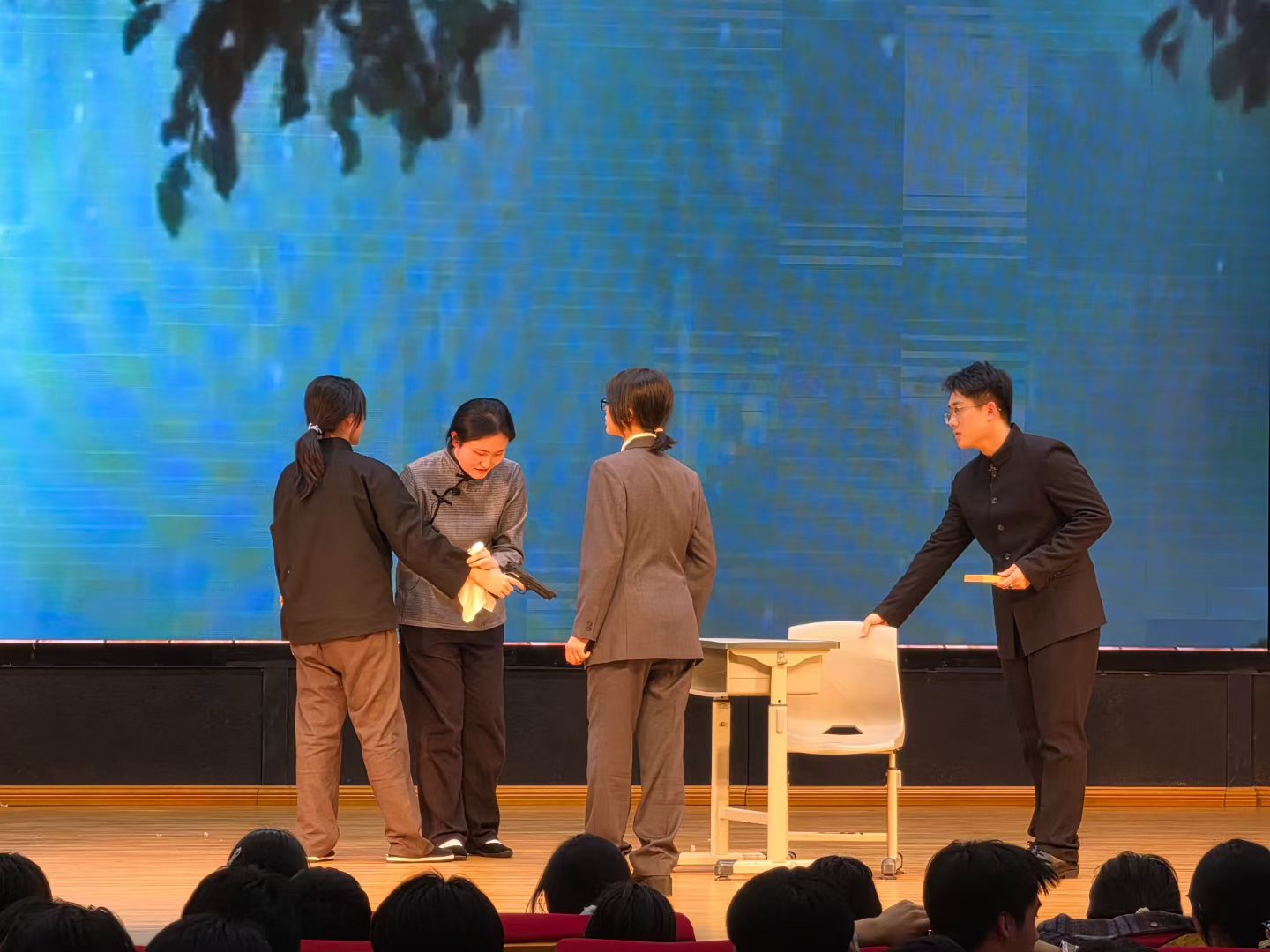 舞台上,演员们正围绕着一张白色桌子激烈讨论,仿佛在探讨着什么重要的问题。观众们坐在台下,专注地观看着这场表演。