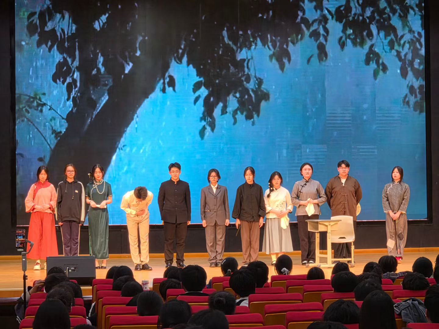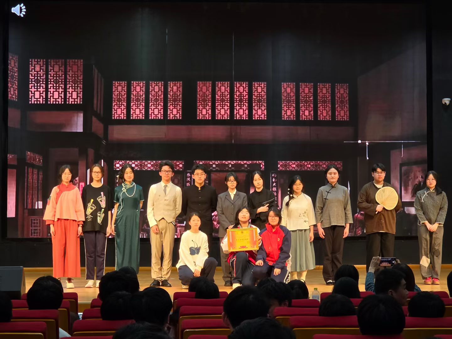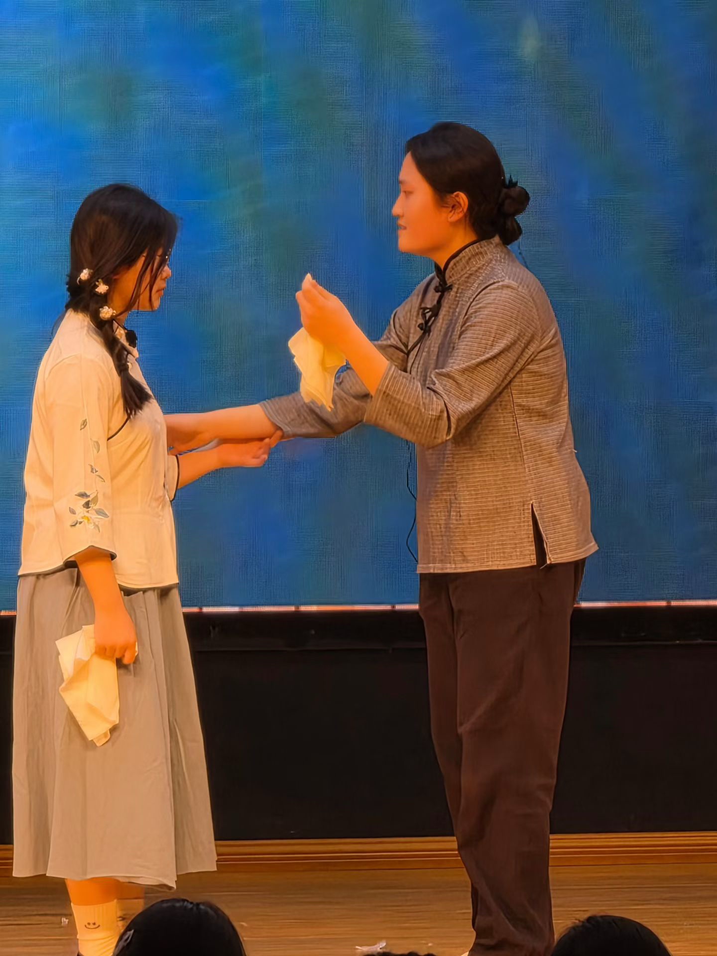 舞台上,演员们正围绕着一张白色桌子激烈讨论,仿佛在探讨着什么重要的问题。观众们坐在台下,专注地观看着这场表演。