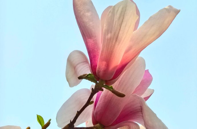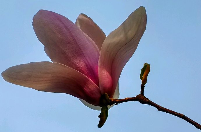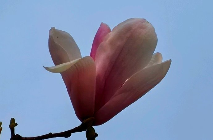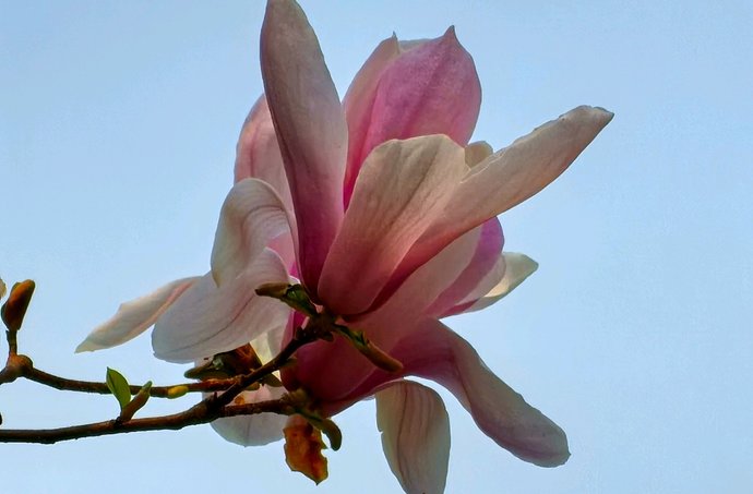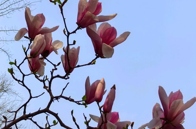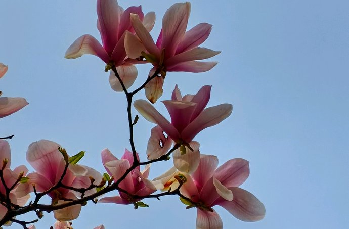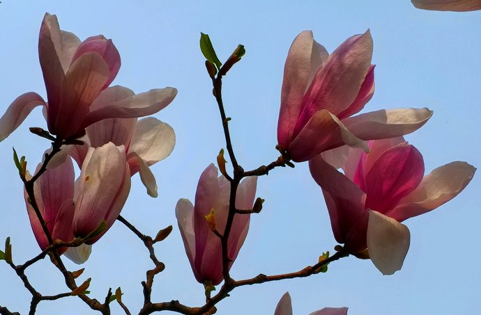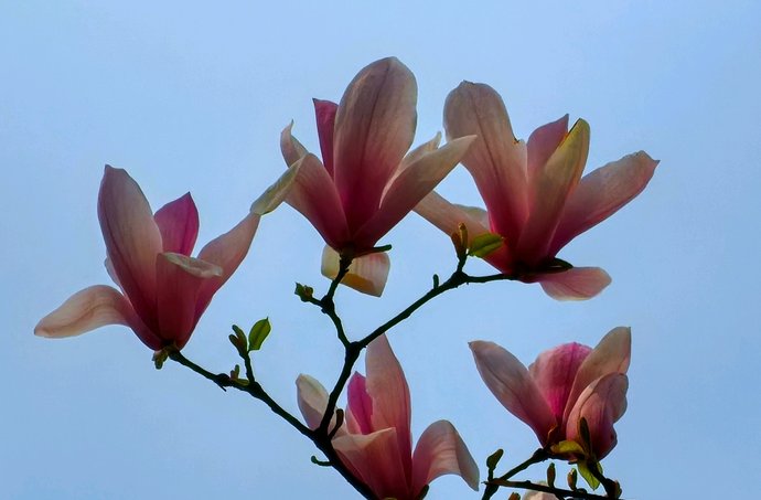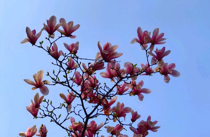 春风拂过枝桠,粉玉兰便挣脱了冬的束缚,以最热烈的姿态绽放。粉瓣凝香,枝间生春,玉兰开处,便是人间好时节。 一树粉云落枝头,半是温柔,半是风流。春风裁作玉兰花,粉黛轻匀,醉了人间四月天。不与百花争俗艳,只把春心付粉瓣,玉兰开时,山河皆温柔。 那层层叠叠的花瓣,像被春日晕染的云霞,从深玫红过渡到柔粉,边缘还晕着一抹奶白,在天光下泛着绒绒的光泽。有的花苞半开,如少女微垂的眉眼,藏着未说尽的温柔;有的已然盛放,舒展成杯盏模样,仿佛要将整个春天都盛进这温柔的弧度里。