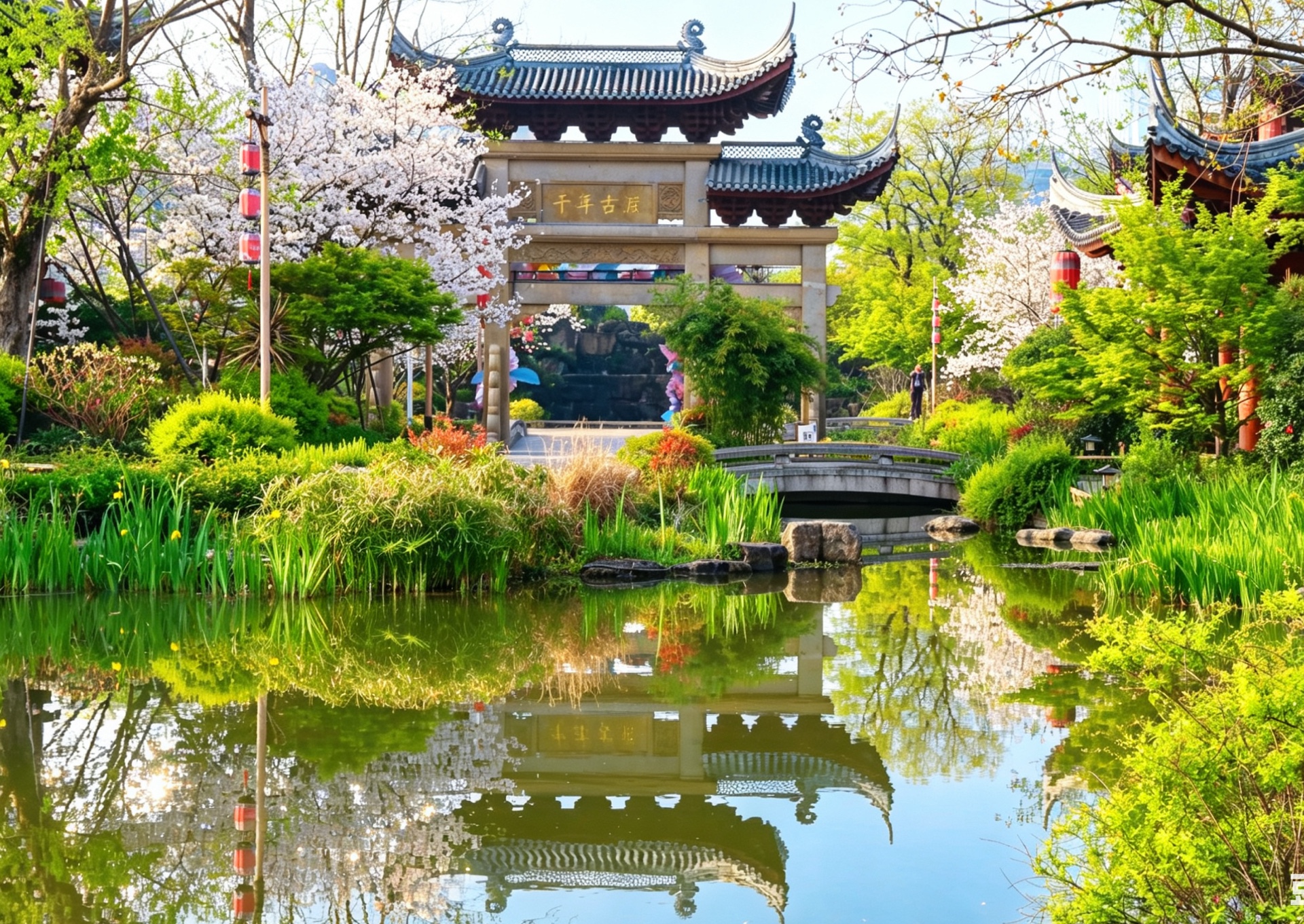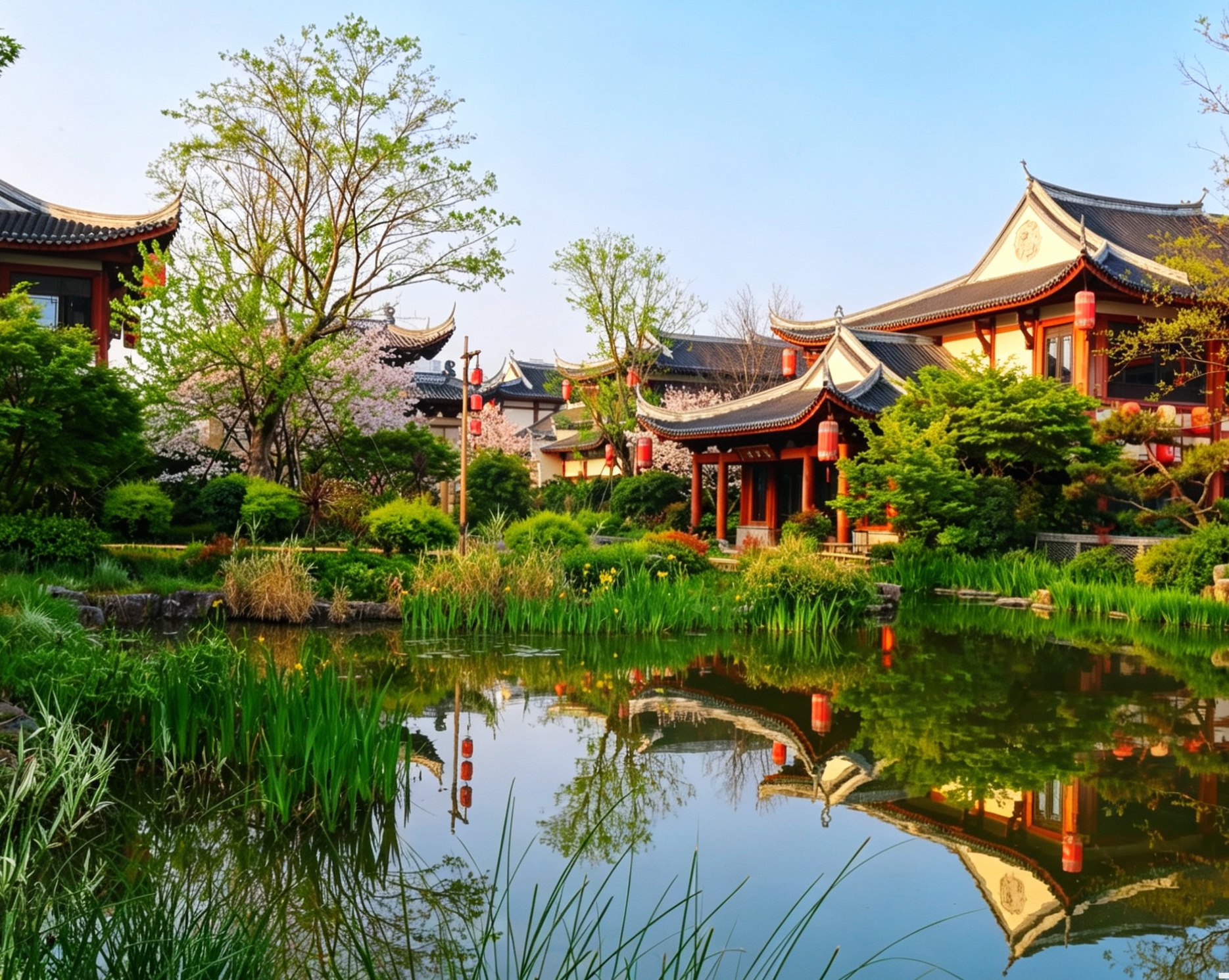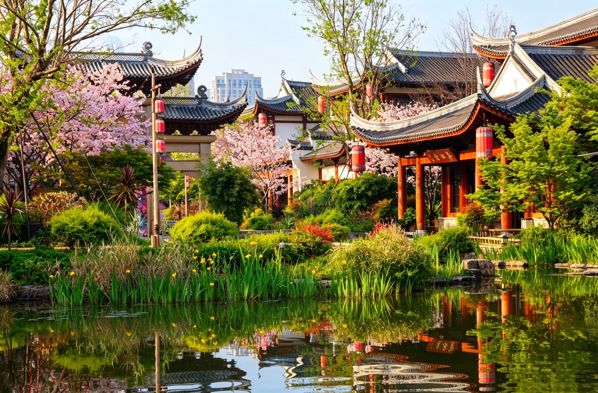 春风拂过,古建筑倒影在清澈的湖水中,如梦似幻。红墙绿树,粉樱盛开,美得让人心醉。