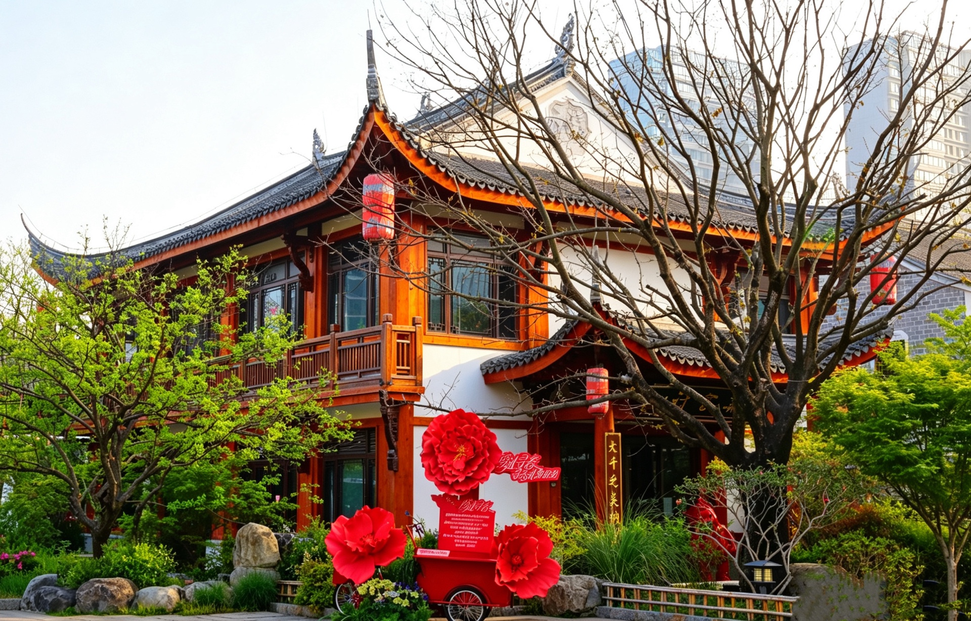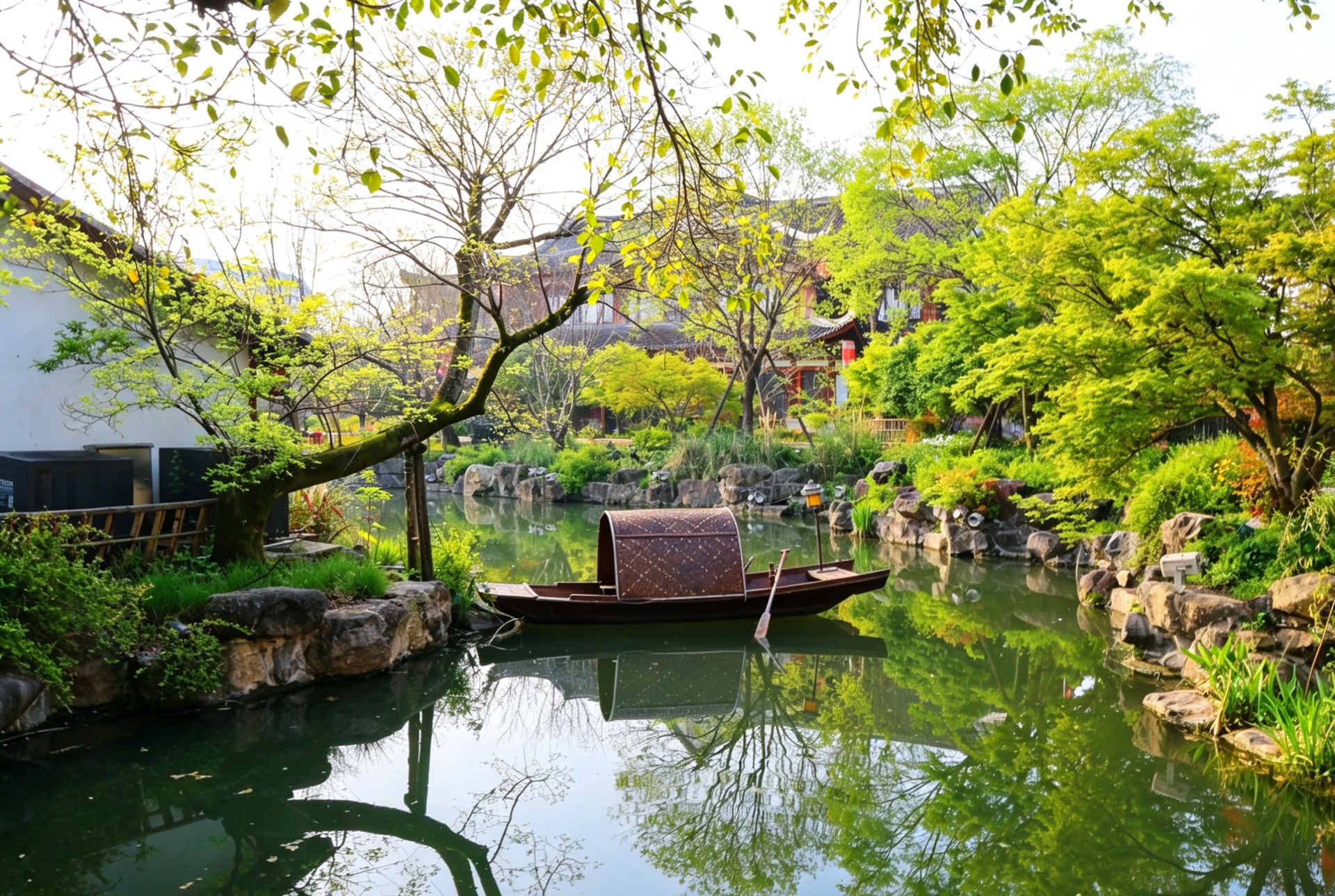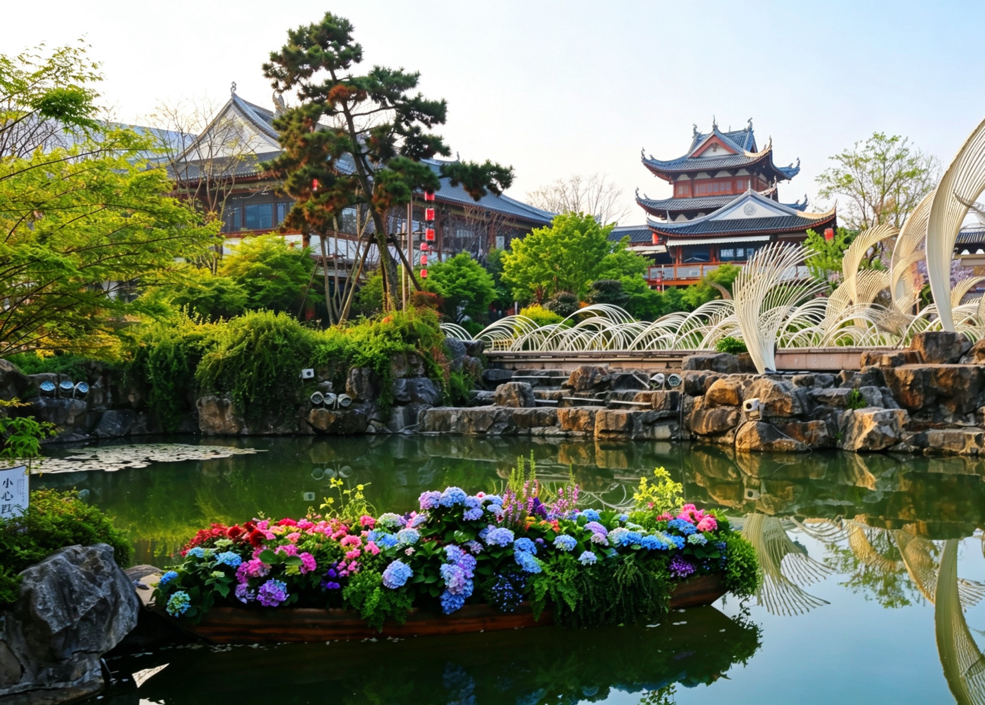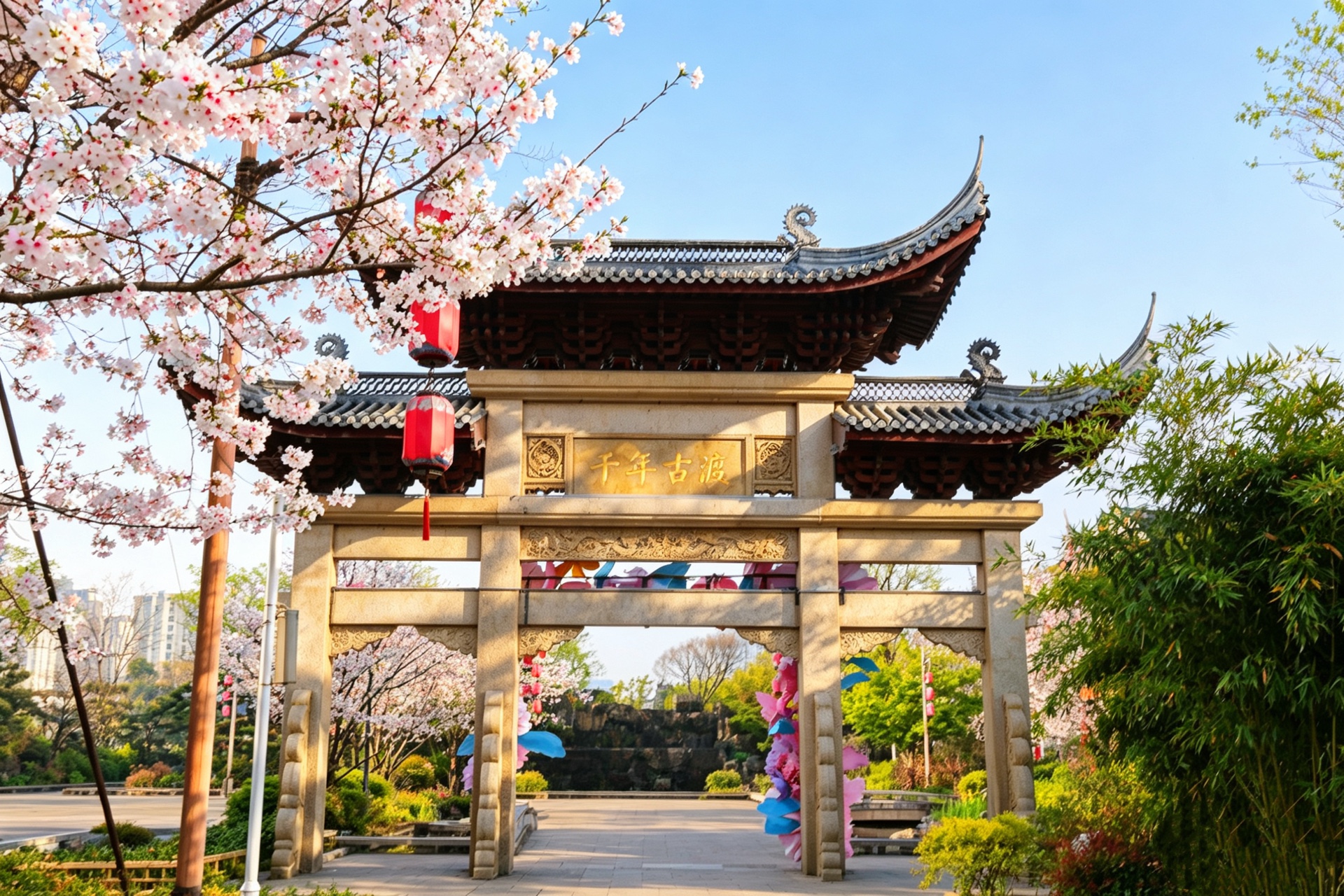 春风拂过,古建筑倒影在清澈的湖水中,如梦似幻。红墙绿树,粉樱盛开,美得让人心醉。
