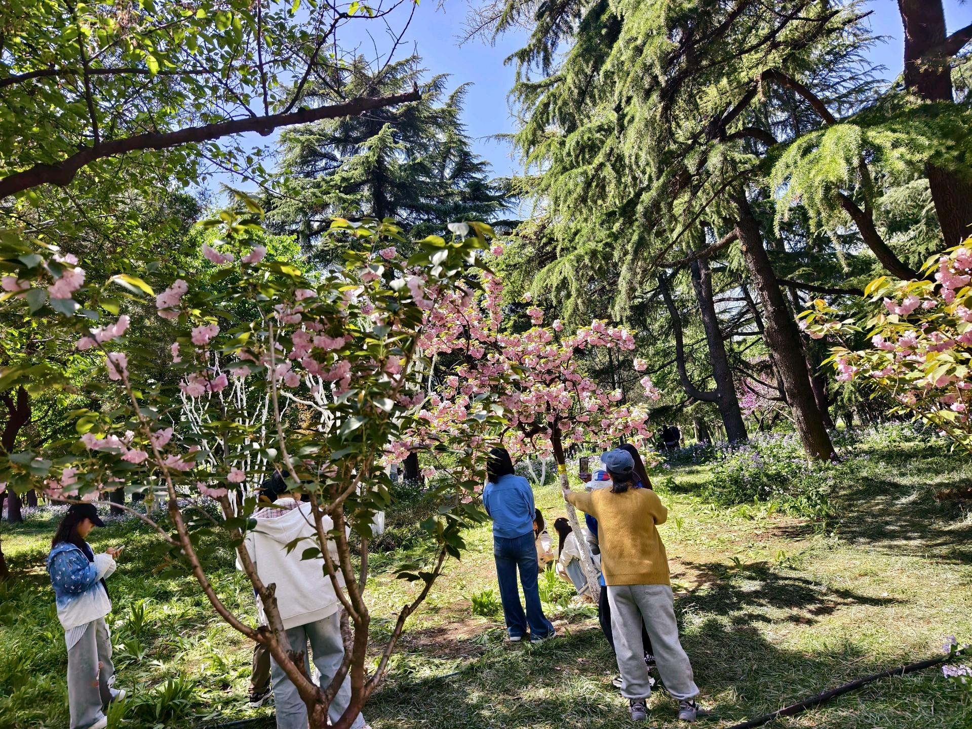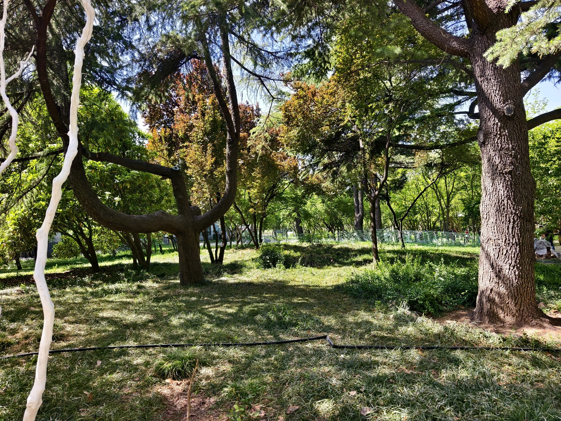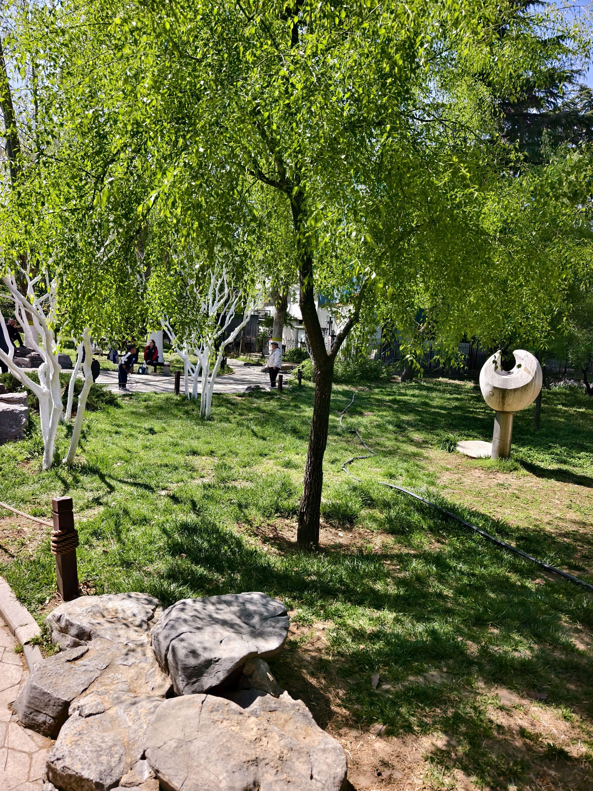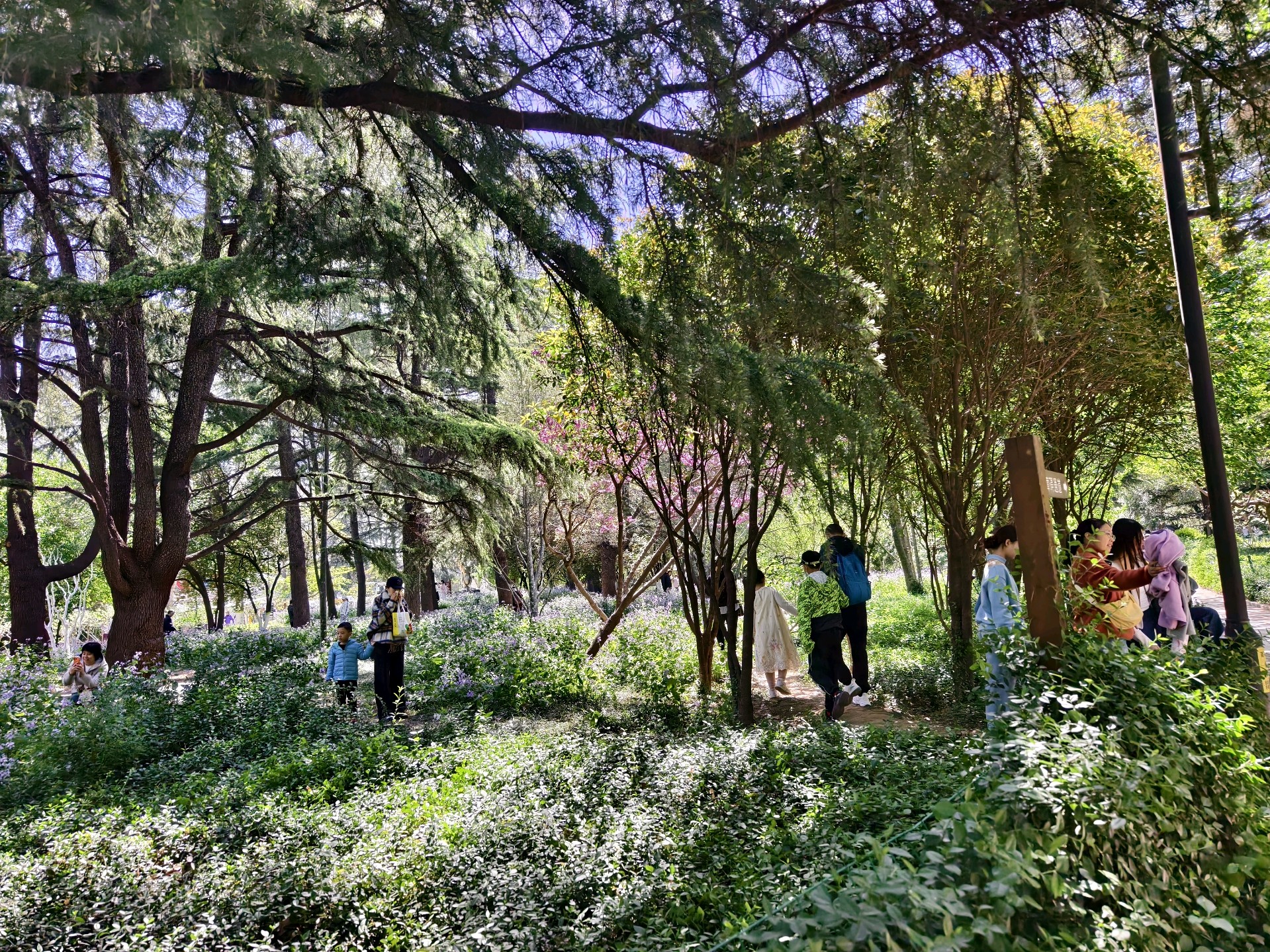 阳光下的公园,绿树成荫,草地如茵。人们在这里散步、交谈,享受着美好的时光。百花公园,踏青赏花,假期最后一天,携家带娃,欢乐出行!