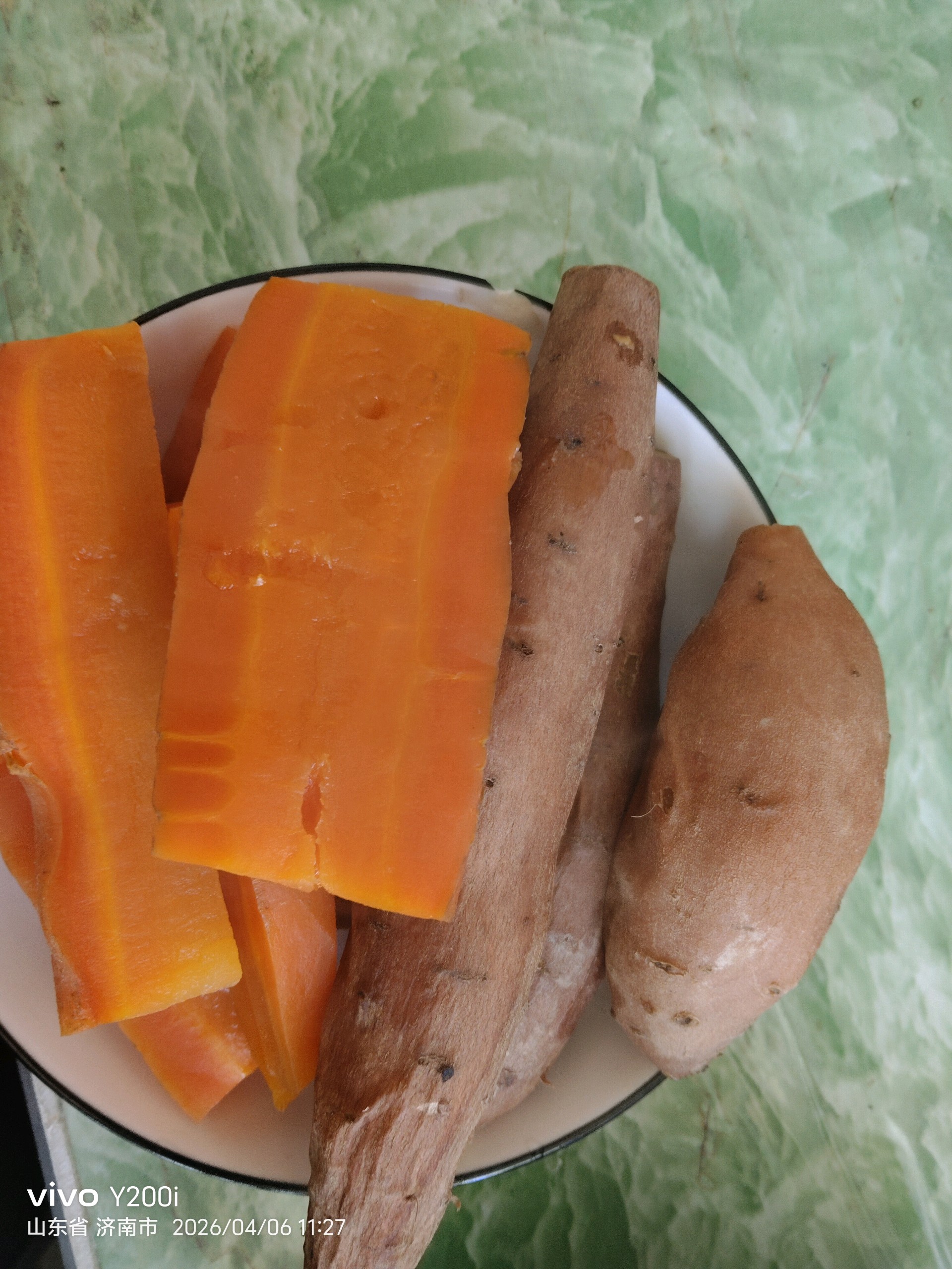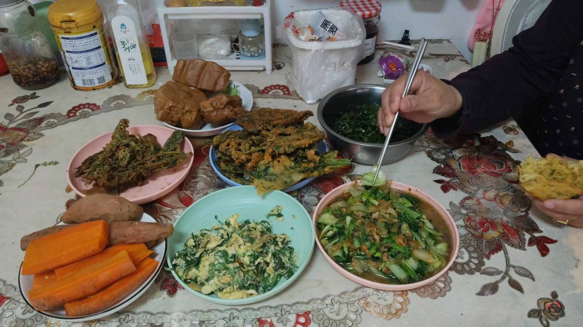 今天和老伴在家做了一顿季节性的家常饭,其中有薄荷炒鸡蛋、炸香春牙,凉拌苦菜,炒个小白菜、煮的胡萝卜,地瓜,馒头,榆树叶的窝窝头,再来一碗银耳汤,虽然没有大鱼大肉,感觉幸福就在其中。