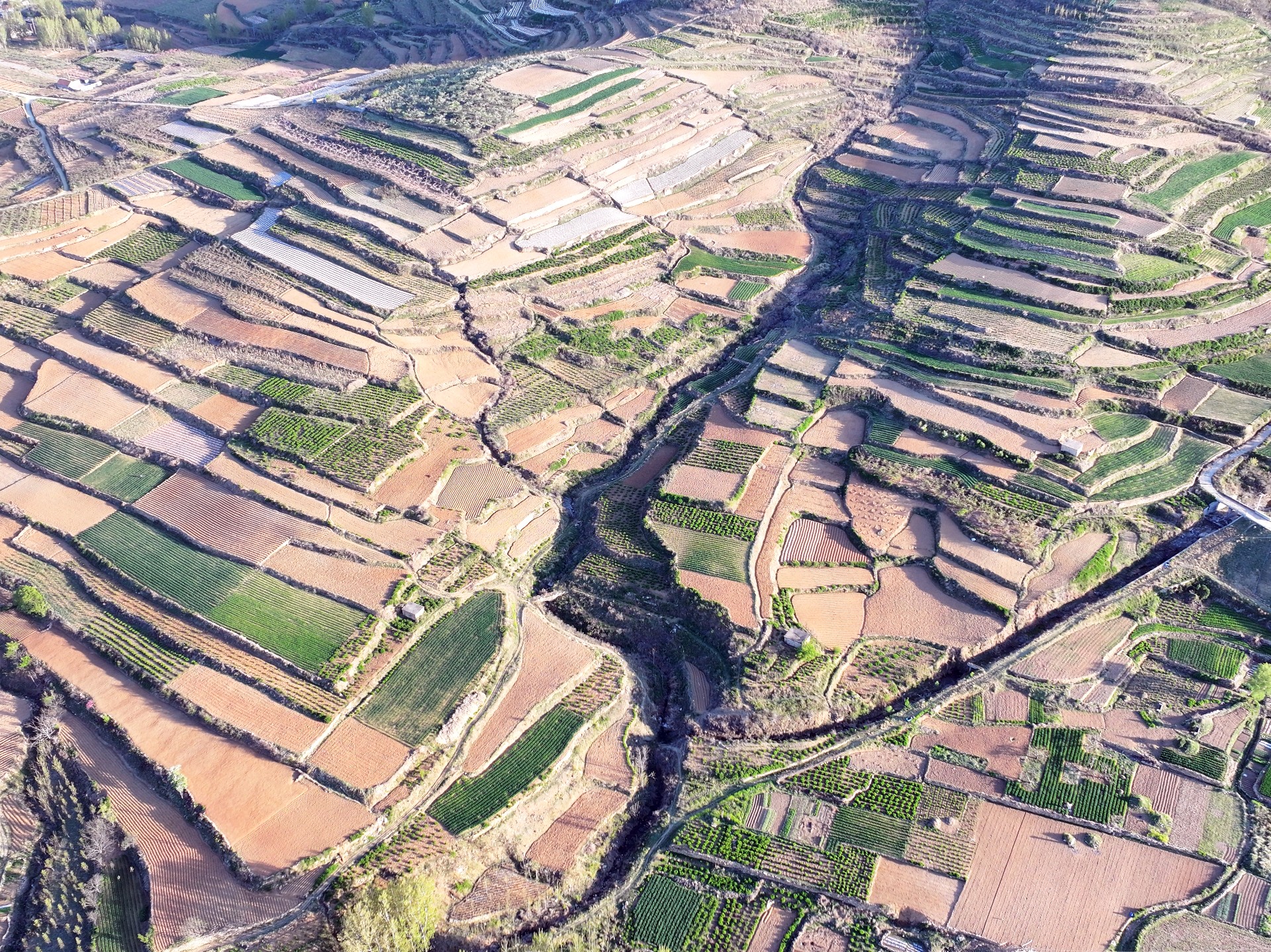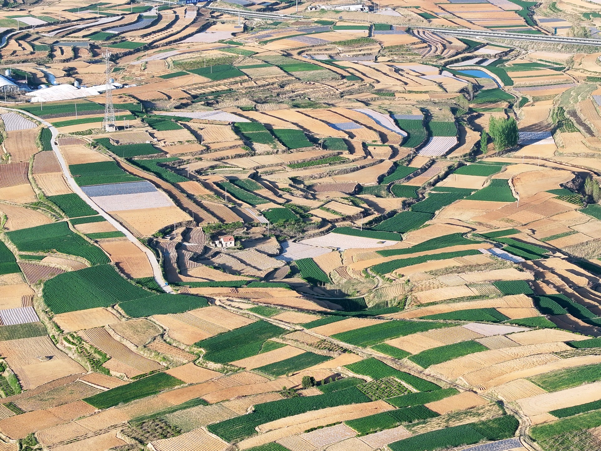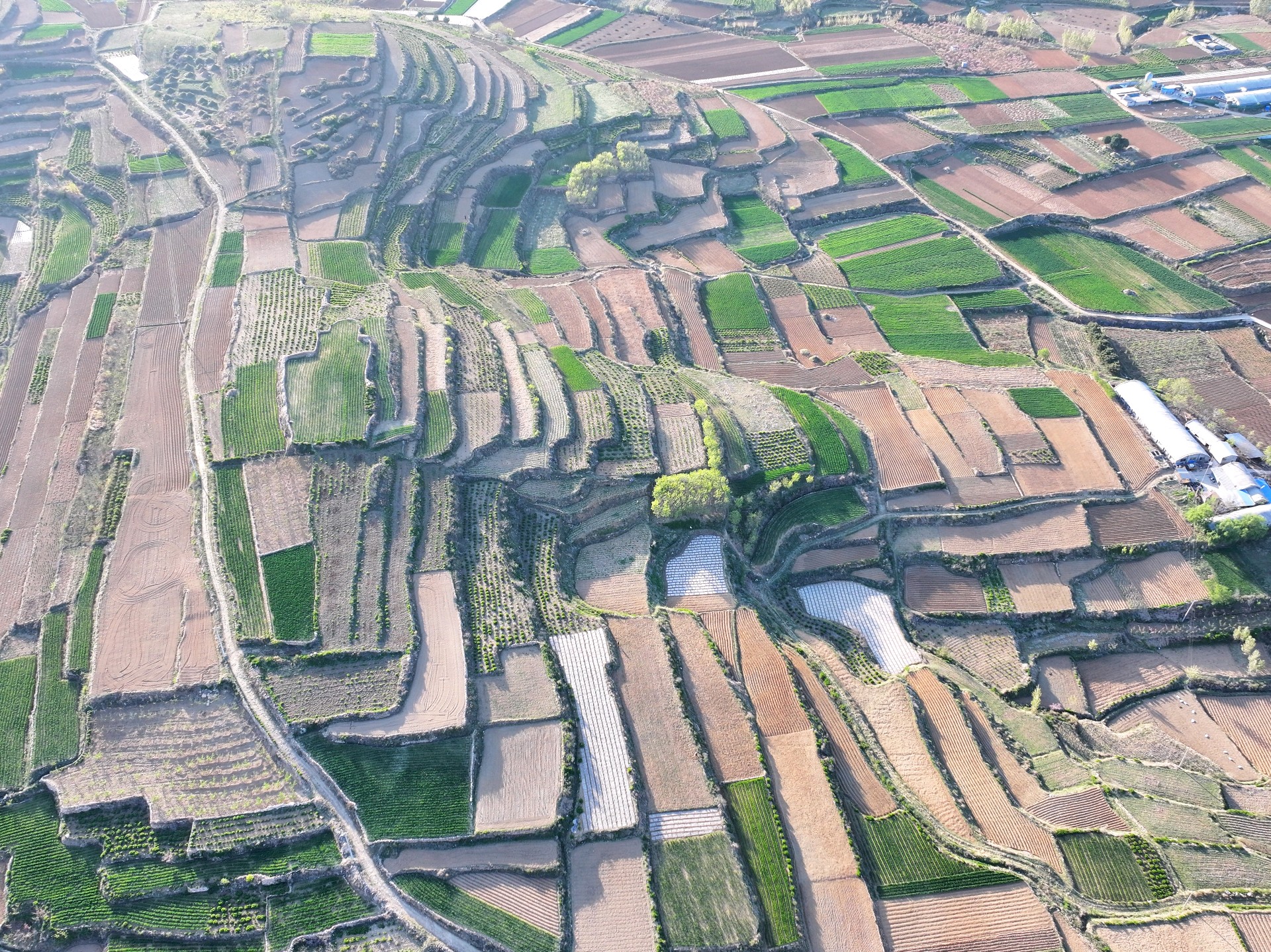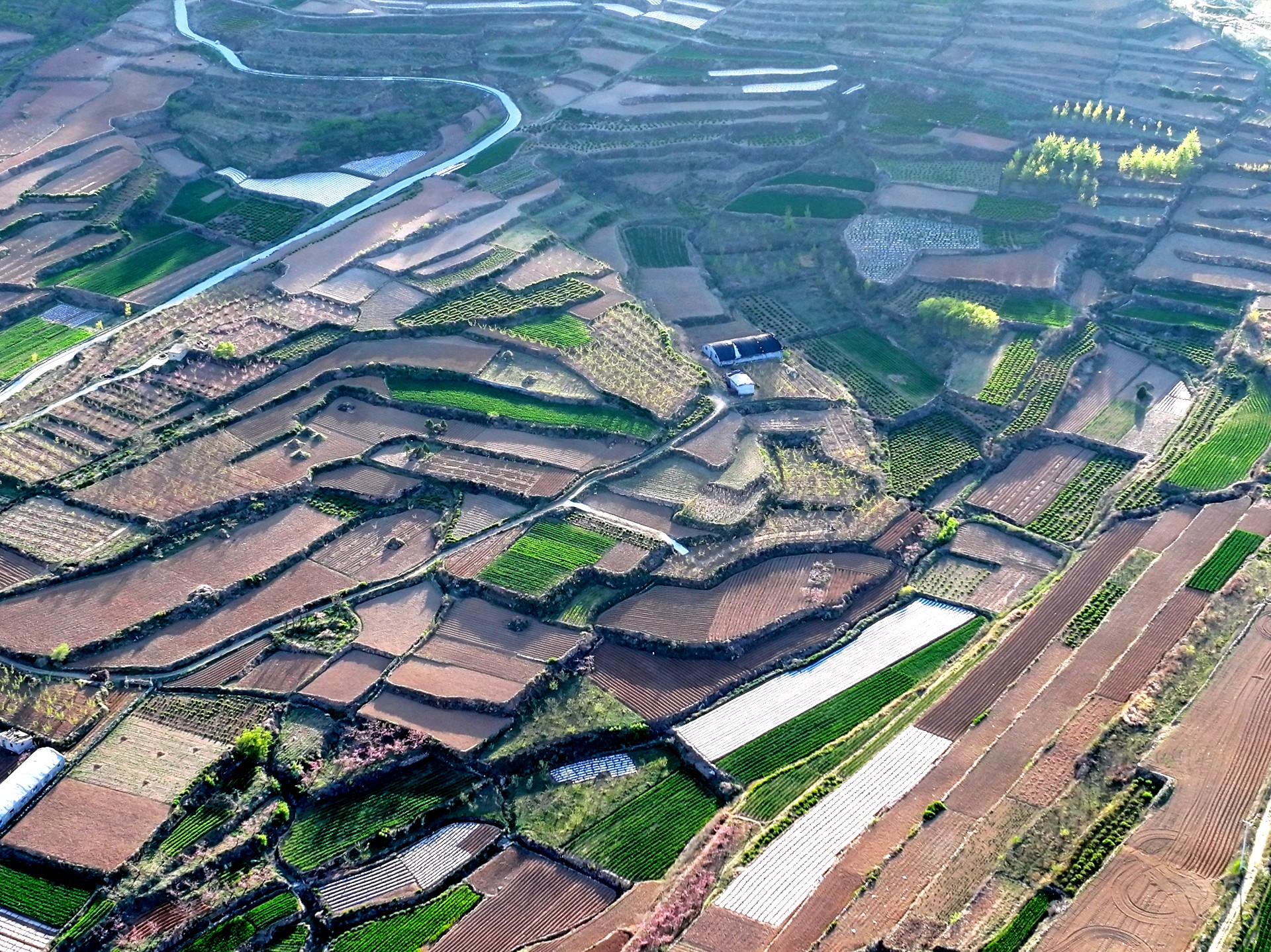 4月7日,临沂市沂蒙山梯田风景。眼下临沂市沂蒙山腹地的乡村农民正春耕播种,到处都是一派繁忙的景象。一层层梯田科学种植,麦苗青青,用地膜腹盖农作物曲线分明,科技赋能农业生产高效增收。成为沂蒙山区一幅幅亮丽的田园画卷。王东元 摄影