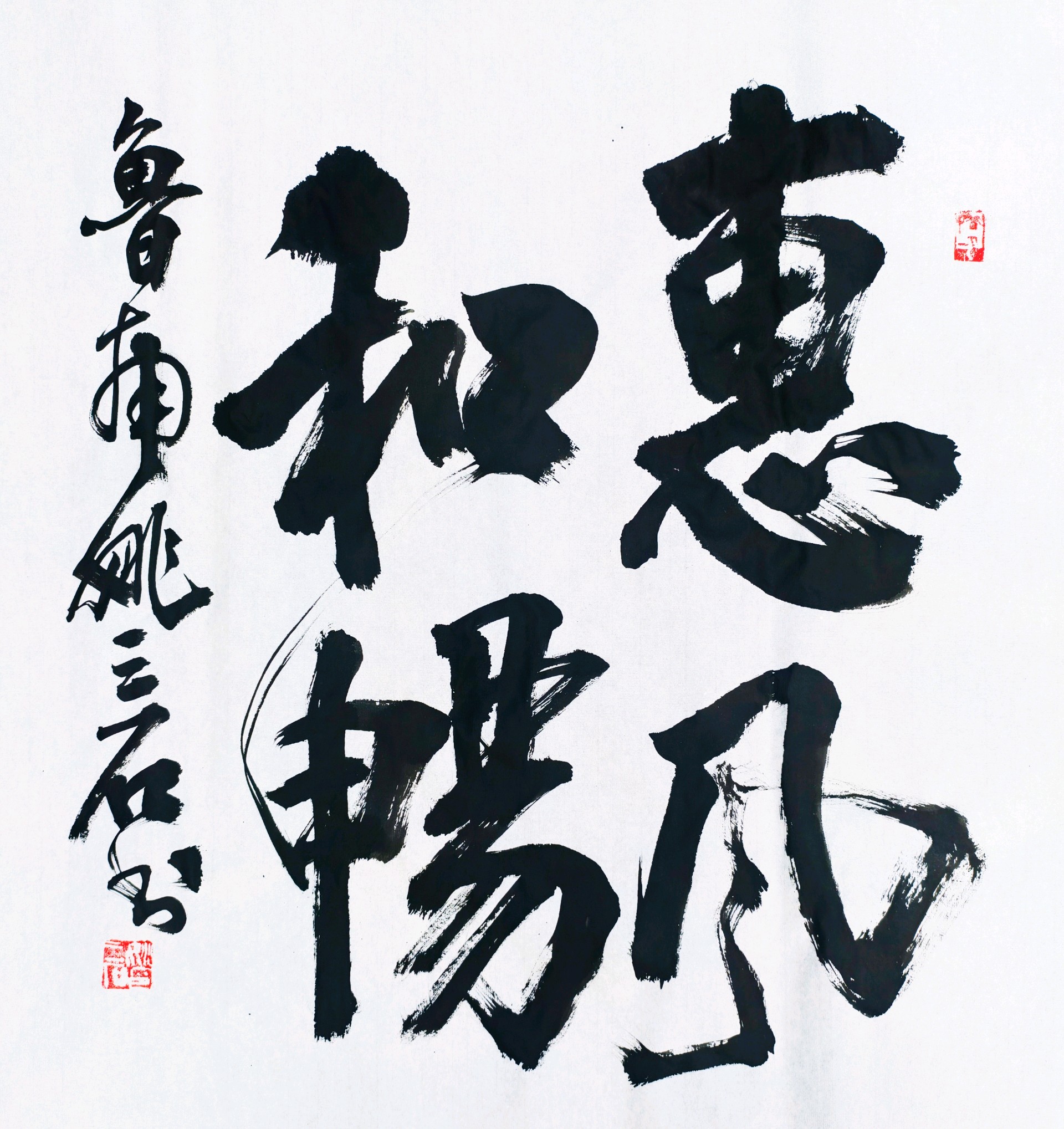 三石同志的书法,最动人处在于气势磅礴,开合有度。观其大字作品“惠风和畅”,笔力雄健如奔雷,墨色浓淡相生,起笔收笔皆见筋骨,“惠”字开张大气,“畅”字纵逸洒脱,将春日和暖、心境舒朗的意境全然写出,笔墨间满是豁达胸襟。“竹报平安”“天开淑景”二作,笔法苍劲老辣,结体端庄而不失灵动,线条刚柔相济,既有碑学的厚重雄强,又有帖学的温润流畅,于端庄中见奇崛,于平和中显张力,尽显汉字之美与笔墨之韵。