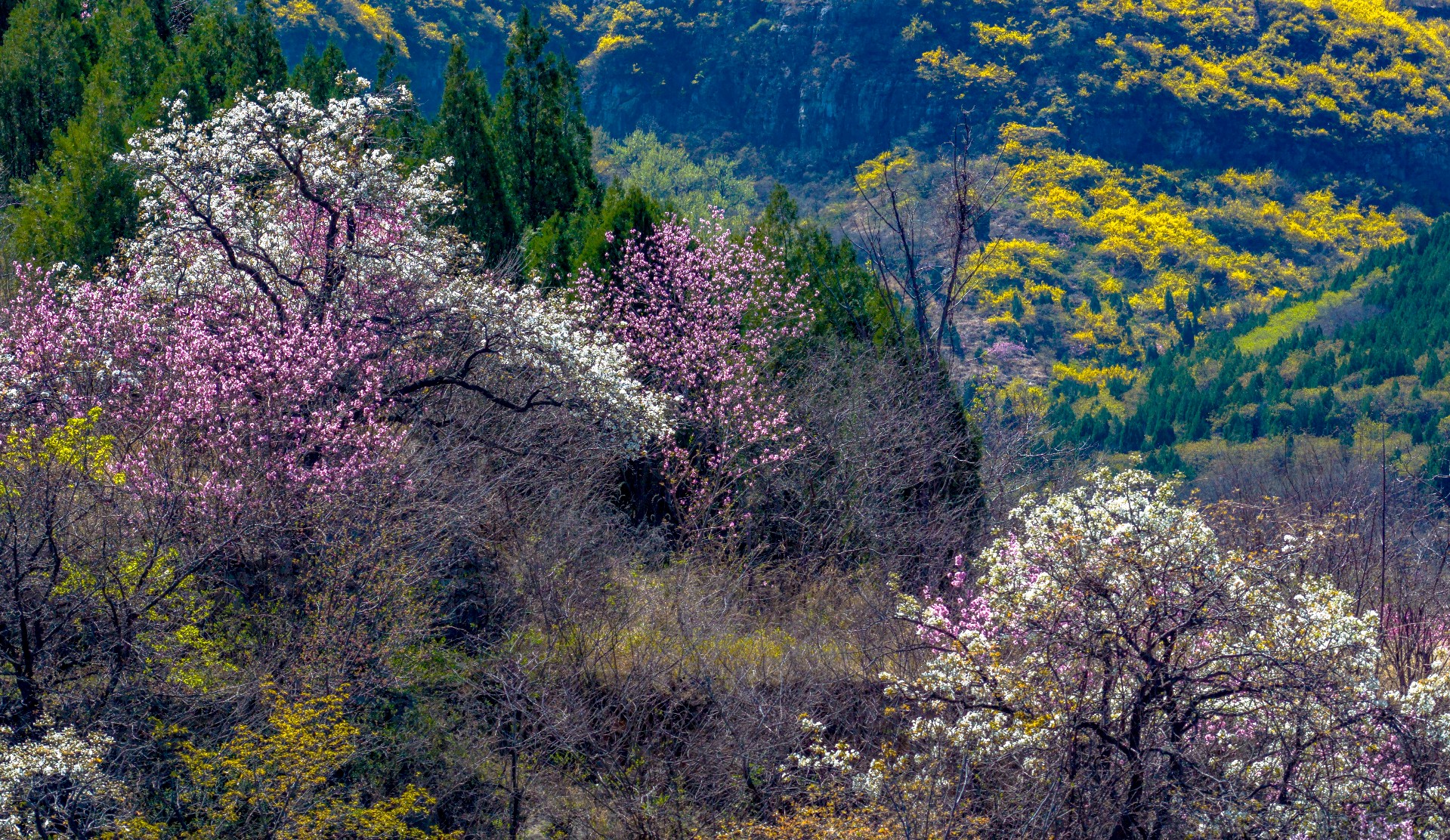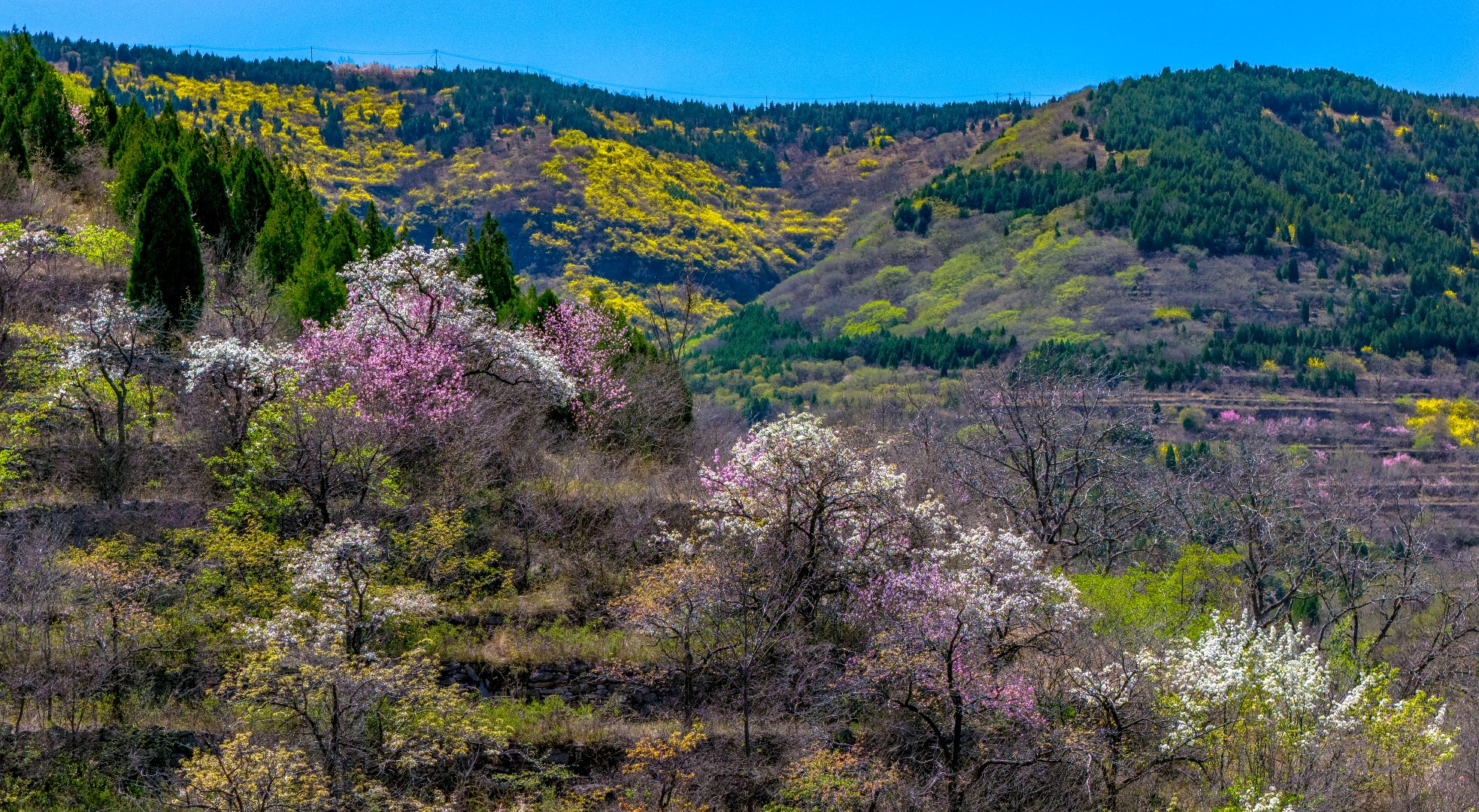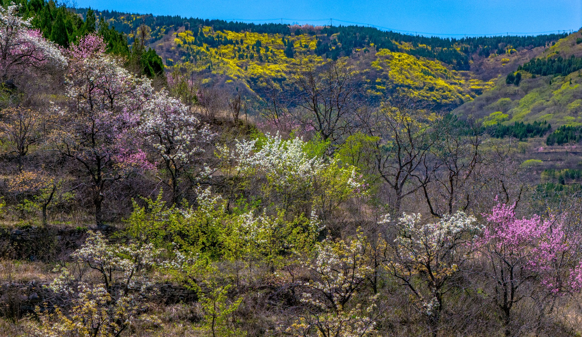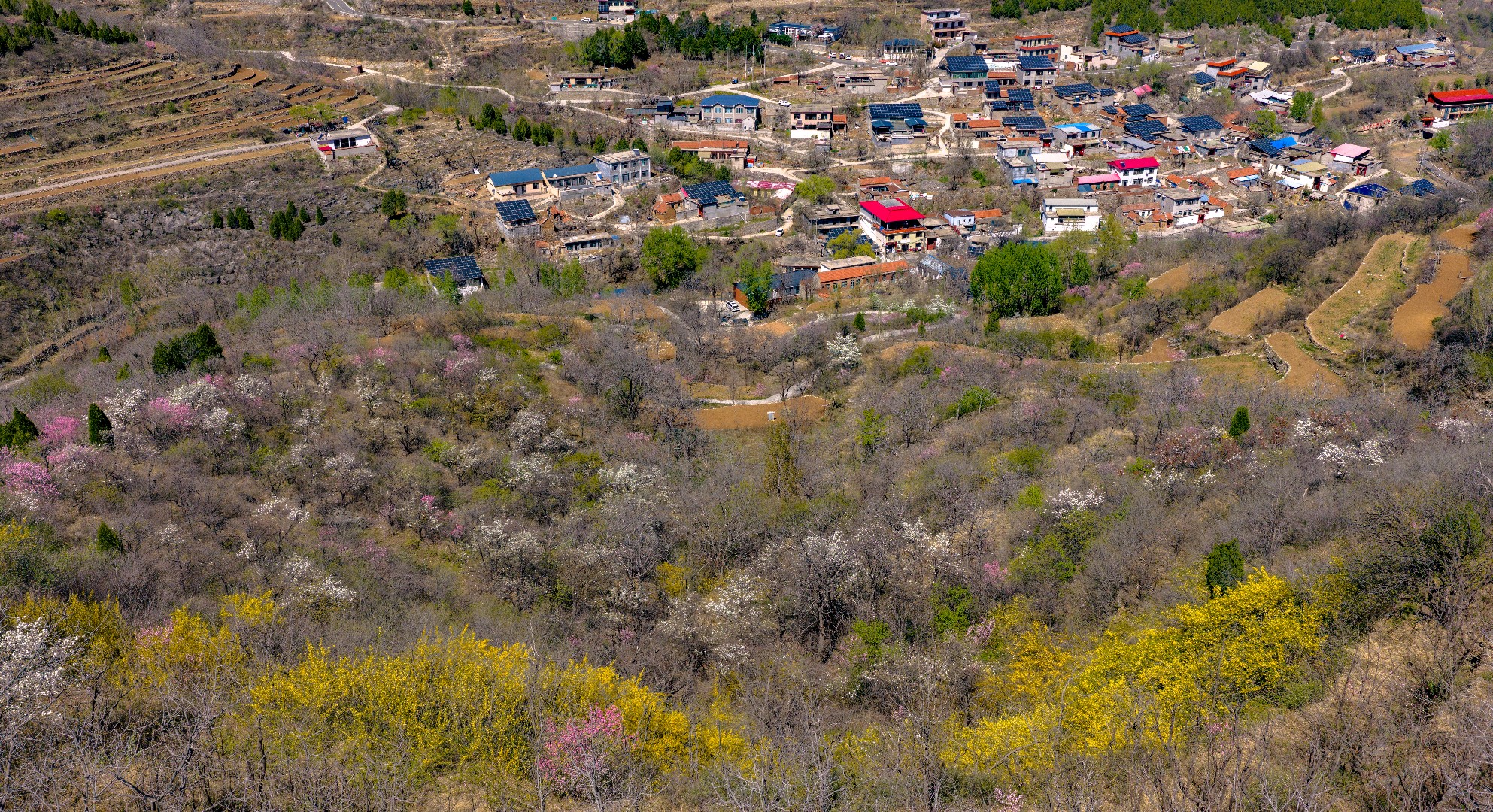彩石街道万粮峪春日清幽。山顶桃花粉嫩、梨花雪白,竞相绽放;山间连翘金黄连片,阳光洒落,光影流转。粉白金黄与青山相映,小山村静卧其间,春风拂面,花香四溢,一派悠然宁静的山野春光,令人心旷神怡。