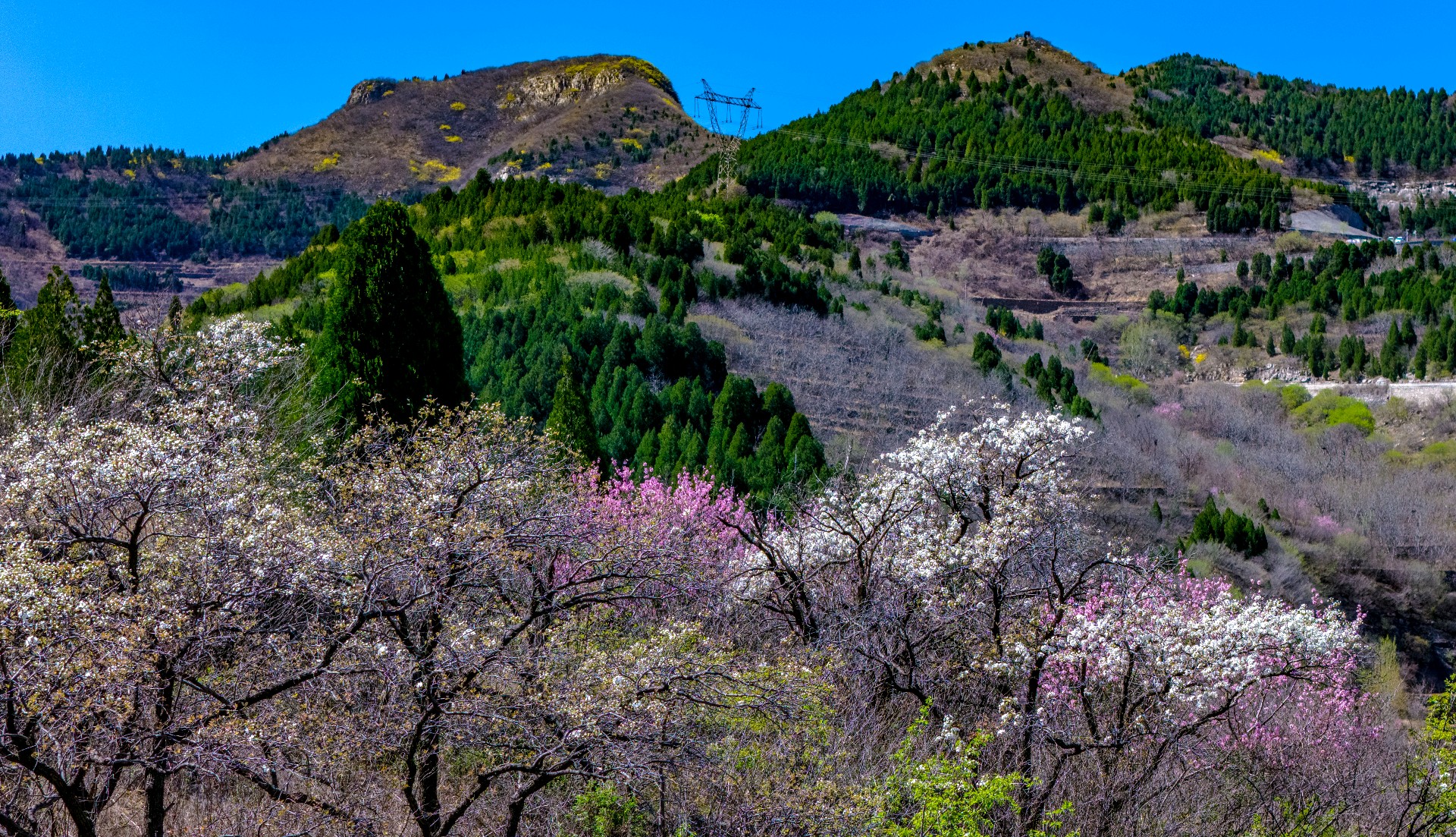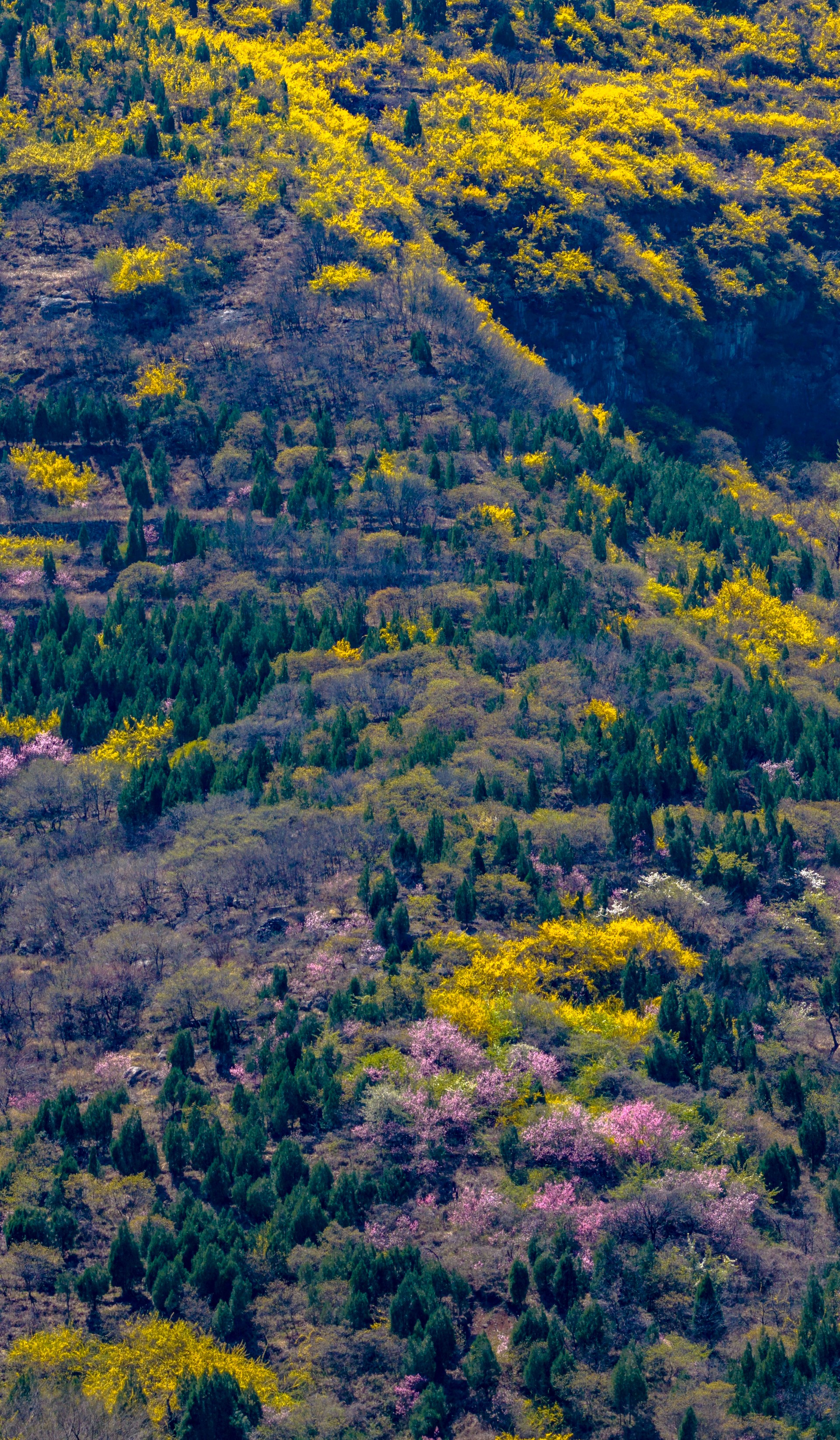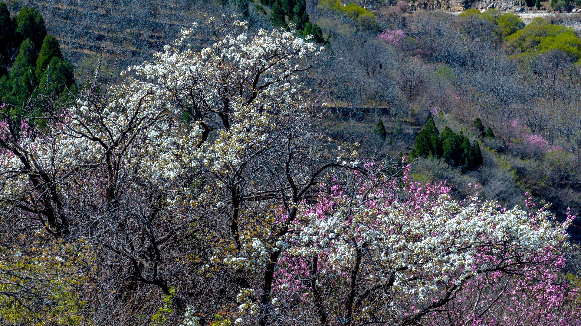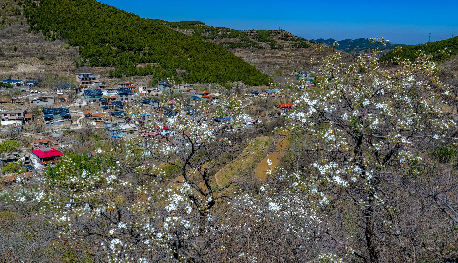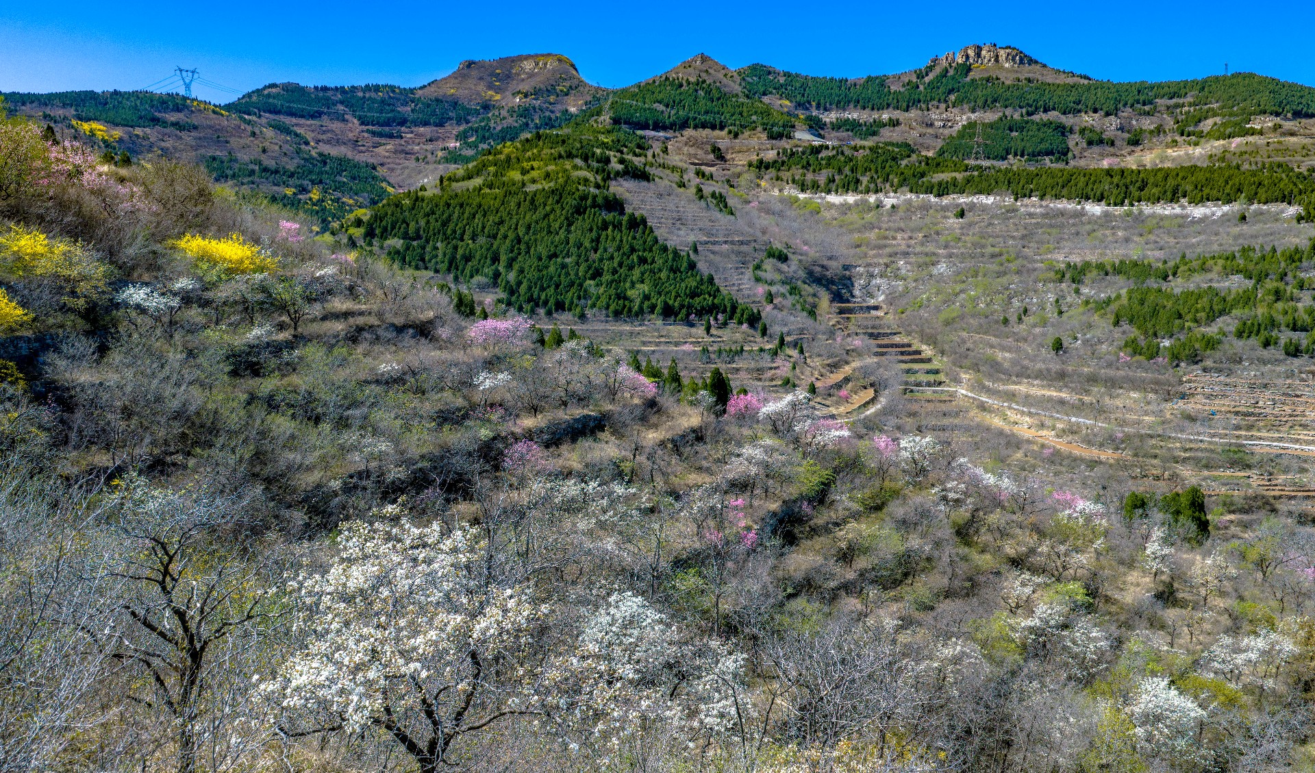 彩石街道万粮峪春日清幽。山顶桃花粉嫩、梨花雪白,竞相绽放;山间连翘金黄连片,阳光洒落,光影流转。粉白金黄与青山相映,小山村静卧其间,春风拂面,花香四溢,一派悠然宁静的山野春光,令人心旷神怡。