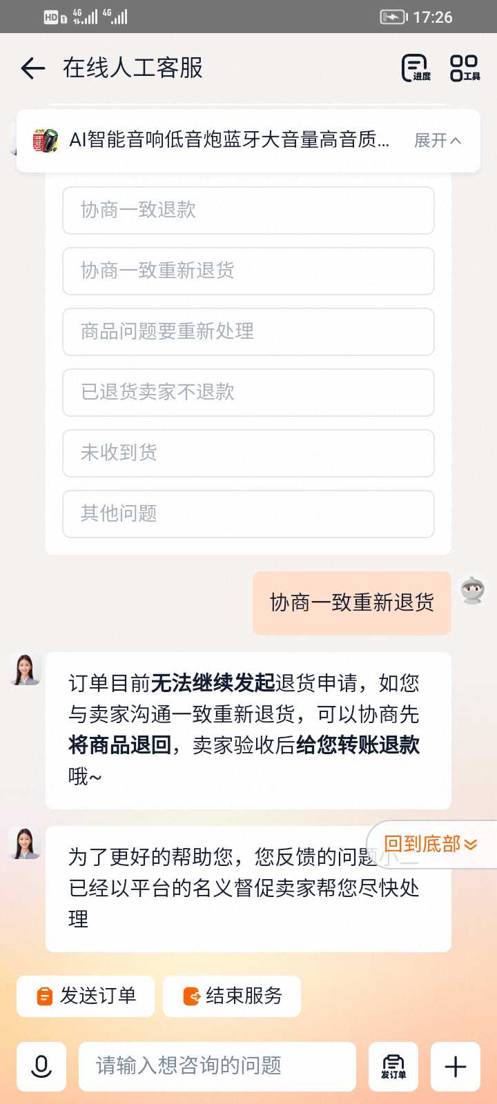 淘宝网平台网购AI智能音响低音炮遭淘宝网平台故意诈骗消费者回退难为哪般?一消费者在拼多多网购AI智能音响低音炮,由于卖家商品与图片描述不符,存在严重的价格诈骗行为。消费者要求退款,卖家承诺退货由卖家承揽回退,竟然出现包裹原路回退难问题。淘宝网平台则表示:强制性换货,不直接退款。淘宝网平台故意诈骗消费者为哪般?