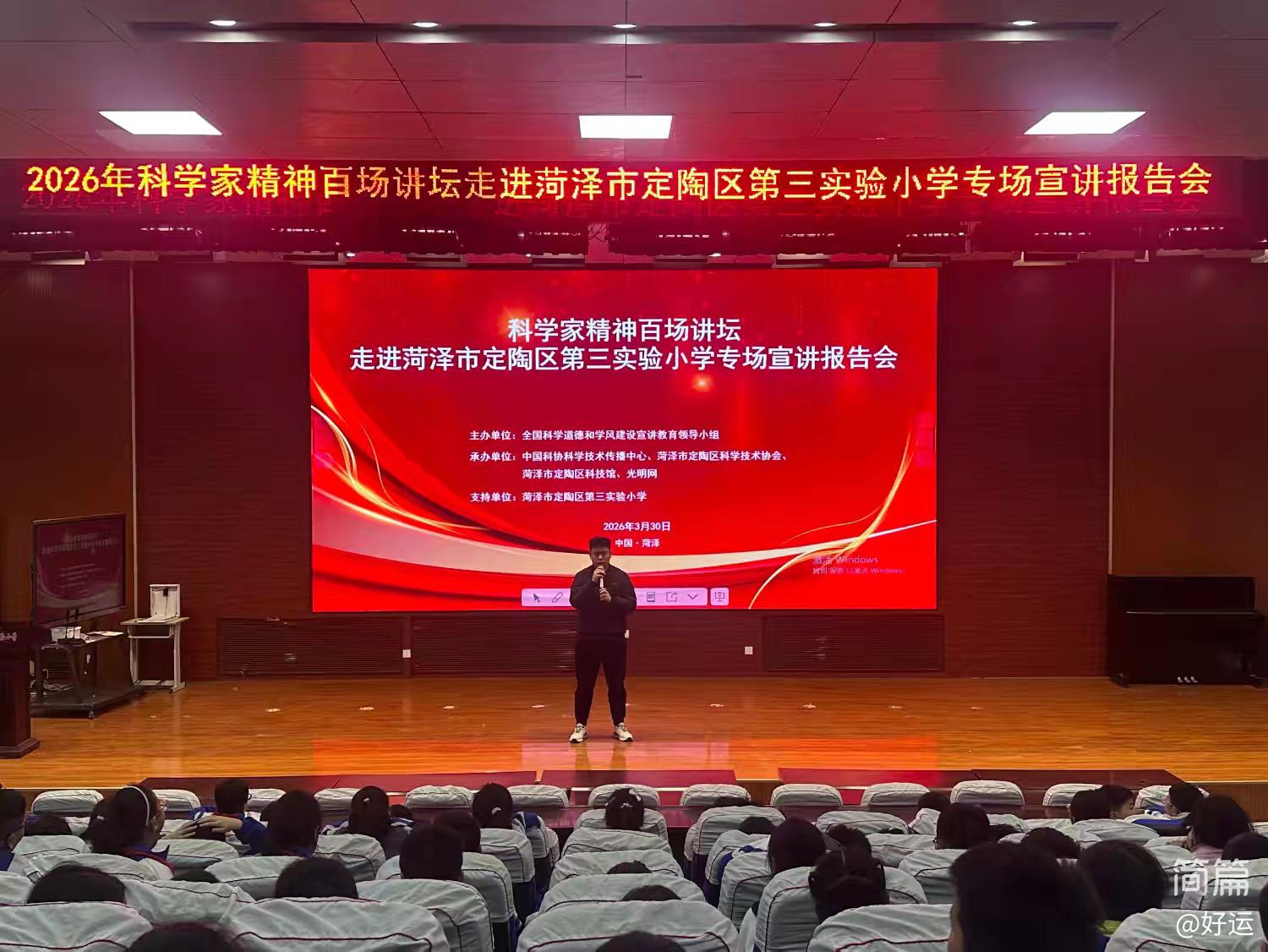 3月30日,定陶区第三实验小学举办“科学家精神百场讲坛”进校园活动,特邀山东省气象科学研究所首席研究员王以琳作专题科普讲座。