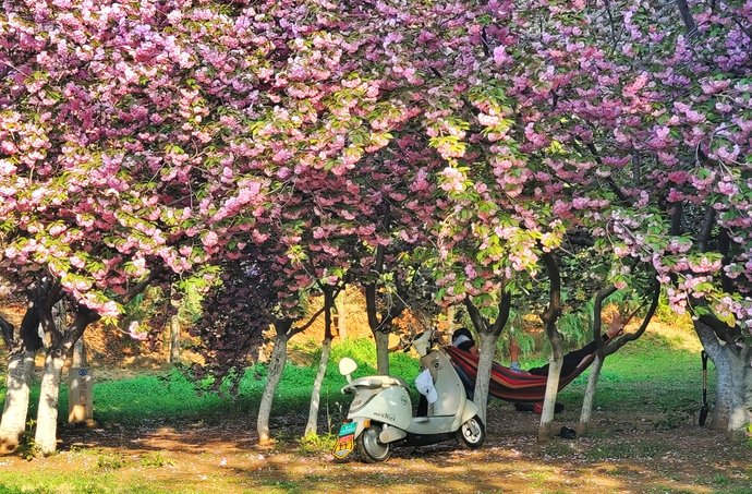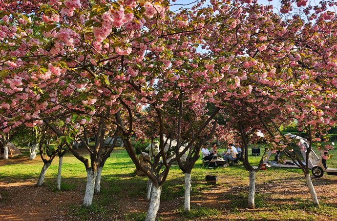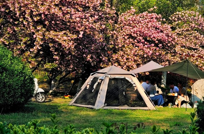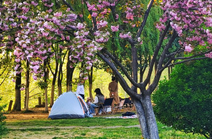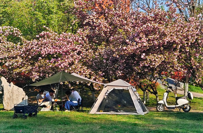 沂河岸边赴春之约 樱花树下惬意“宿营”
