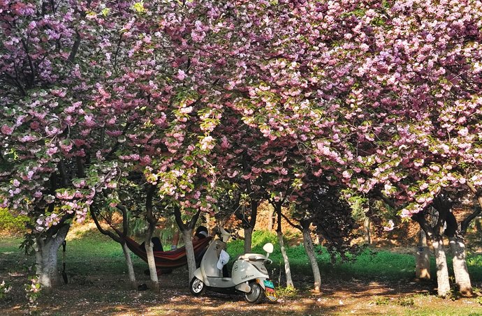 4月10日,在临沂沂河岸边的滨河生态公园,赴一场樱花的春日之约,一同感受春天的气息。瞧呀,在樱花树下搭起帐篷“宿营”,来一场烧烤野餐,别具一番风味。既能欣赏风景,又能享受清凉,实在是浪漫至极!