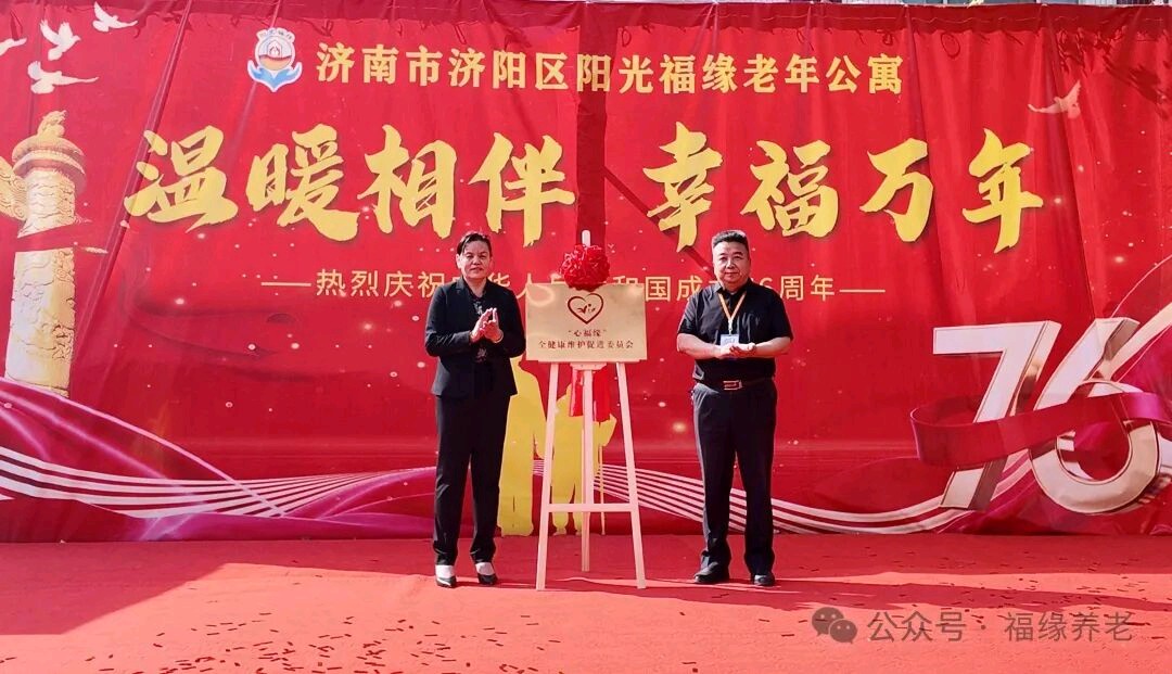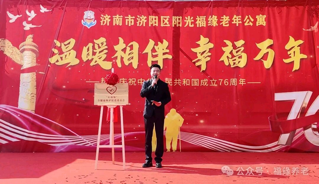 济南市济阳区阳光福缘老年公寓“心福缘”全健康维护促进委员会正式揭牌成立 为进一步深化长者与员工身心健康关爱工作,构建系统化、全方位的健康服务体系,4月11日,济阳区阳光福缘老年公寓隆重举行“心福缘”全健康维护促进委员会揭牌仪式,标志着机构身心健康关怀服务迈入规范化、专业化发展新阶段。高级经济师、二级心理咨询师李怀水,中级社工师、二级心理咨询师苏建,高级教师梁洪辰,中级社工师、二级心理咨询师苗梅,济阳区阳光福缘老年公寓总经理齐乃华以及入住长者代表、员工代表出席本次活动。