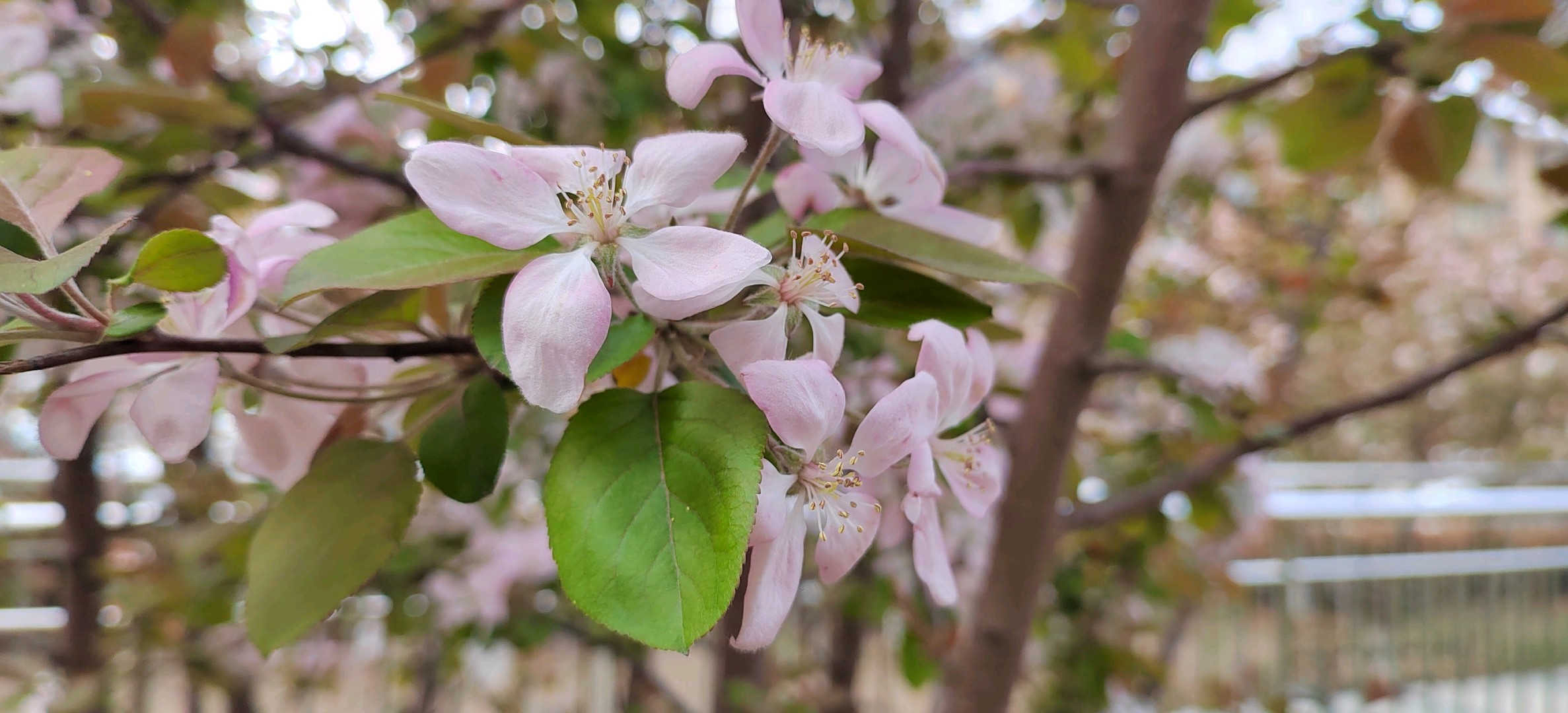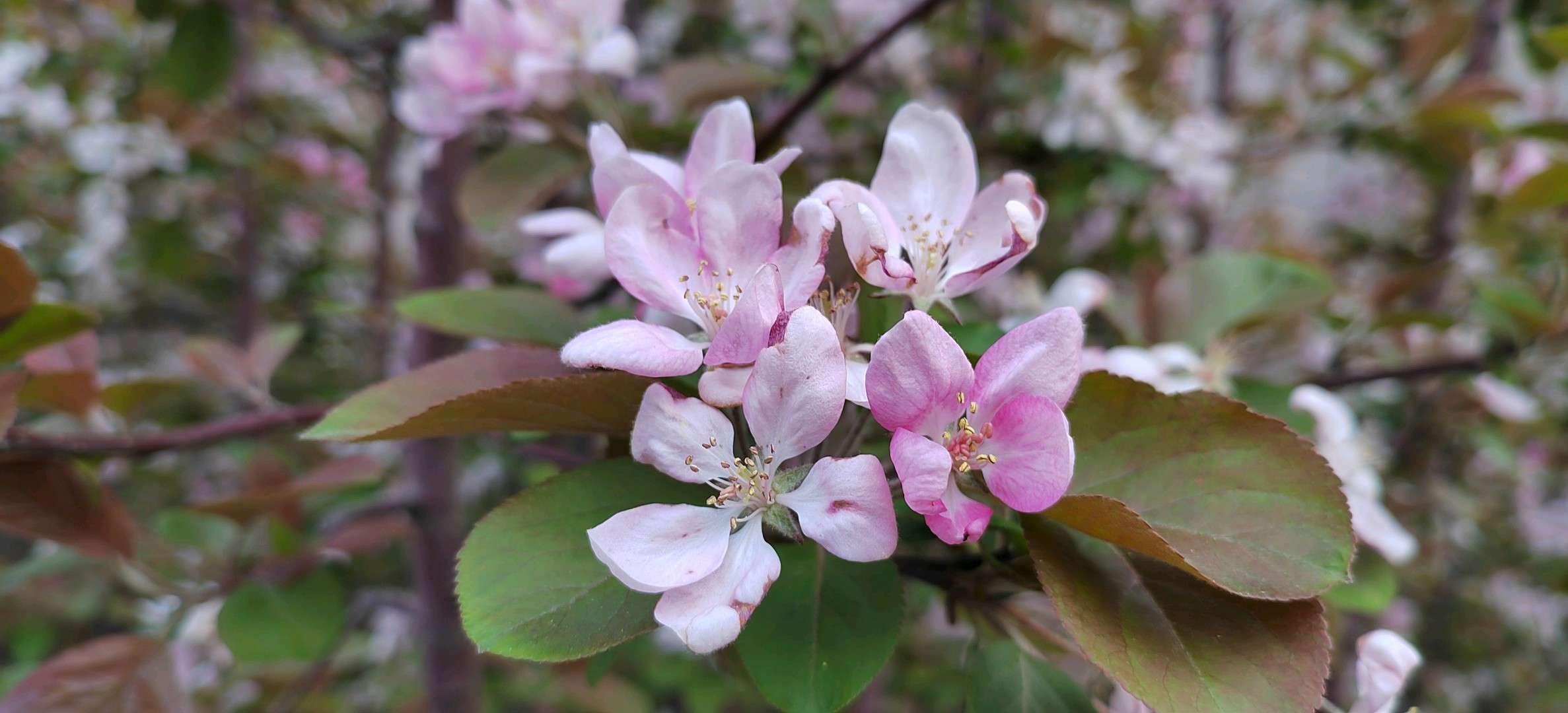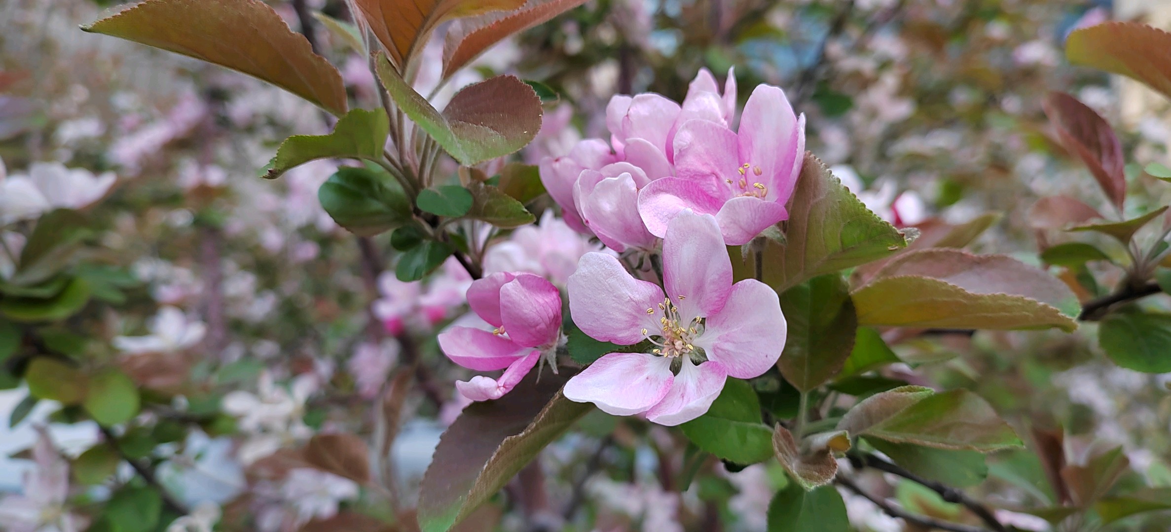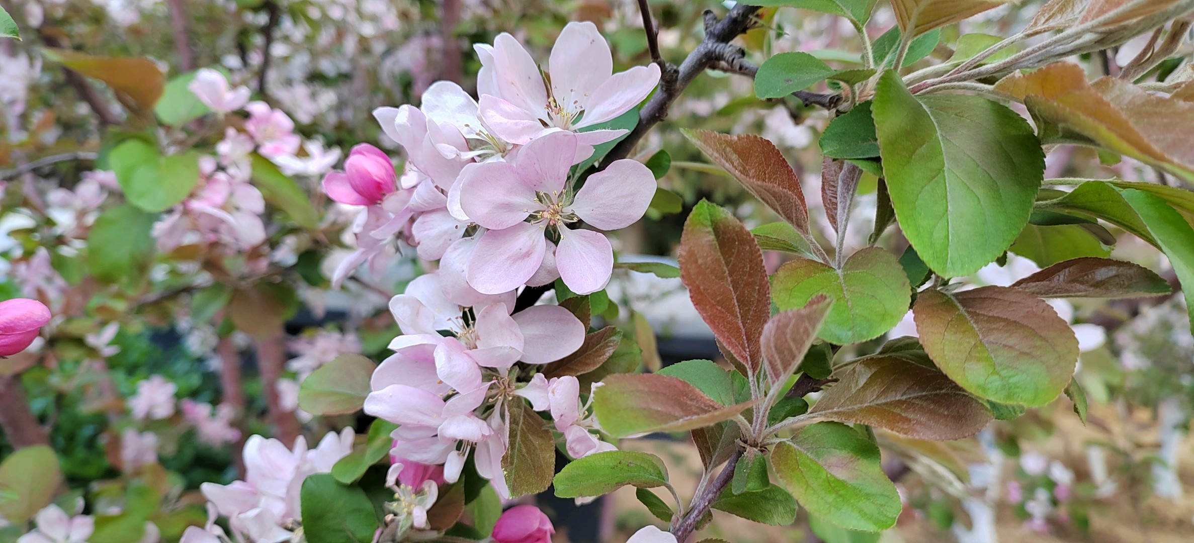 绚丽海棠是蔷薇科、苹果属北美海棠的栽培品种。落叶小乔木,树势强,树姿直立,树形圆而紧凑,树干棕红色,皮孔大而多。枝条斜出,小枝紫红色,老枝红褐色。嫩叶紫红色,逐渐变为翠绿色;叶卵圆形至椭圆形,先端短尖,基部圆形或宽楔形,边缘具钝锯齿。总状伞形花序,花期4月中下旬,花蕾深紫红,花深粉红色,杯状,花开繁密而艳丽,花梗紫红色,密被柔毛,半直立。果期6-10月,果锥形,橘黄或枯红色,果顶尖,萼片宿存直立,挂果期可长达数月。