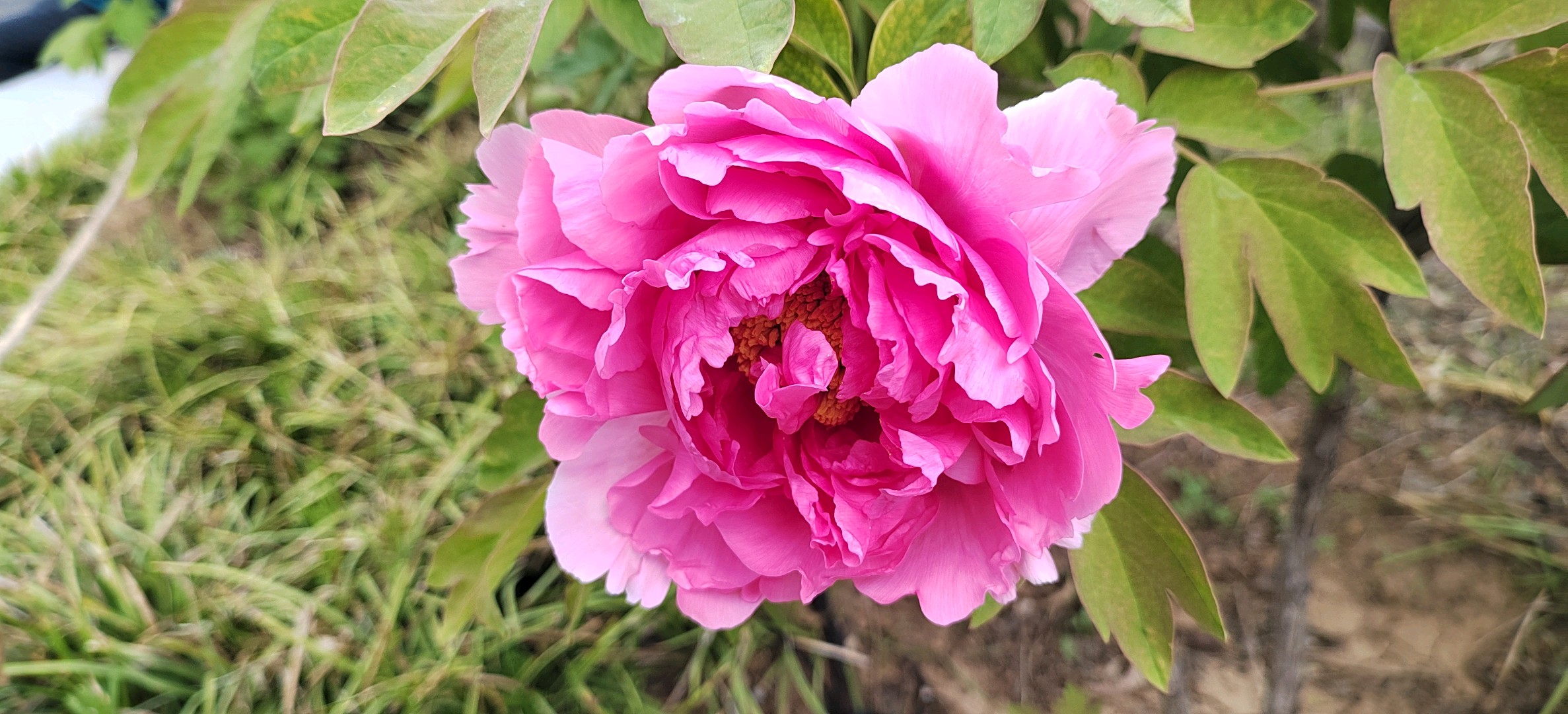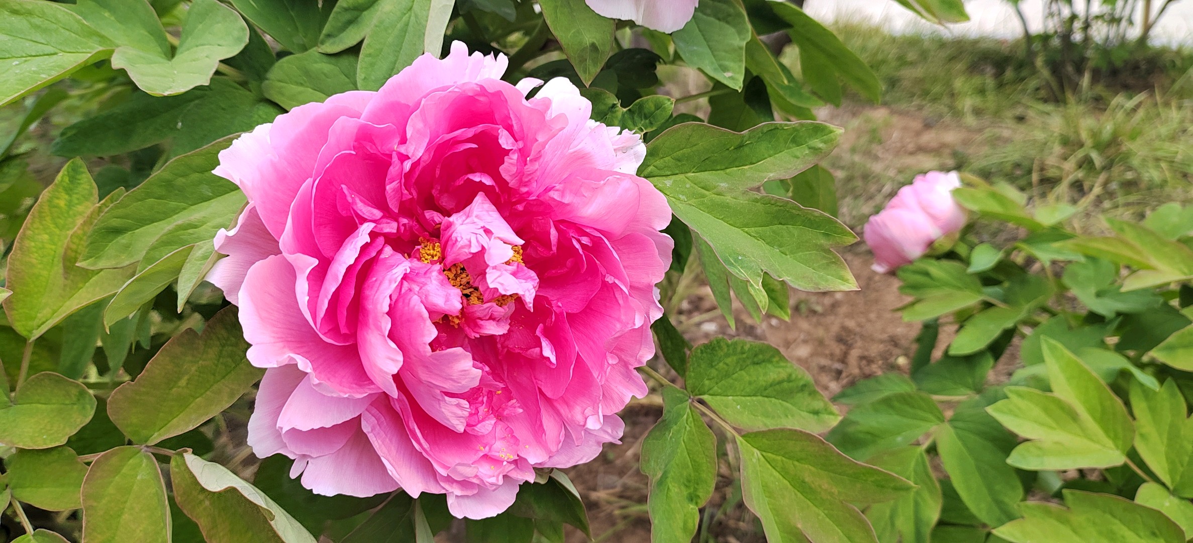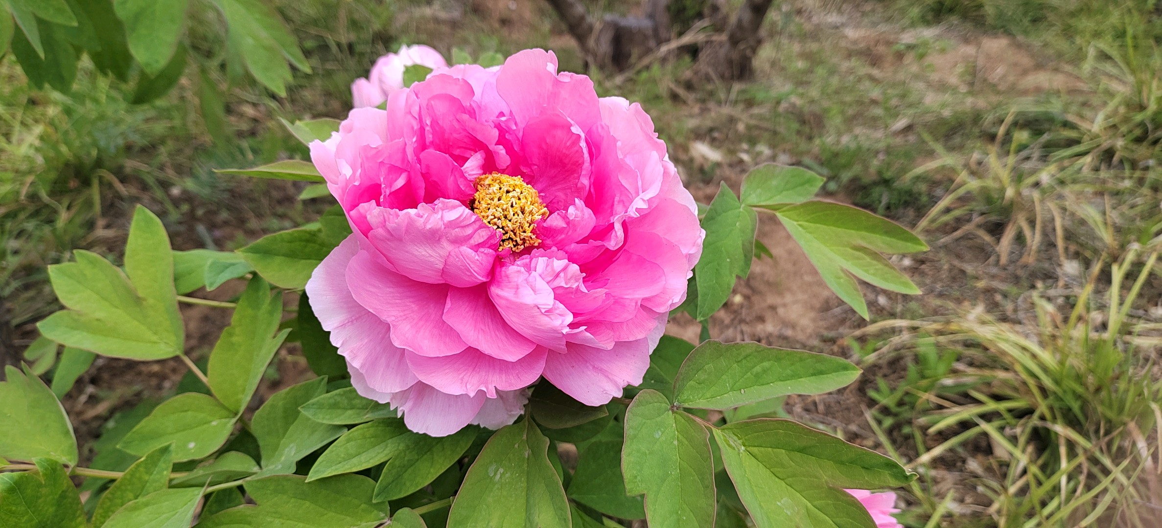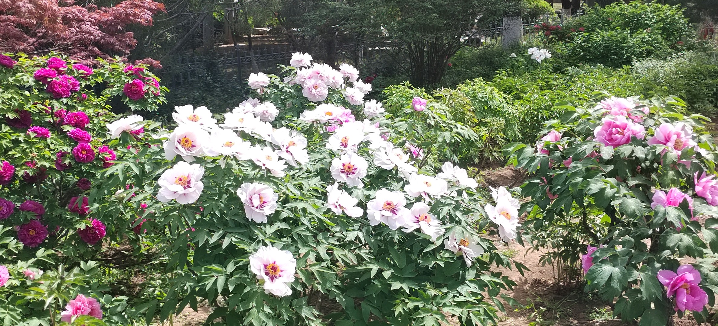 牡丹是芍药科、芍药属多年生落叶灌木,茎高达2米;分枝短而粗。叶通常为二回三出复叶,表面绿色,无毛,背面淡绿色,有时具白粉,叶柄长5-11厘米,和叶轴均无毛。花单生枝顶,苞片5,长椭圆形;萼片5,绿色,宽卵形,花瓣5或为重瓣,玫瑰色、红紫色、粉红色至白色,通常变异很大,倒卵形,顶端呈不规则的波状;花药长圆形,长4毫米;花盘革质,杯状,紫红色;心皮5,密生柔毛。蓇葖长圆形,密生黄褐色硬毛。花期5月;果期6月。花色泽艳丽,玉笑珠香,风流潇洒,富丽堂皇,有“花中之王”的美誉。