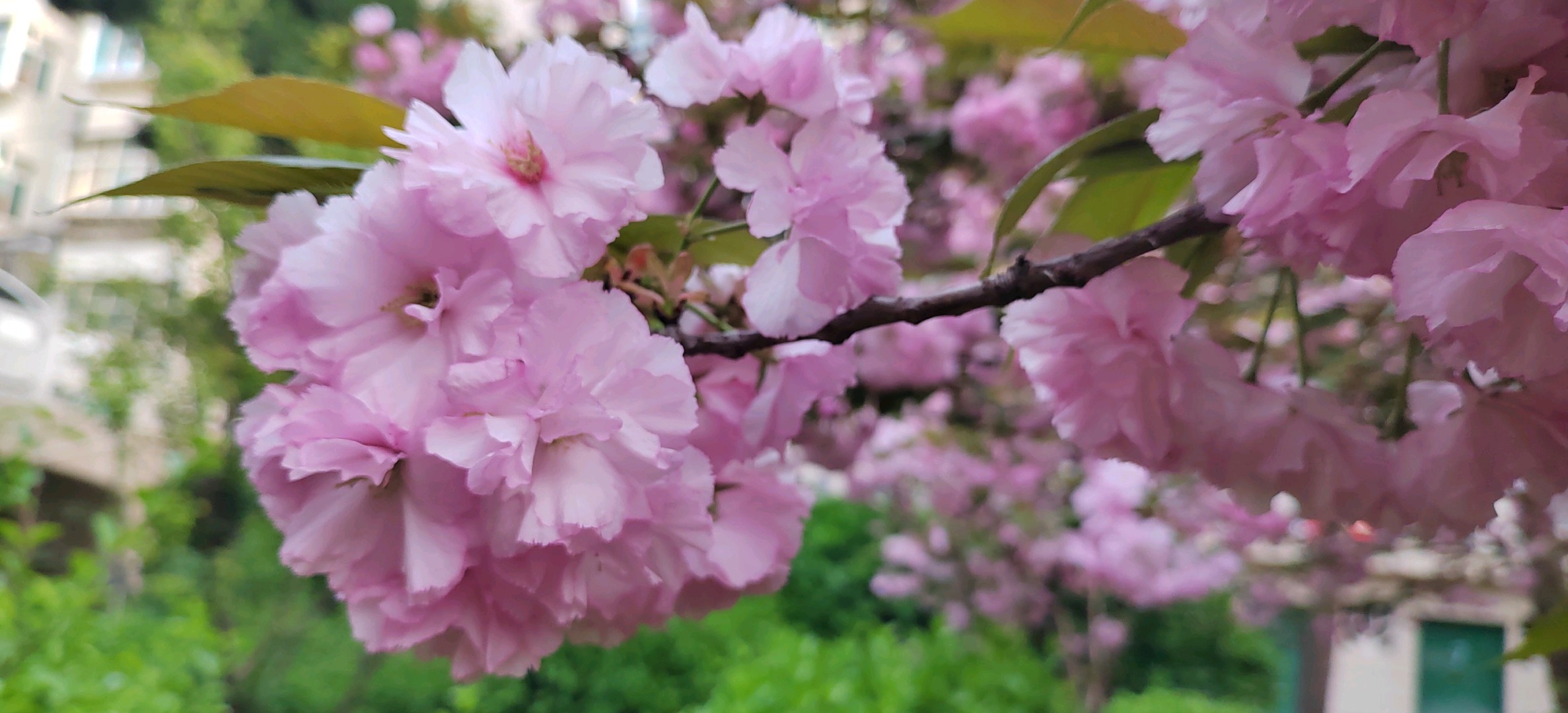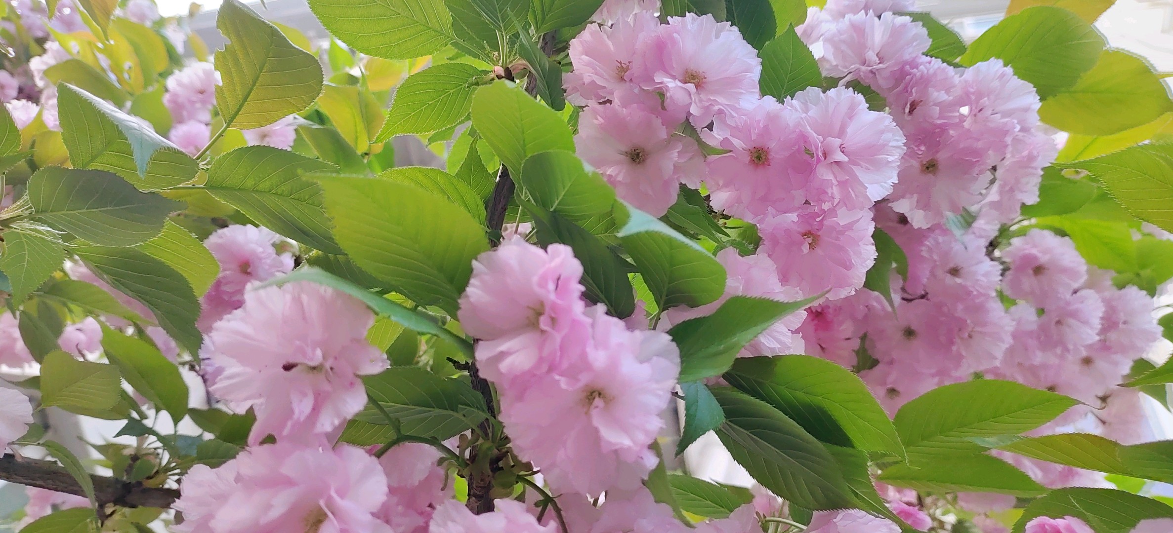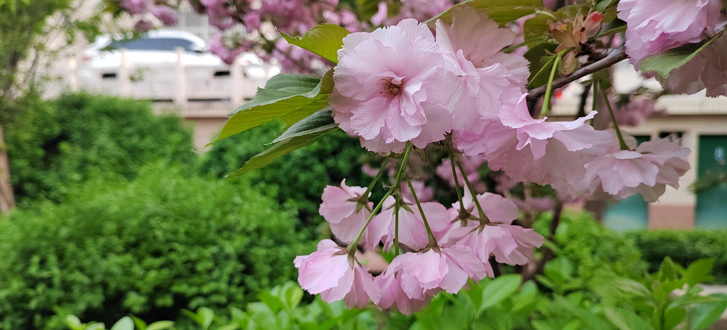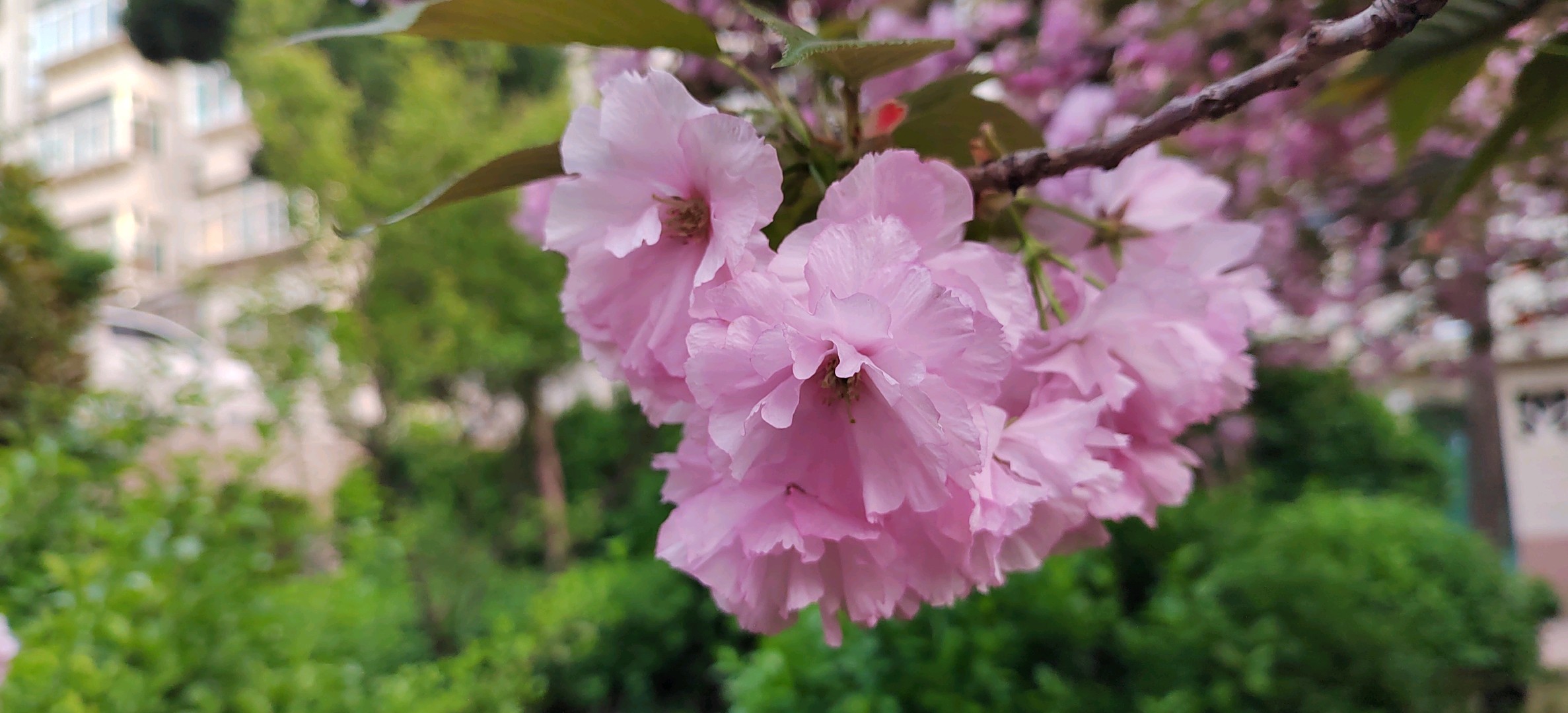晚樱是蔷薇科李属的落叶乔木植物。小枝粗壮无毛;叶片倒卵形或椭圆形,先端长尾状渐尖,边缘有长芒状重锯齿;花总梗短,有时无总梗,伞房花序,花瓣先端凹形,粉红色或近白色;果卵形成熟时黑色有光泽;花期4月;果期5~6月。