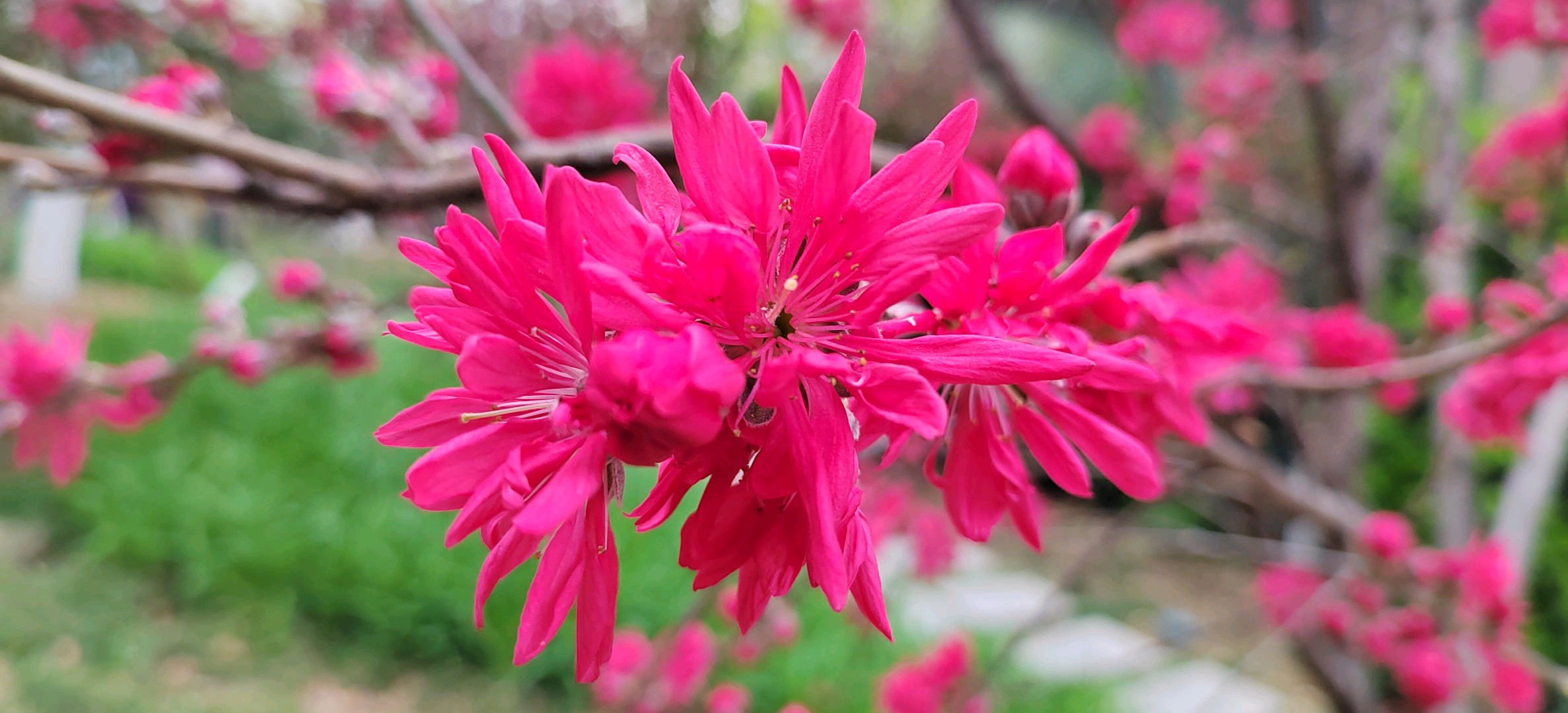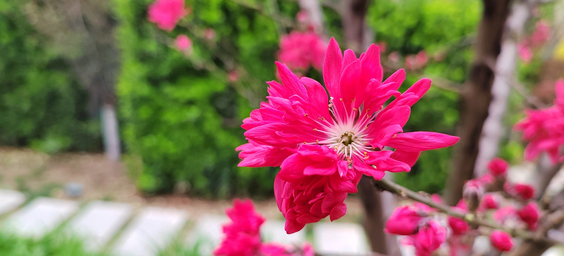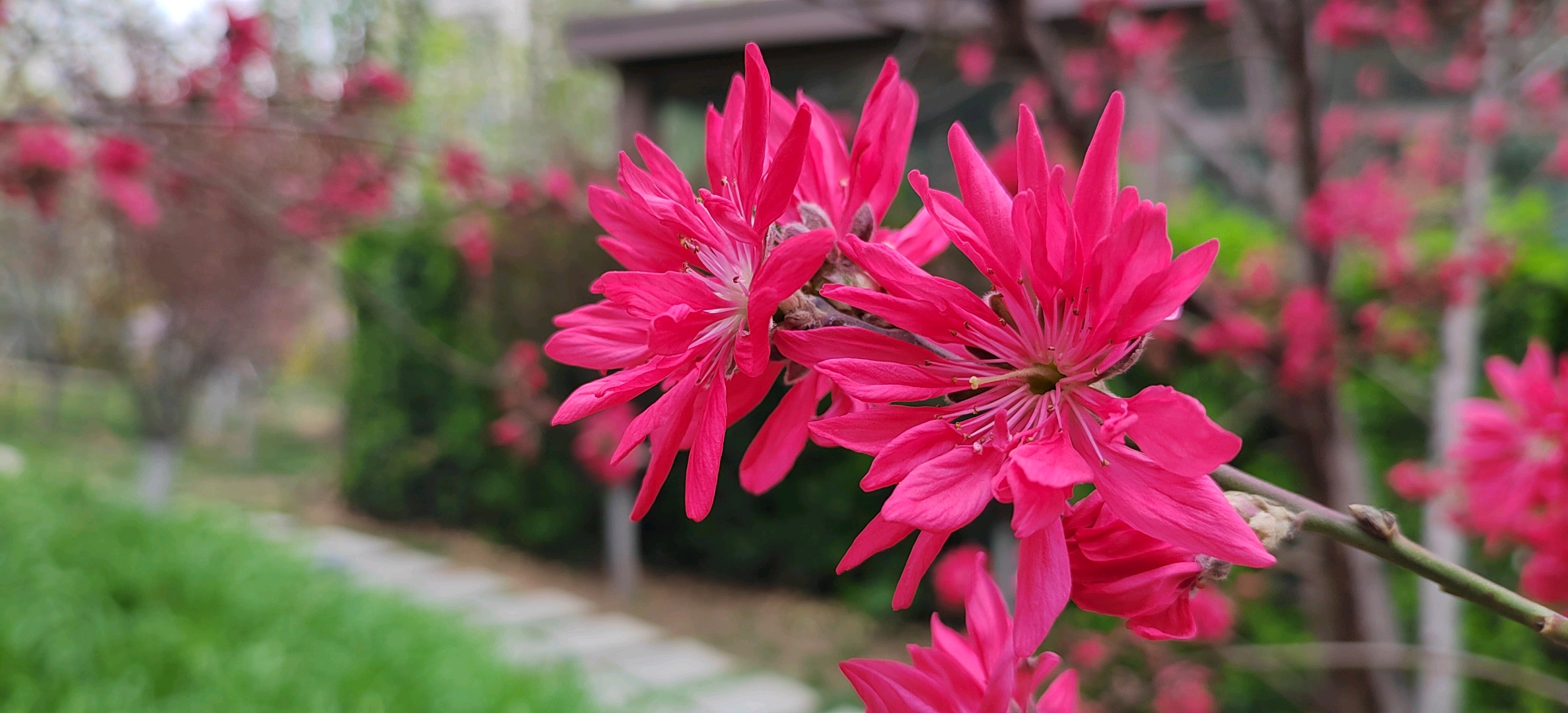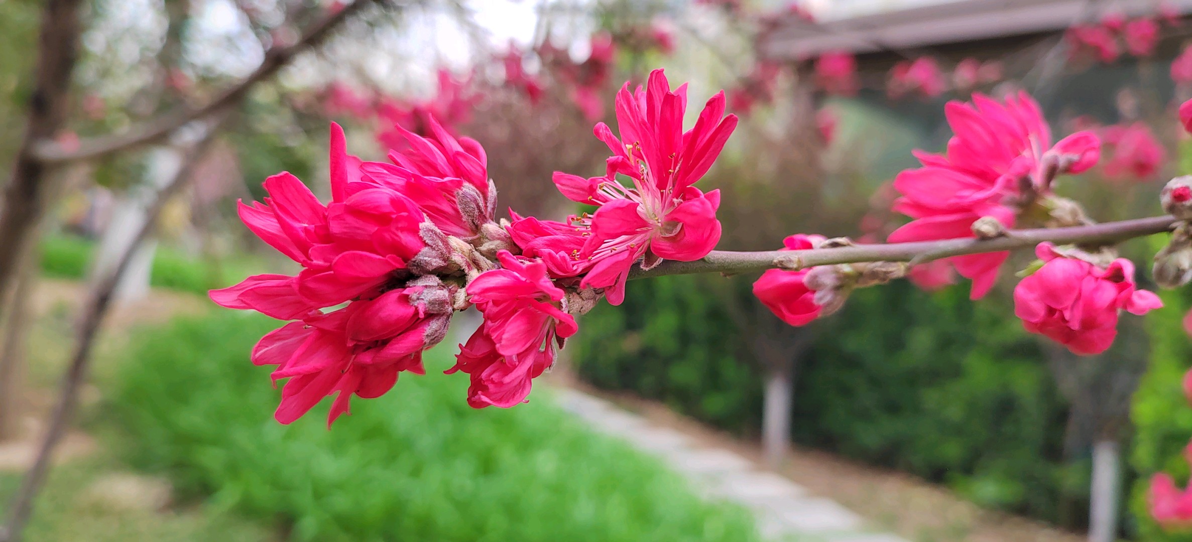菊花碧桃是落叶小乔木。枝红褐色,有亮光,芽密被灰色绒毛,叶椭圆状披针形,花单生,花红色。花期4月,果熟期在7~8月。因花瓣似菊花而得名。