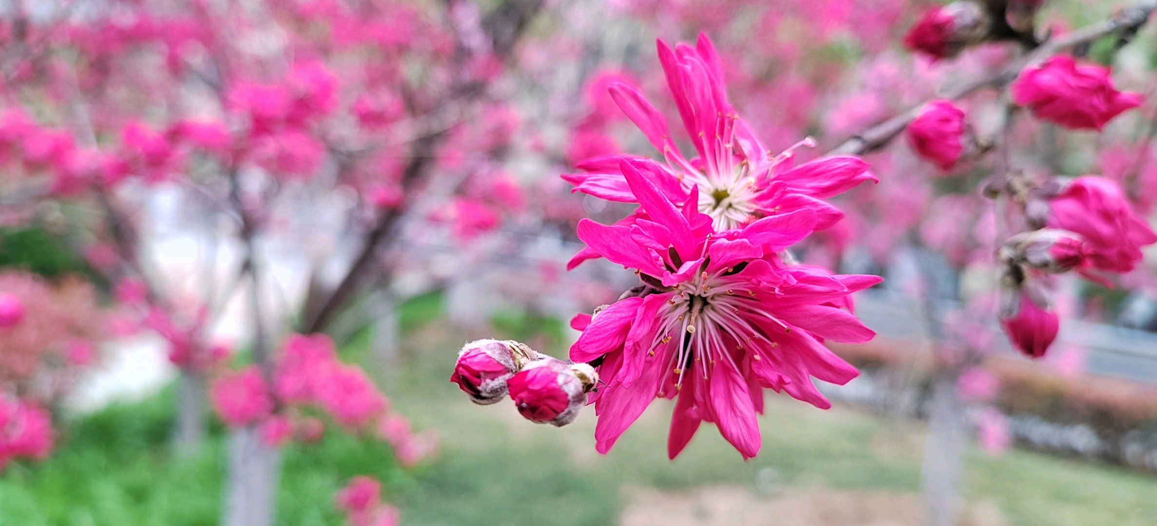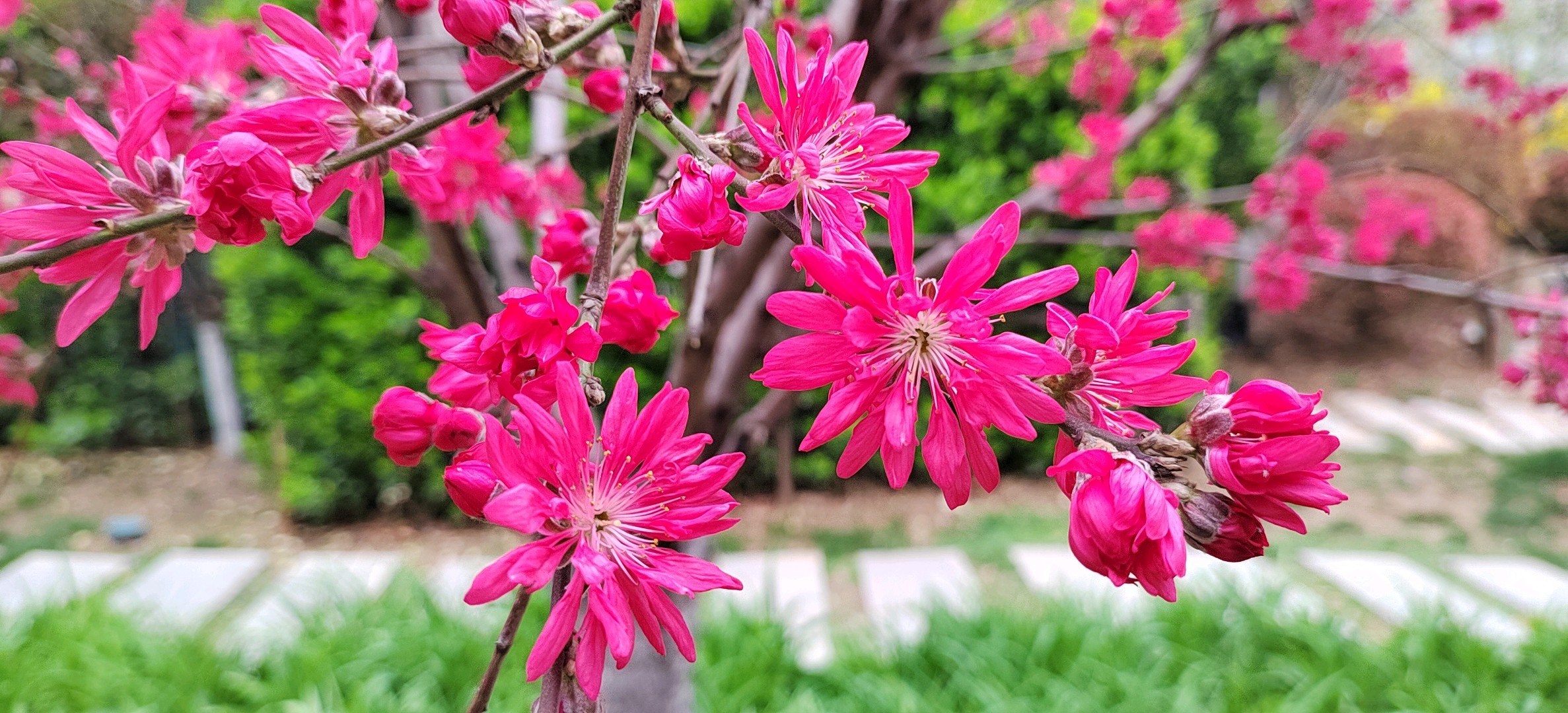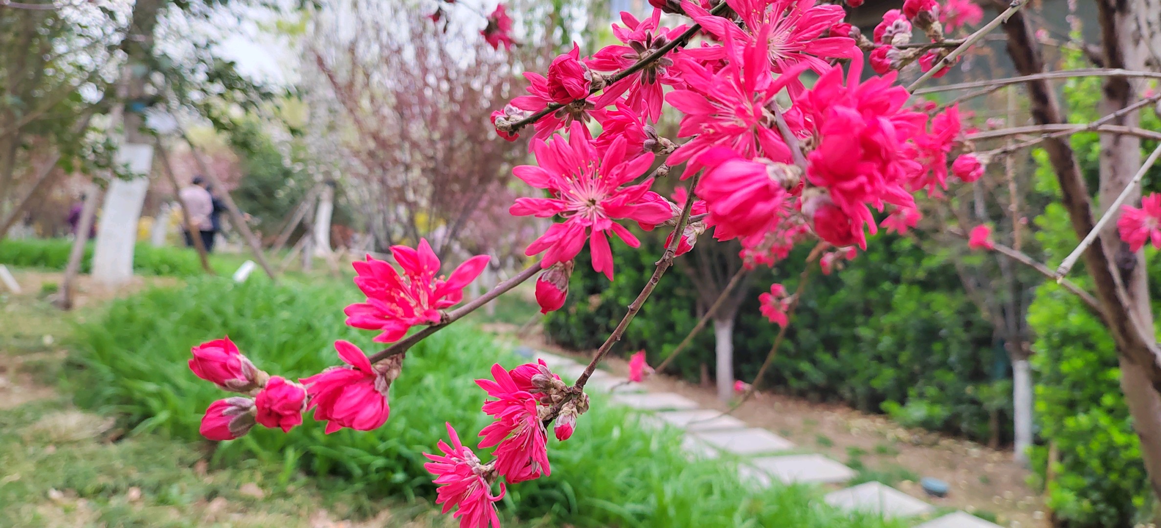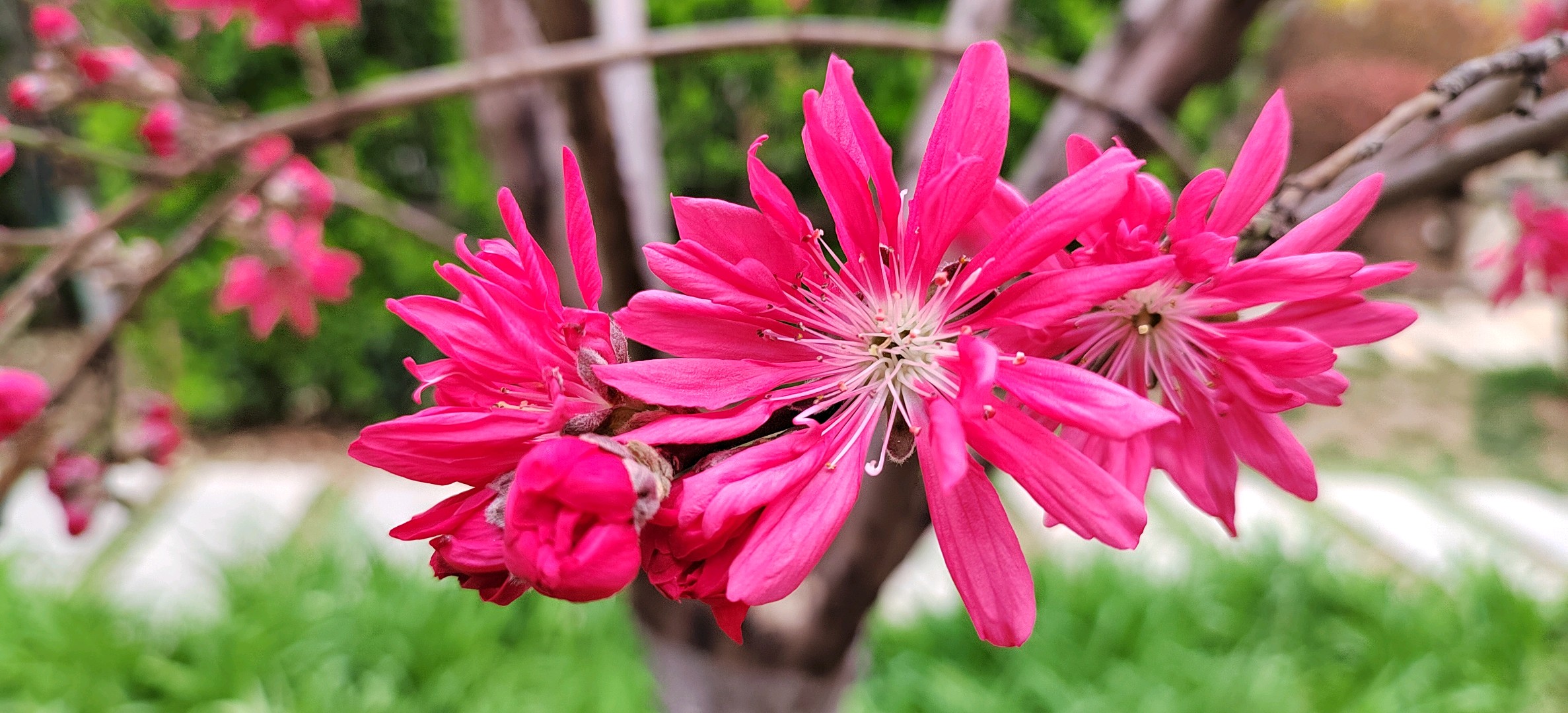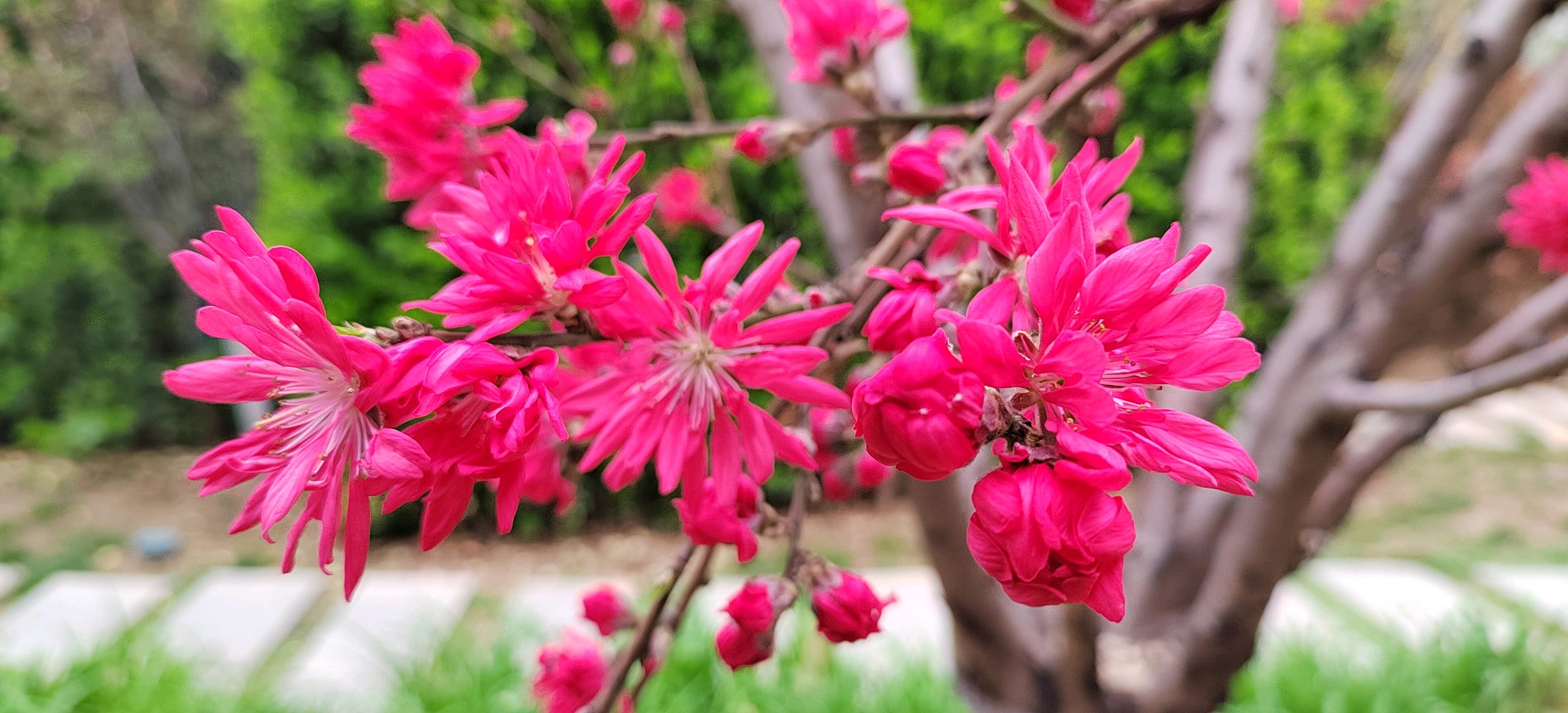 菊花碧桃是落叶小乔木。枝红褐色,有亮光,芽密被灰色绒毛,叶椭圆状披针形,花单生,花红色。花期4月,果熟期在7~8月。因花瓣似菊花而得名。
