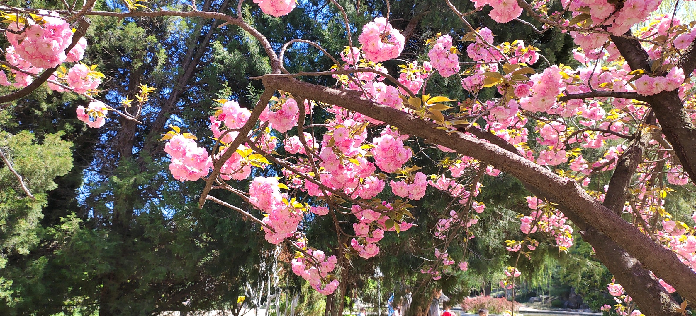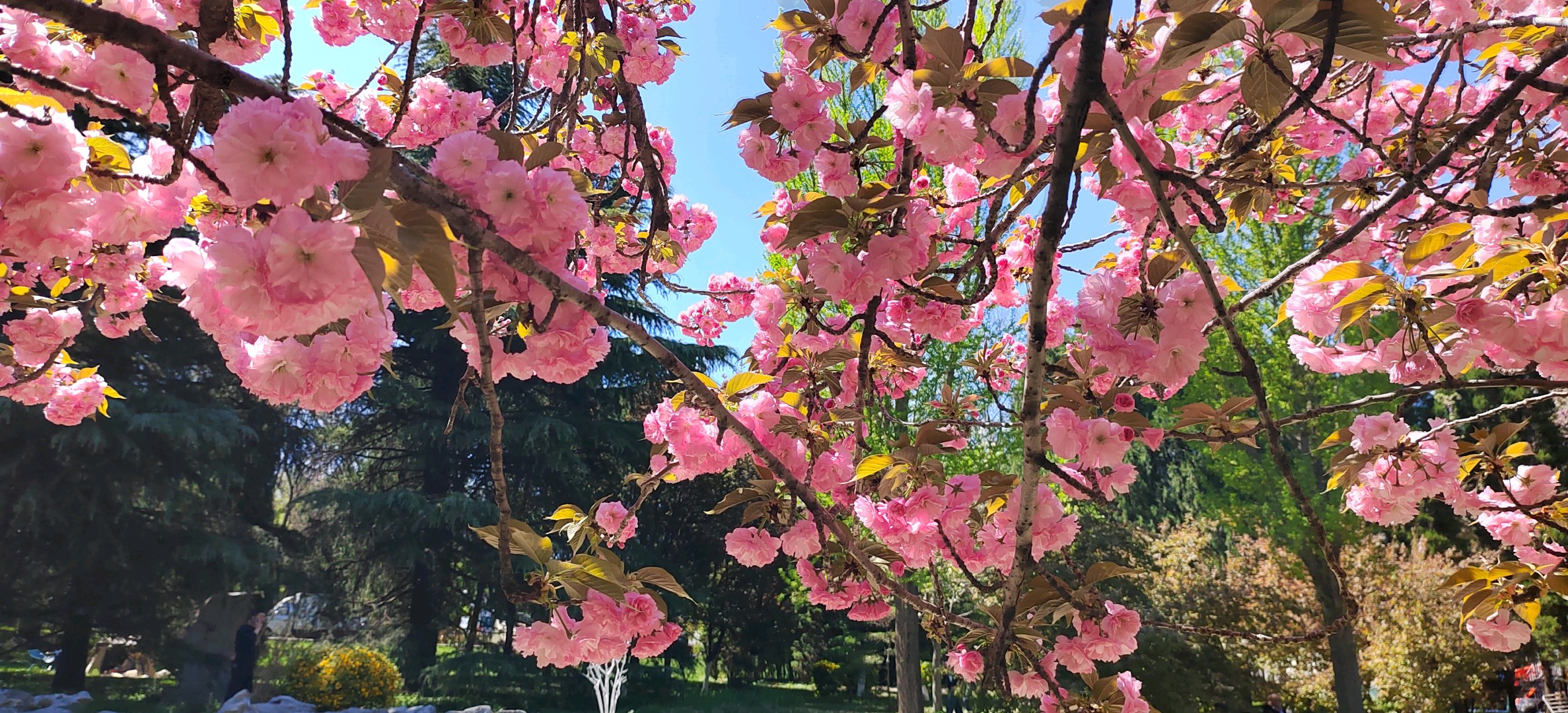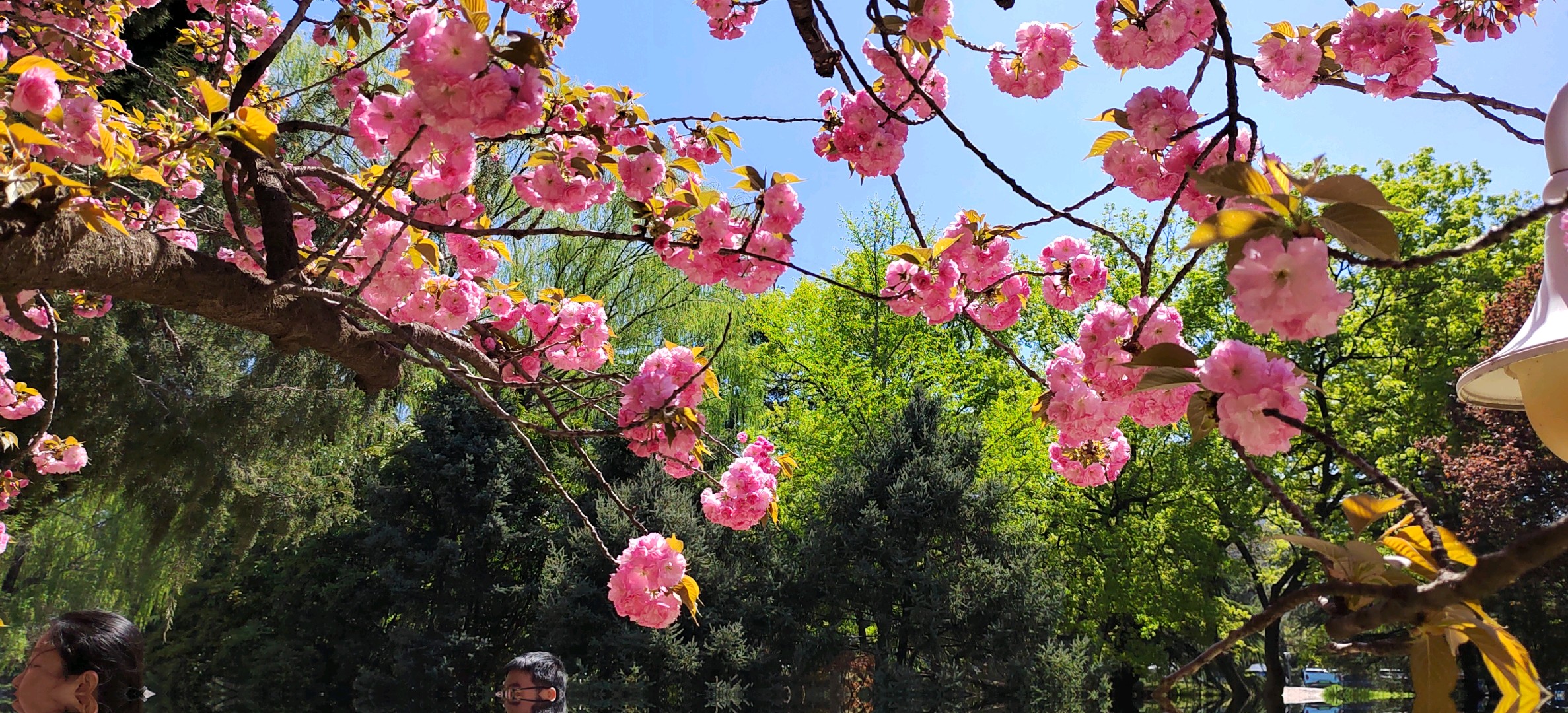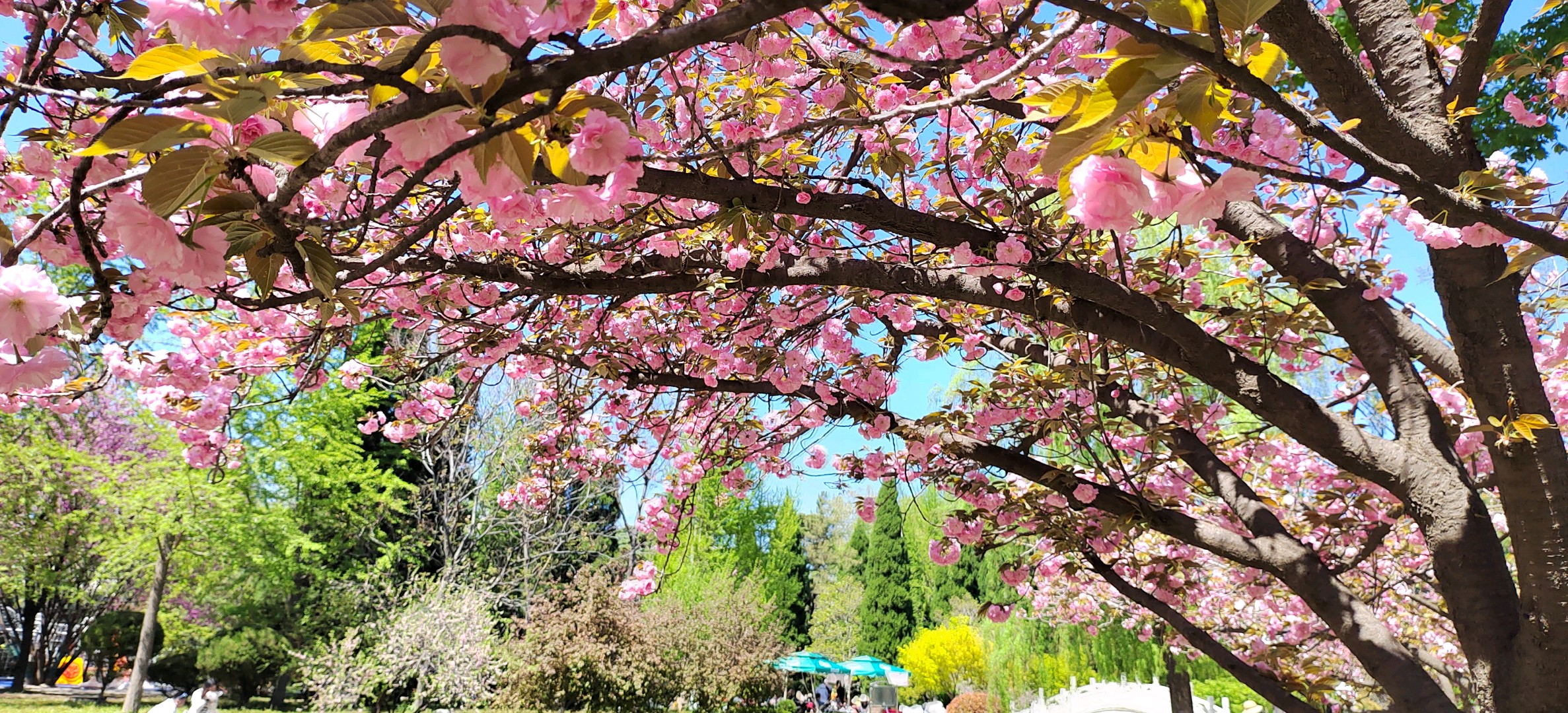 晚樱是蔷薇科李属的落叶乔木植物。小枝粗壮无毛;叶片倒卵形或椭圆形,先端长尾状渐尖,边缘有长芒状重锯齿;花总梗短,有时无总梗,伞房花序,花瓣先端凹形,粉红色或近白色;果卵形成熟时黑色有光泽;花期4月;果期5~6月。